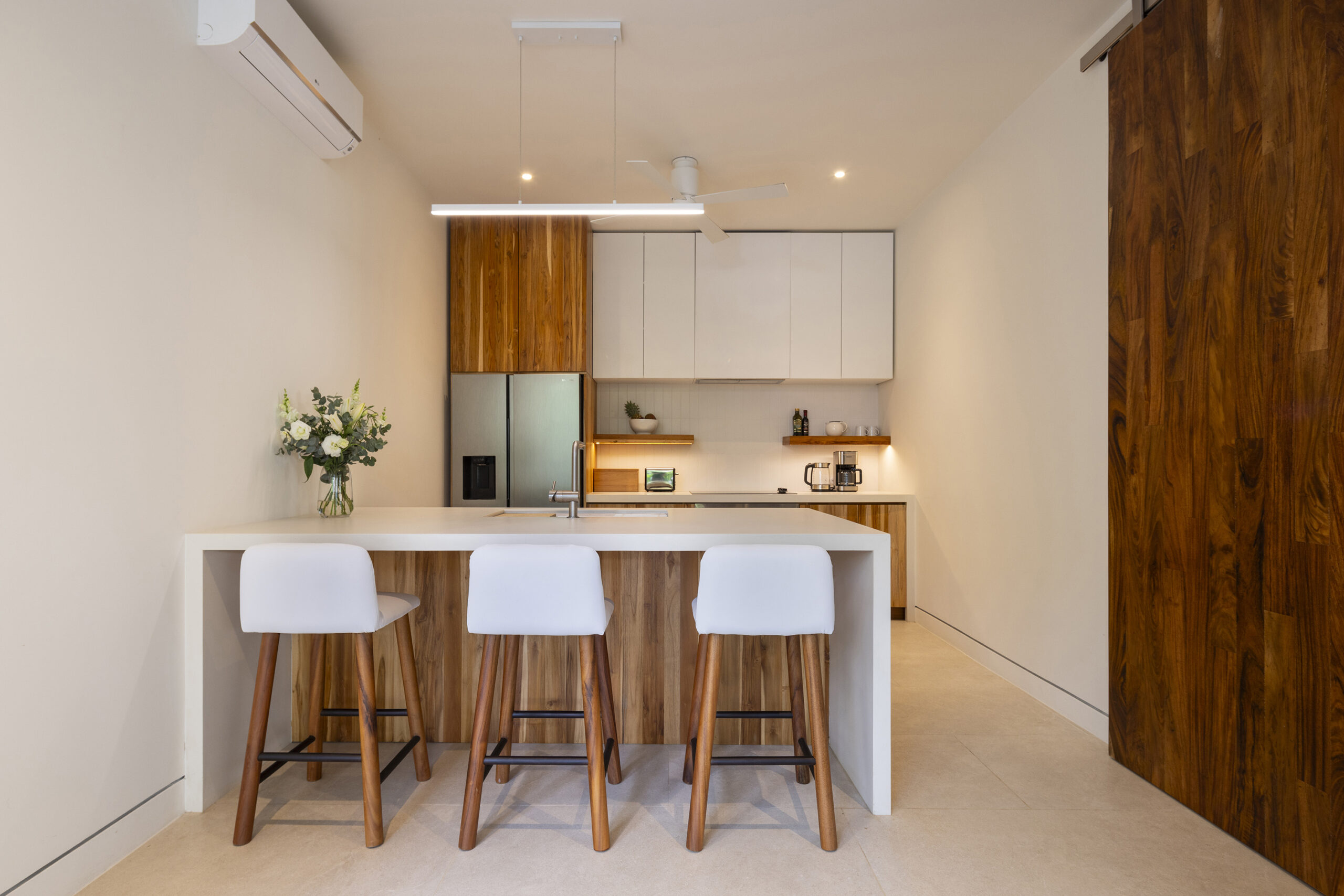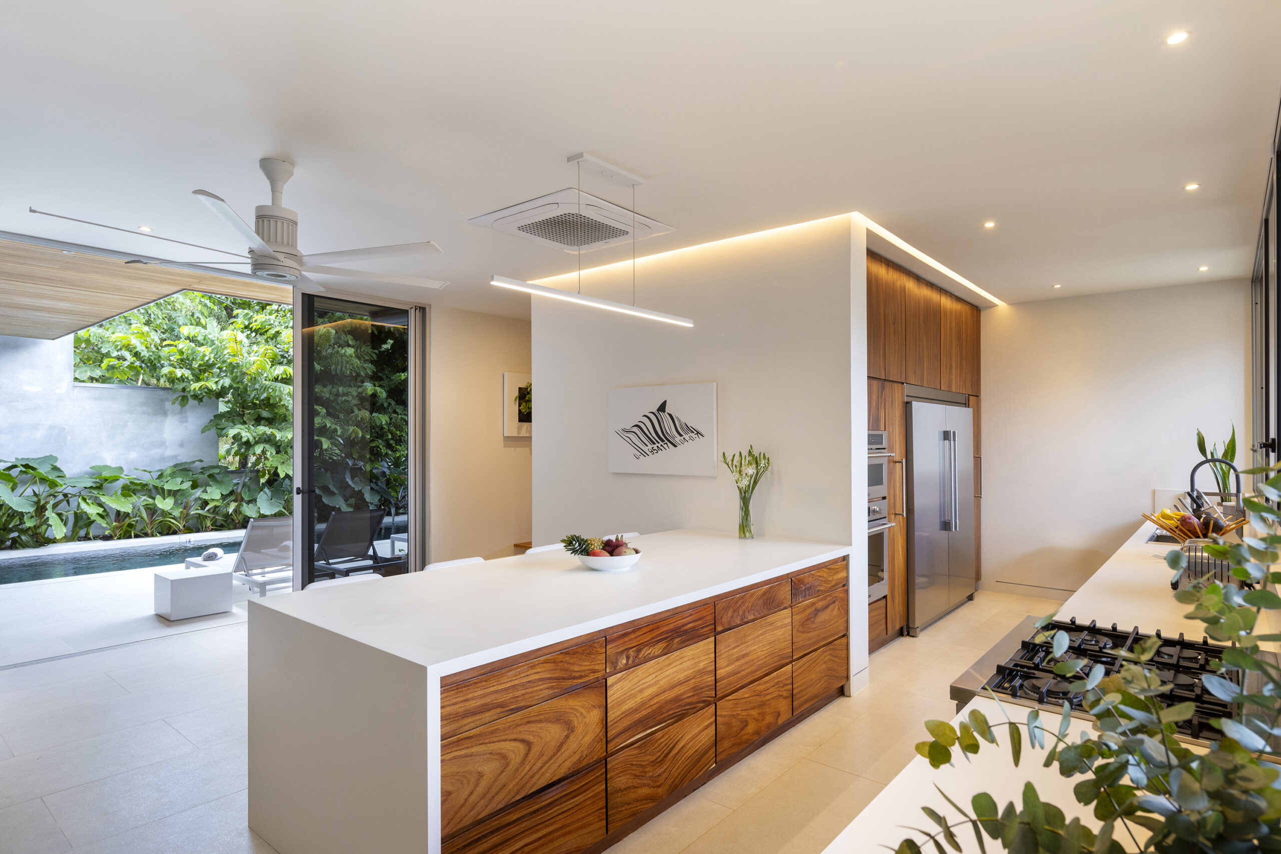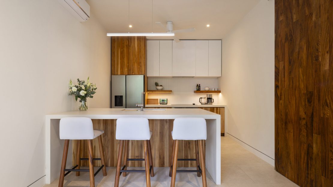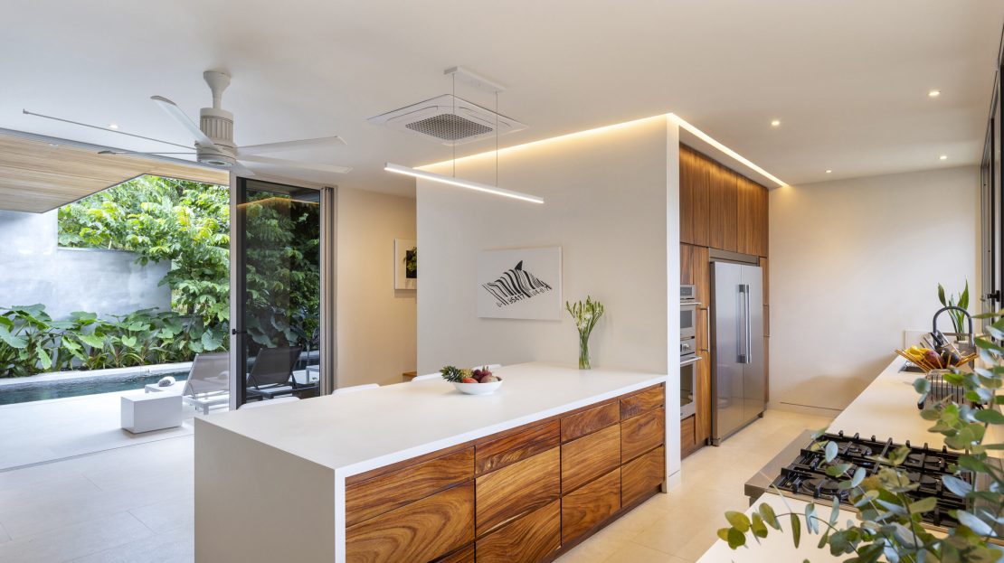 Chef’s Kitchen: High-end finishes and custom Guanacaste wood cabinetry throughout.