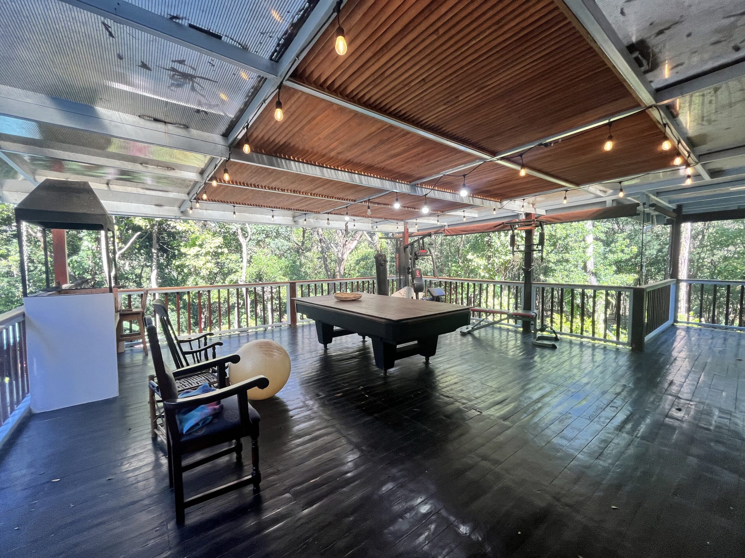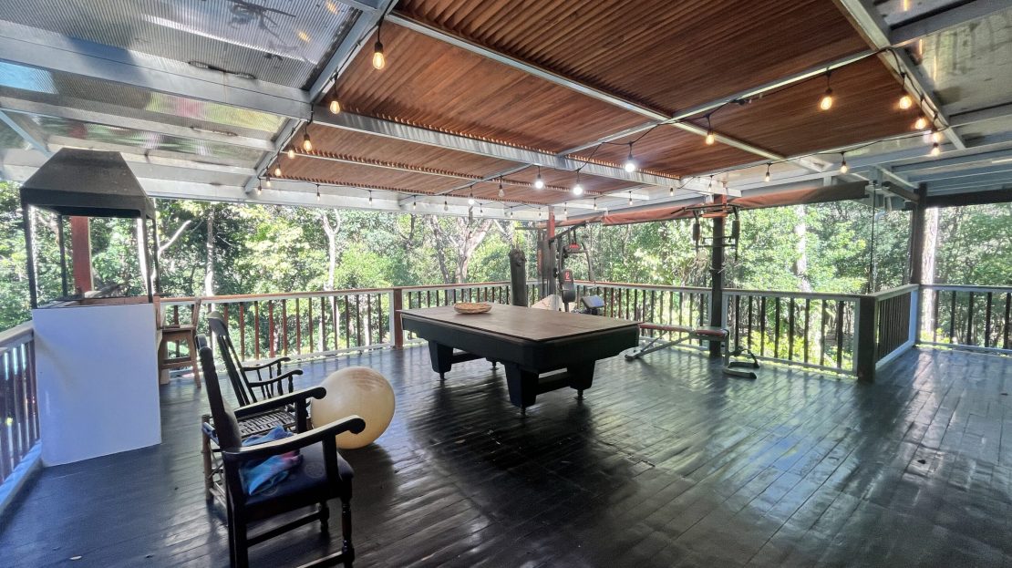 The upper level features a bright and inviting open-concept living space with a kitchen, living room, and large sliding glass doors opening onto a spacious wooden terrace. The terrace overlooks the lush jungle and is perfect for entertaining, with a barbecue area and a large outdoor dining table for memorable moments with family and friends. A bedroom with an en-suite bathroom is also located on this level.