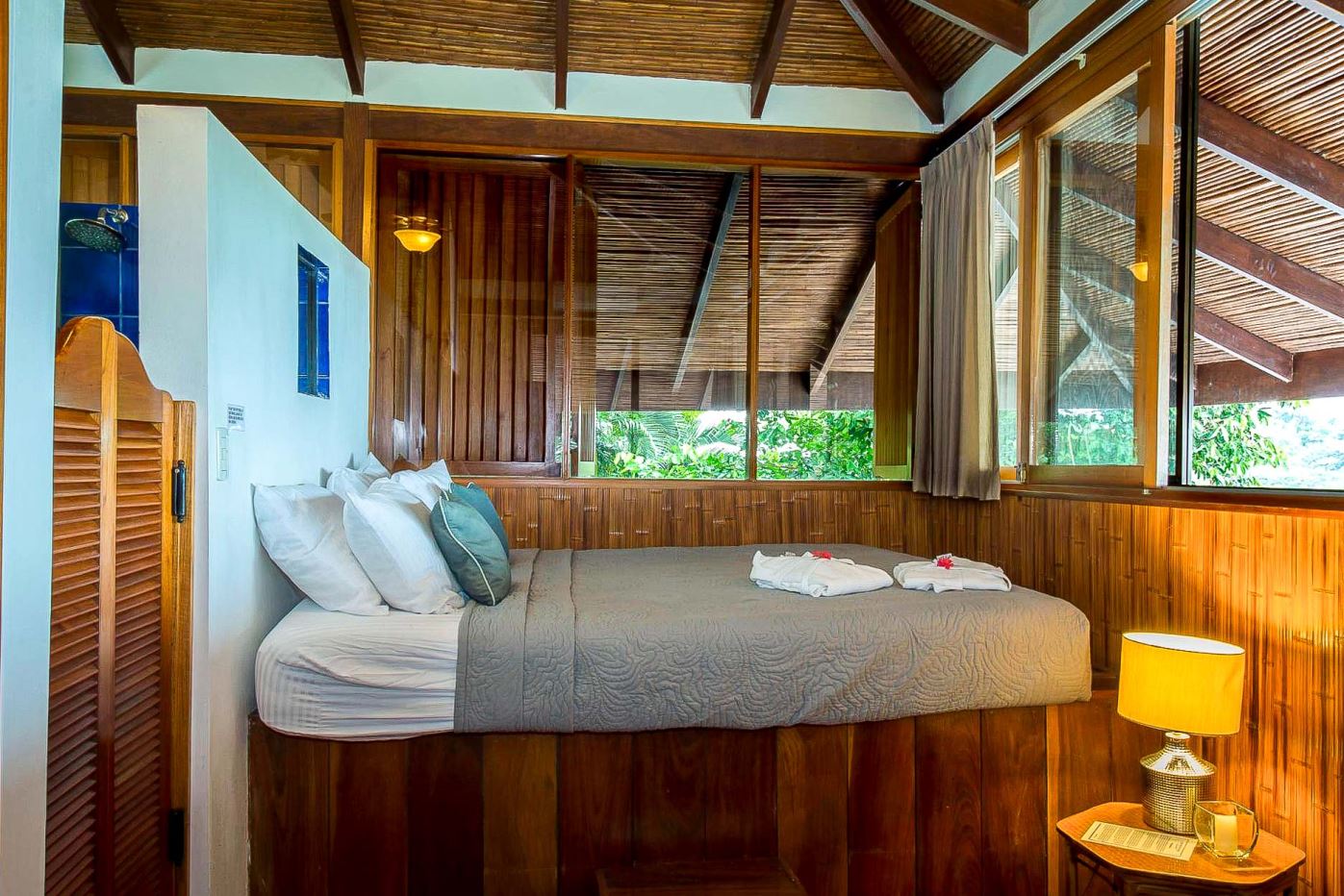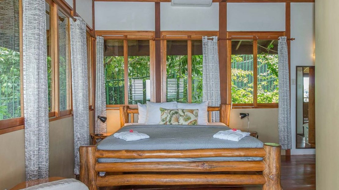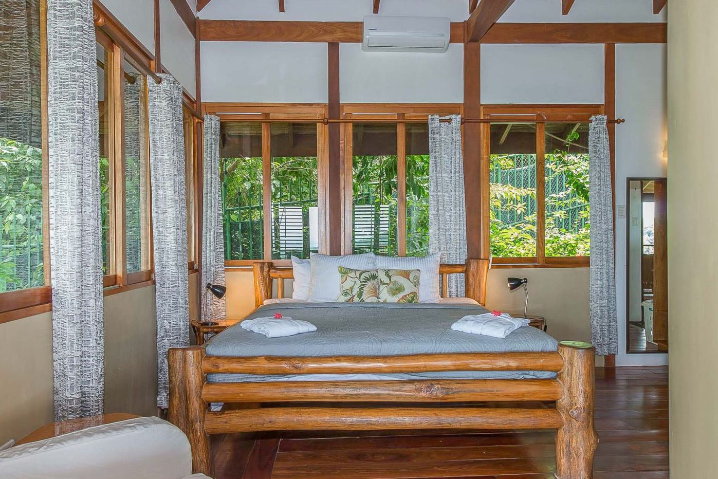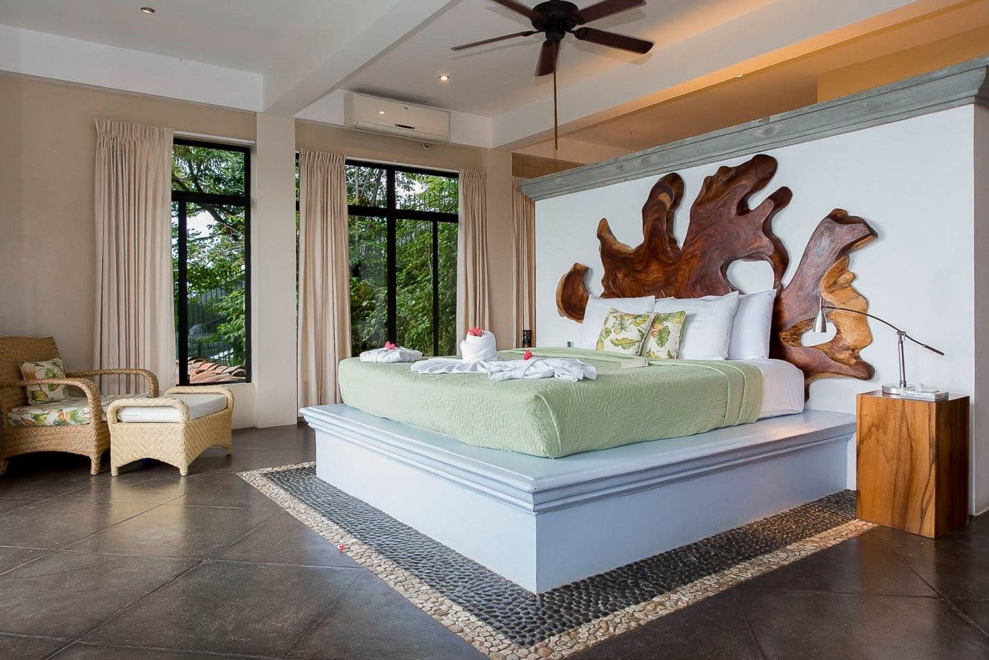 The entrance level greets visitors with a beautifully renovated kitchen and dining area that overlooks the pool and the National Park. This air-conditioned space flows seamlessly onto a spacious outdoor deck, featuring both covered and open areas perfect for soaking in the views and observing the daily wildlife visits. Off the covered terrace are two bedrooms: one with two full beds and another, the Canopy Suite, with a king-sized bed nestled in the jungle canopy. The master bedroom, located one level up, serves as a luxurious retreat with its king-sized bed, a beautifully designed bathroom with a private jacuzzi tub, and custom glazed earthenware sinks.