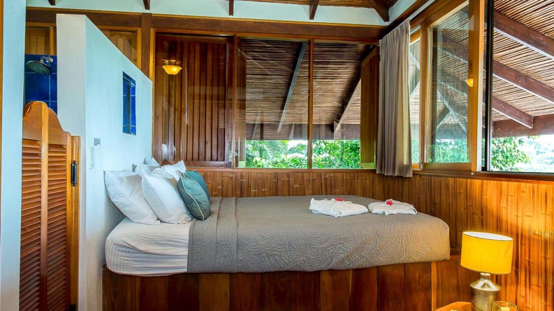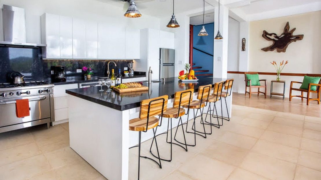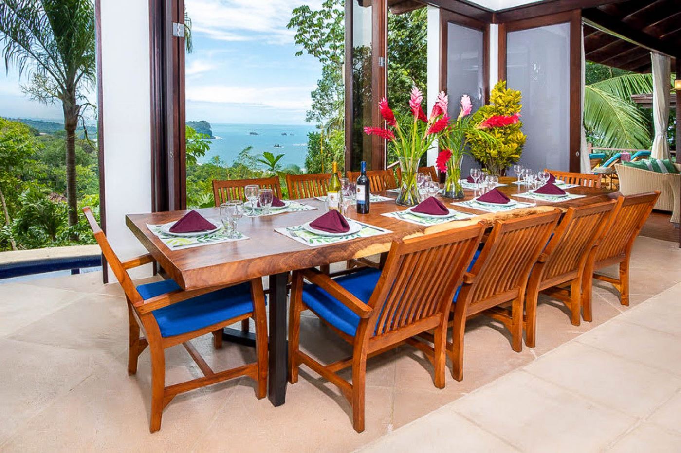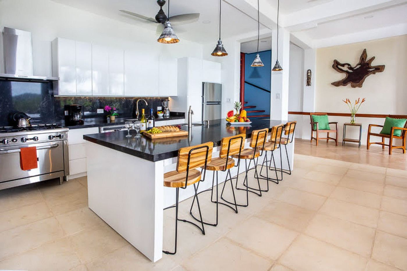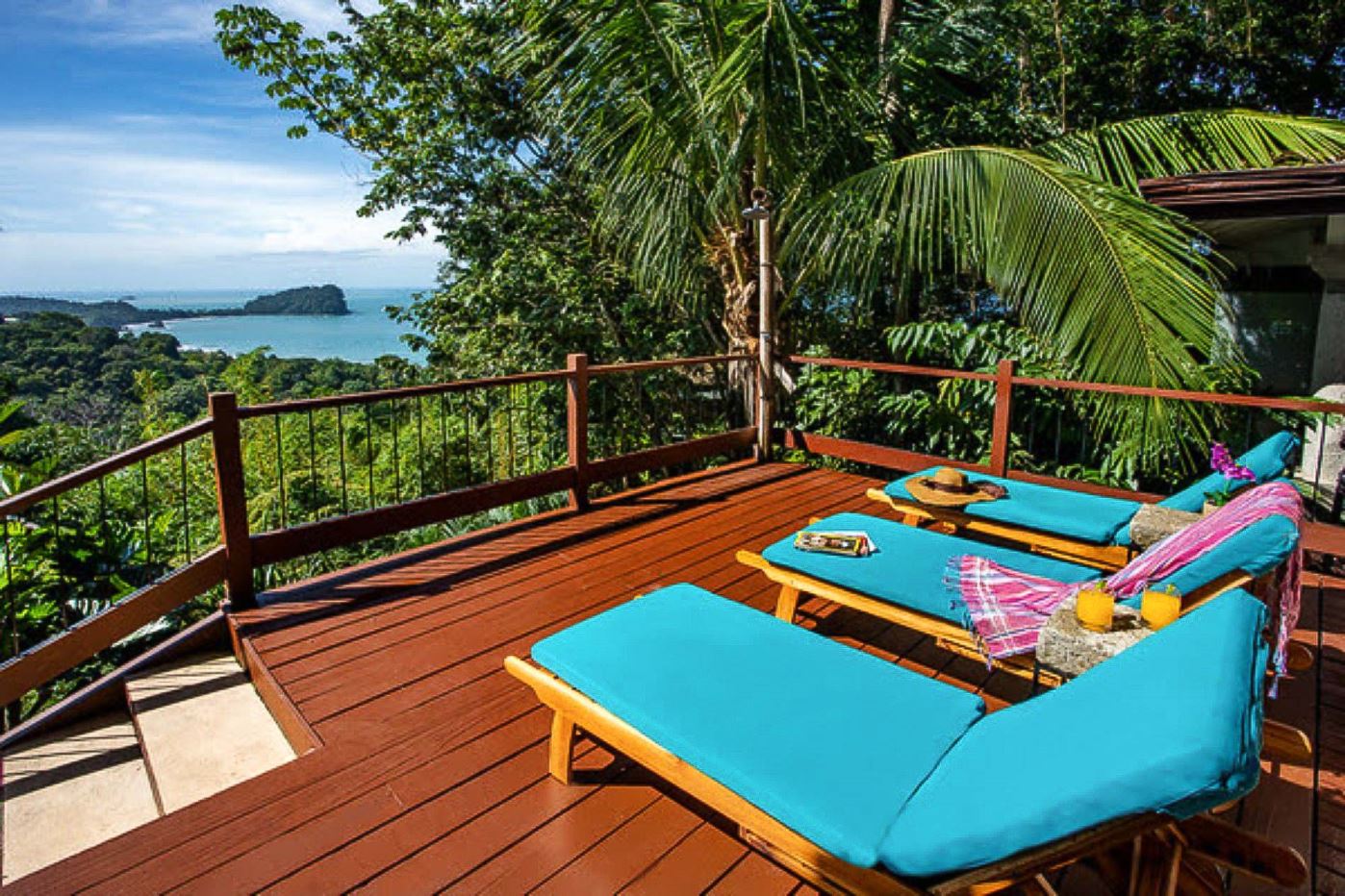 The entrance level greets visitors with a beautifully renovated kitchen and dining area that overlooks the pool and the National Park. This air-conditioned space flows seamlessly onto a spacious outdoor deck, featuring both covered and open areas perfect for soaking in the views and observing the daily wildlife visits. Off the covered terrace are two bedrooms: one with two full beds and another, the Canopy Suite, with a king-sized bed nestled in the jungle canopy. The master bedroom, located one level up, serves as a luxurious retreat with its king-sized bed, a beautifully designed bathroom with a private jacuzzi tub, and custom glazed earthenware sinks.
