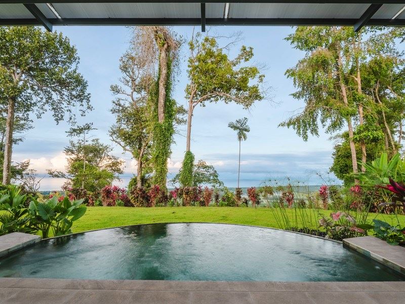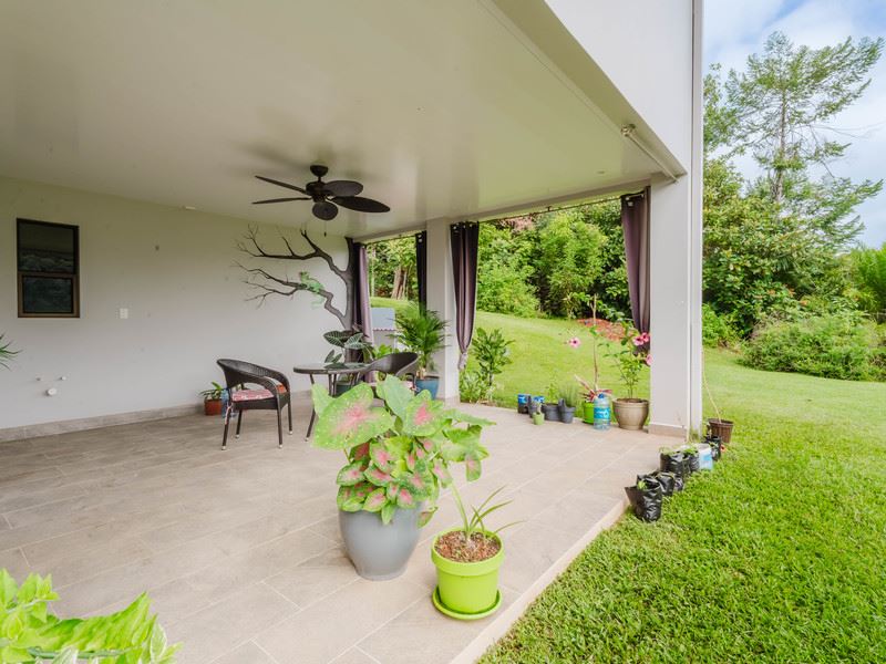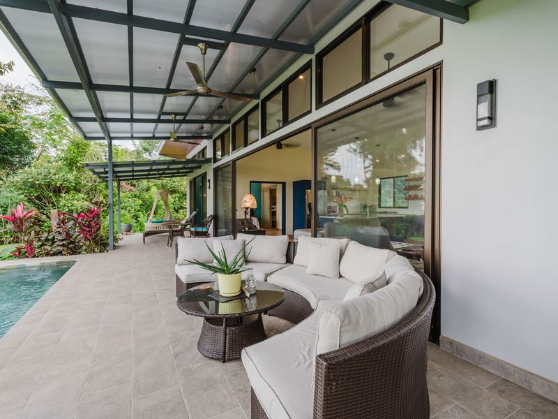 Step outside to the covered terraces that span the length of the house, equipped with fans and lighting for all-day enjoyment. The infinity pool, adorned with hand-cut natural stones from Costa Rica, is both beautiful and unique.