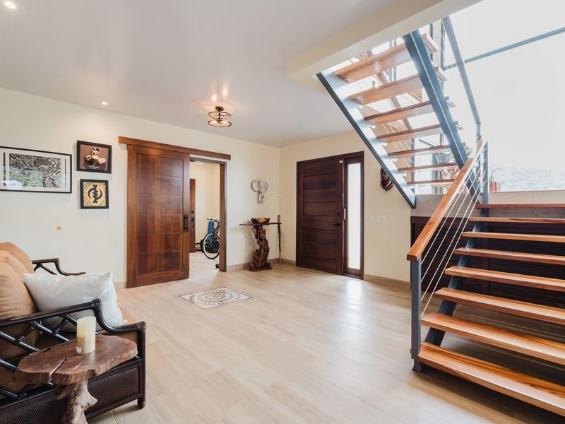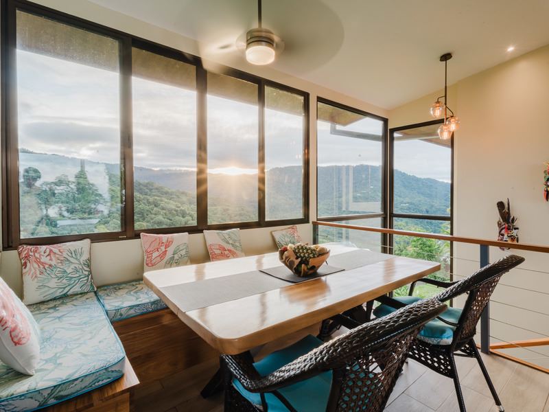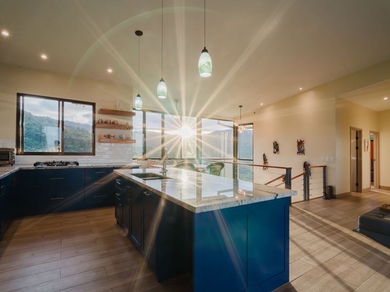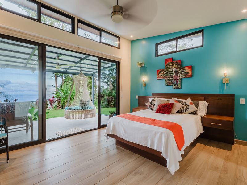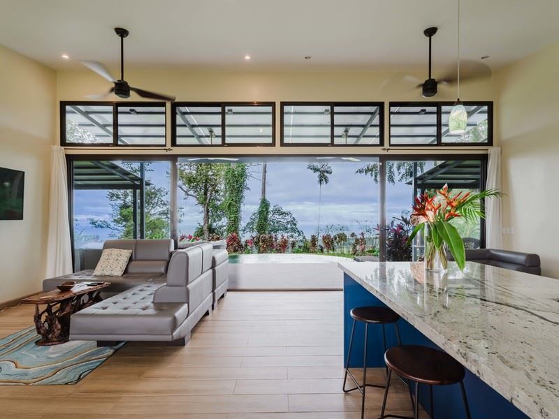 Upon entering through the automatic gate, you’ll be captivated by the awe-inspiring views reminiscent of a National Geographic landscape. Perched 1,000 feet above sea level, the home boasts incredible mountain vistas to the east, perfect for enjoying morning sunrises, and sweeping views of the Pacific Ocean to the west, where mesmerizing sunsets stretch from Manuel Antonio National Park to the famous surf break at Dominical. Completed in 2021, the house was thoughtfully designed to harness the cool mountain breezes that flow through, providing an ideal balance of ventilation and healthy living.