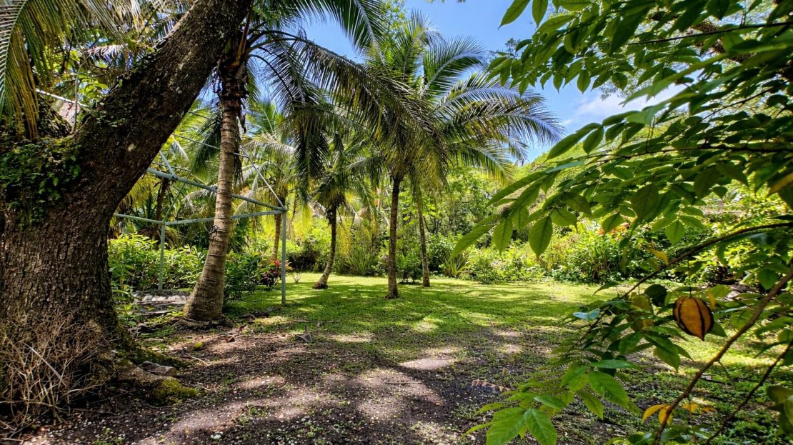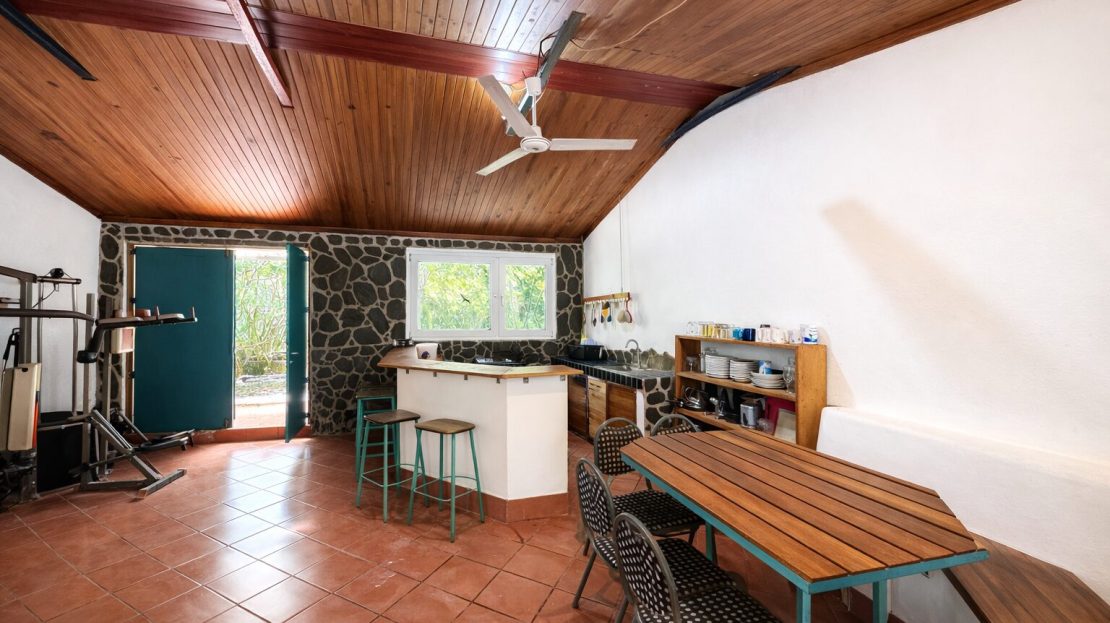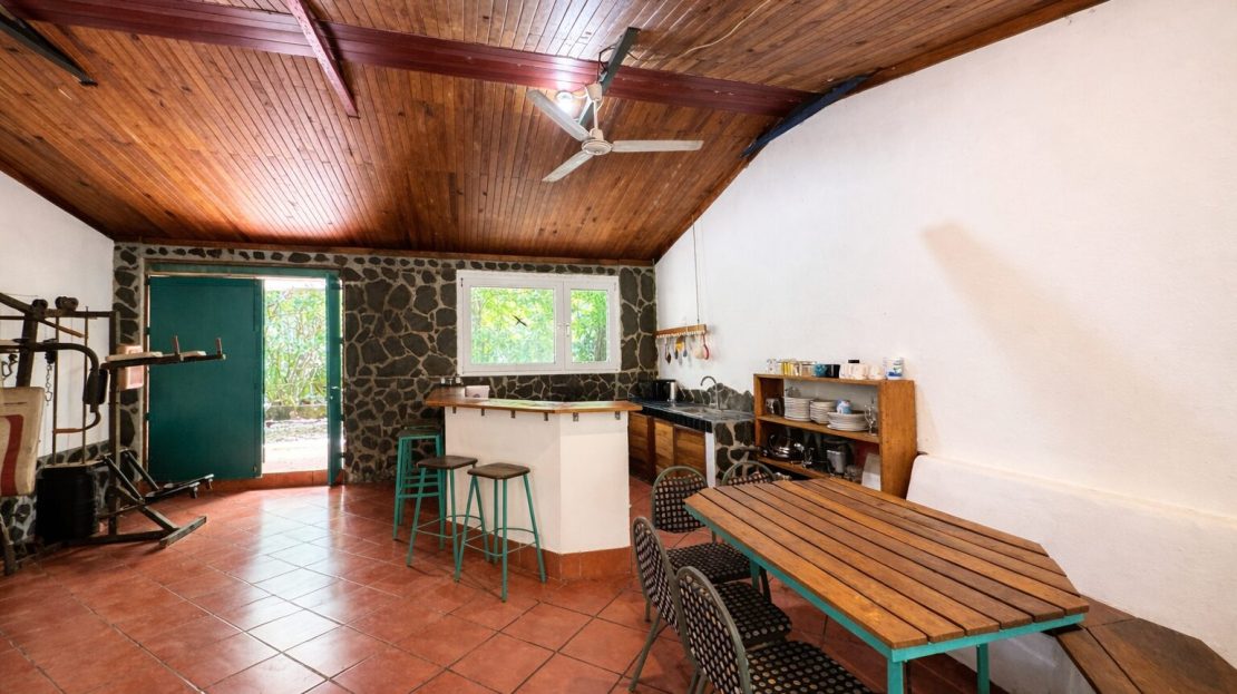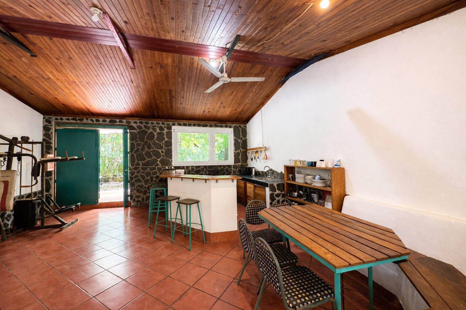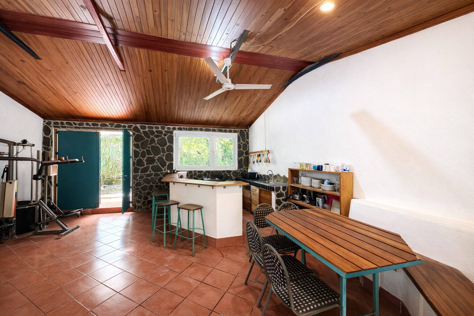 The interior living space includes a functional kitchen and a comfortable living room, perfectly suited for relaxed tropical living.