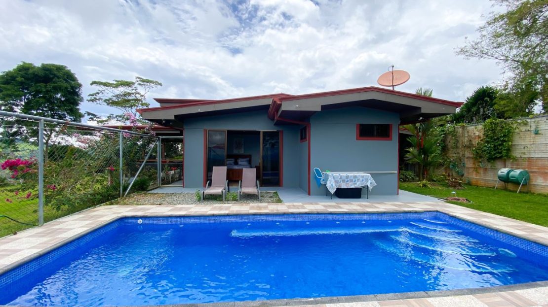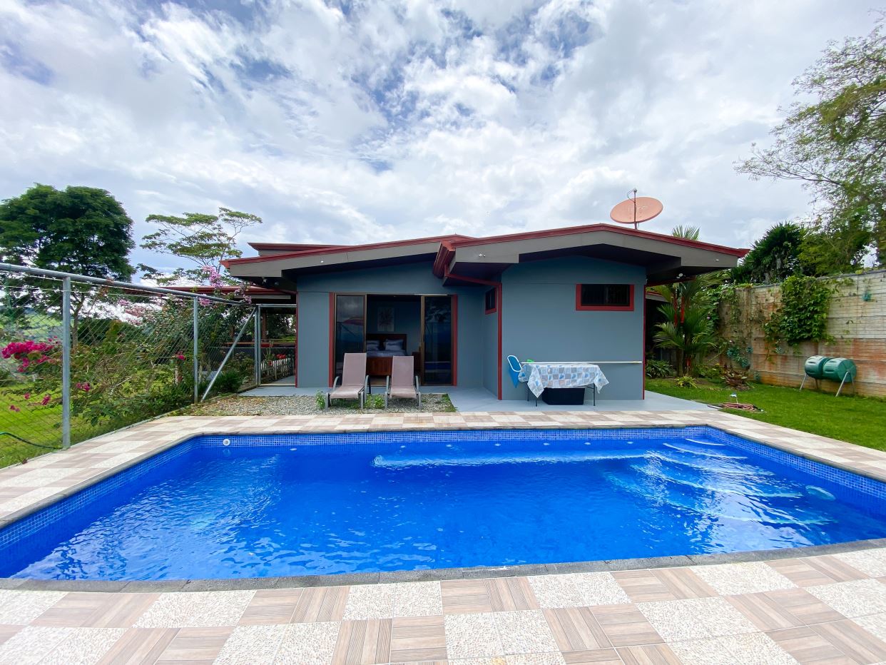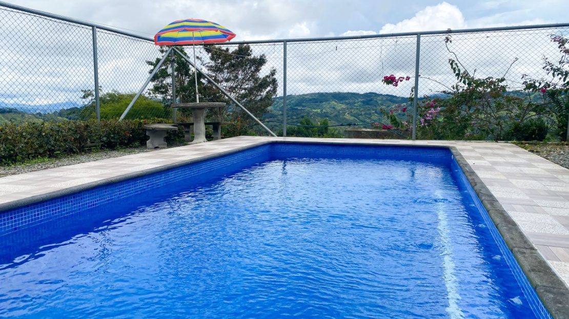 Áreas sociales diseñadas para el descanso: Terraza frontal con vista panorámica, terraza interna trasera y piscina con sistema de sal y bomba, con medio baño.