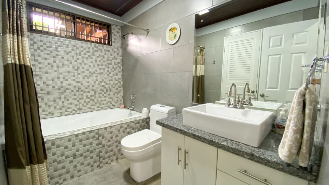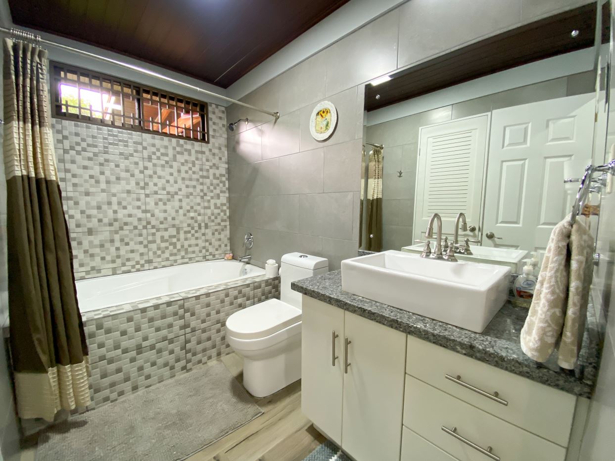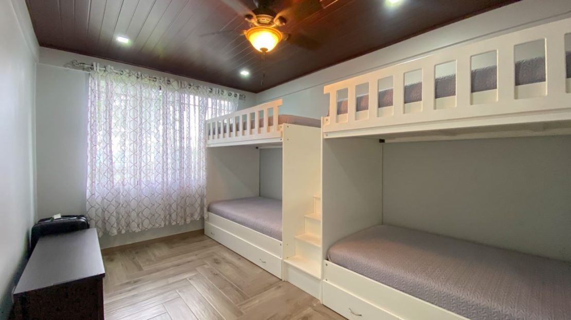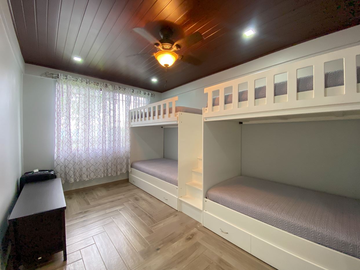 Tres habitaciones secundarias con closet y un baño completo con tina.