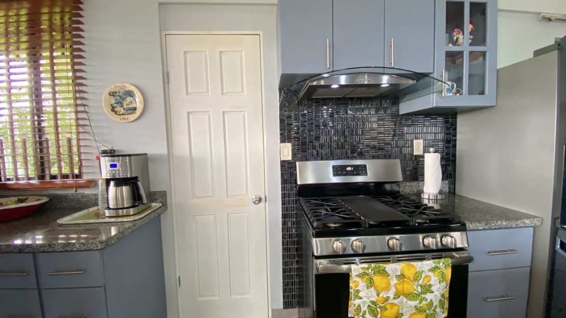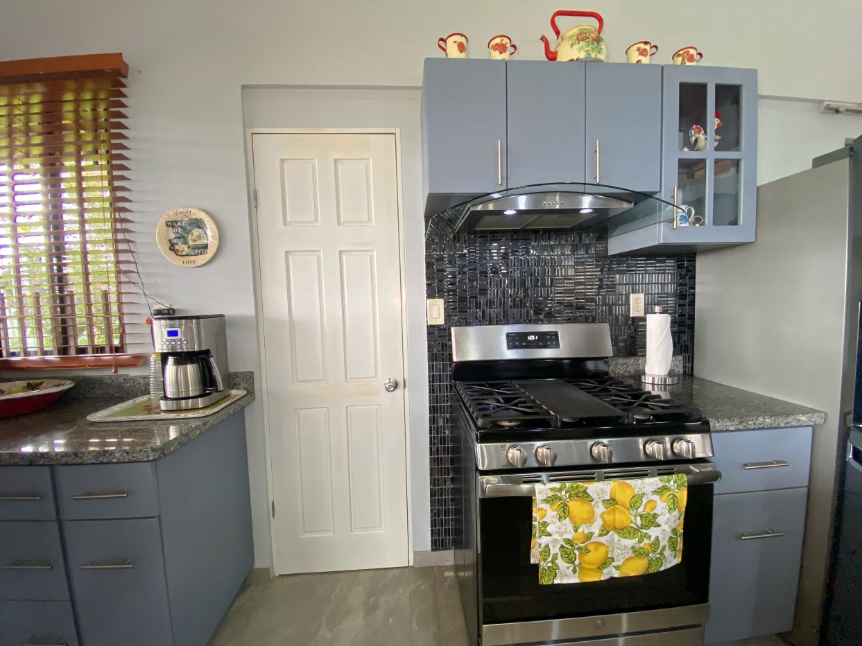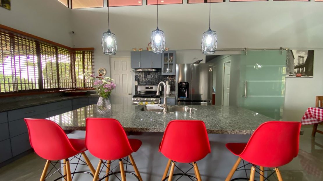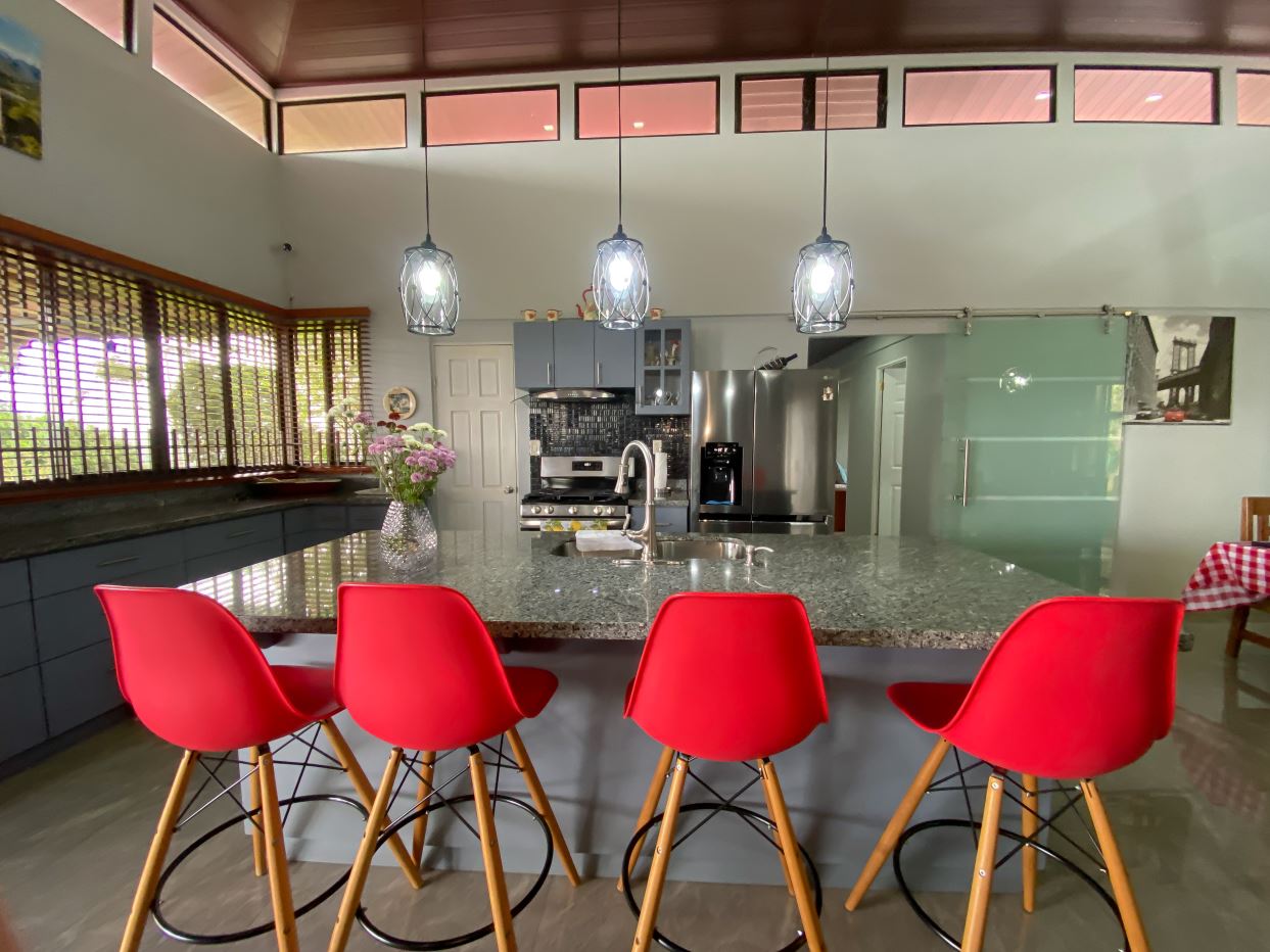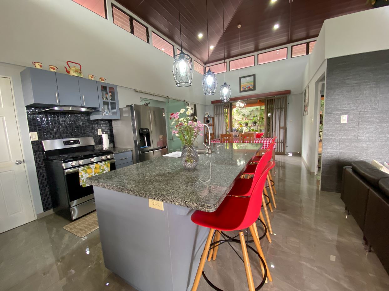 Cocina amplia equipada con desayunador, muebles integrados y cuarto de alacena.