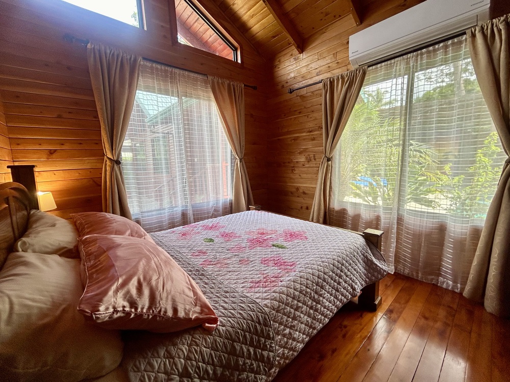 The property features a total of 500 square meters (5381.96 sq. ft.) of land with 125 square meters (1345.49 sq. ft.) of living space. The main cabin includes 3 bedrooms and 2 bathrooms, while the second cabin, used as a guest house, offers 1 bedroom and 1 bathroom. Both cabins come fully furnished and are equipped with air conditioning in every room, making them ready to move in or rent out immediately.