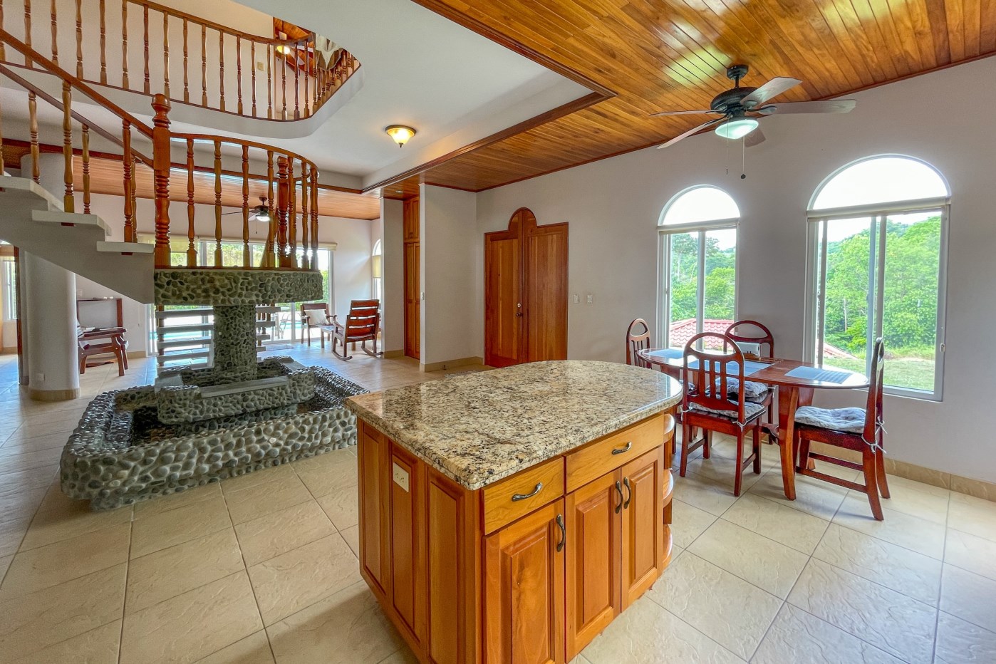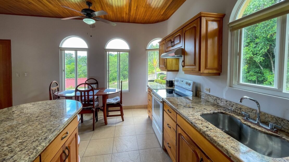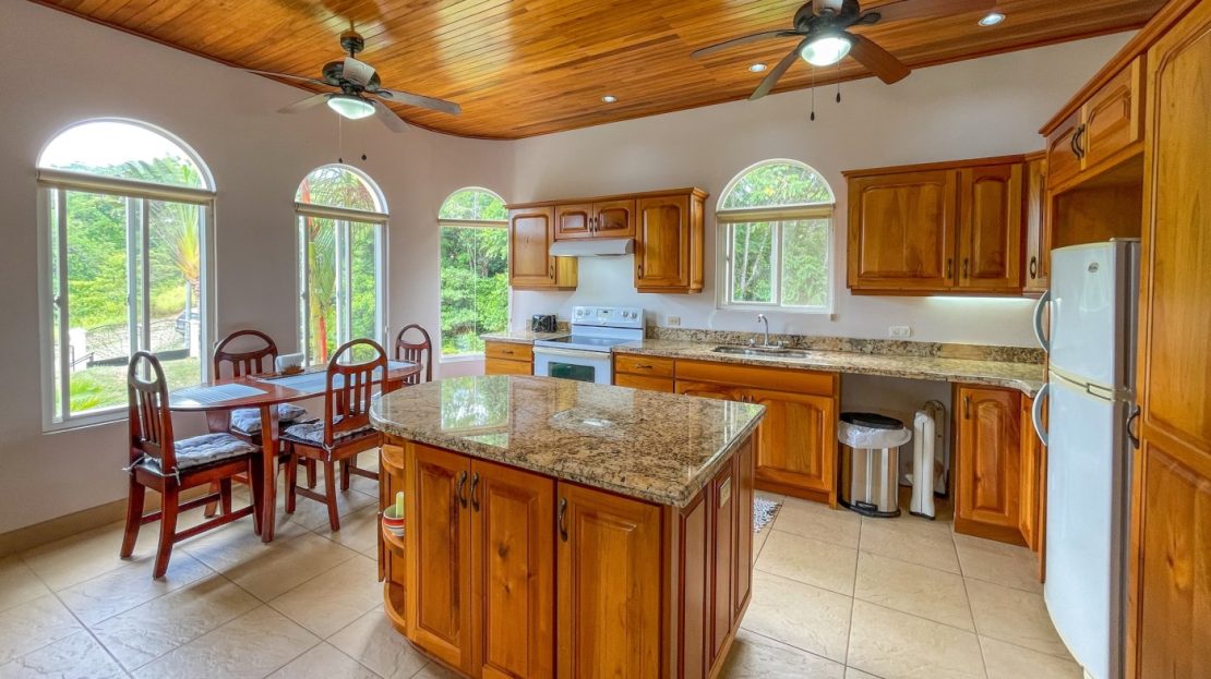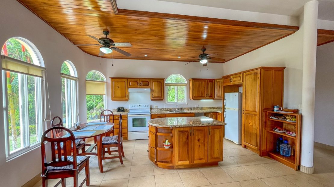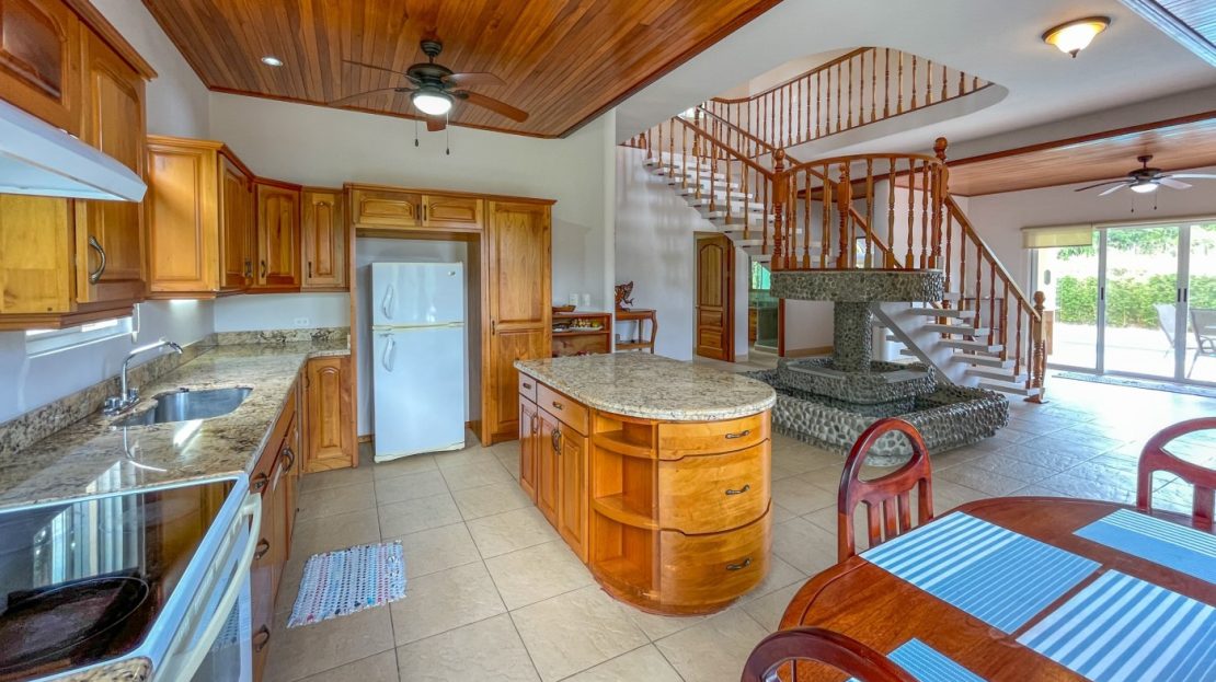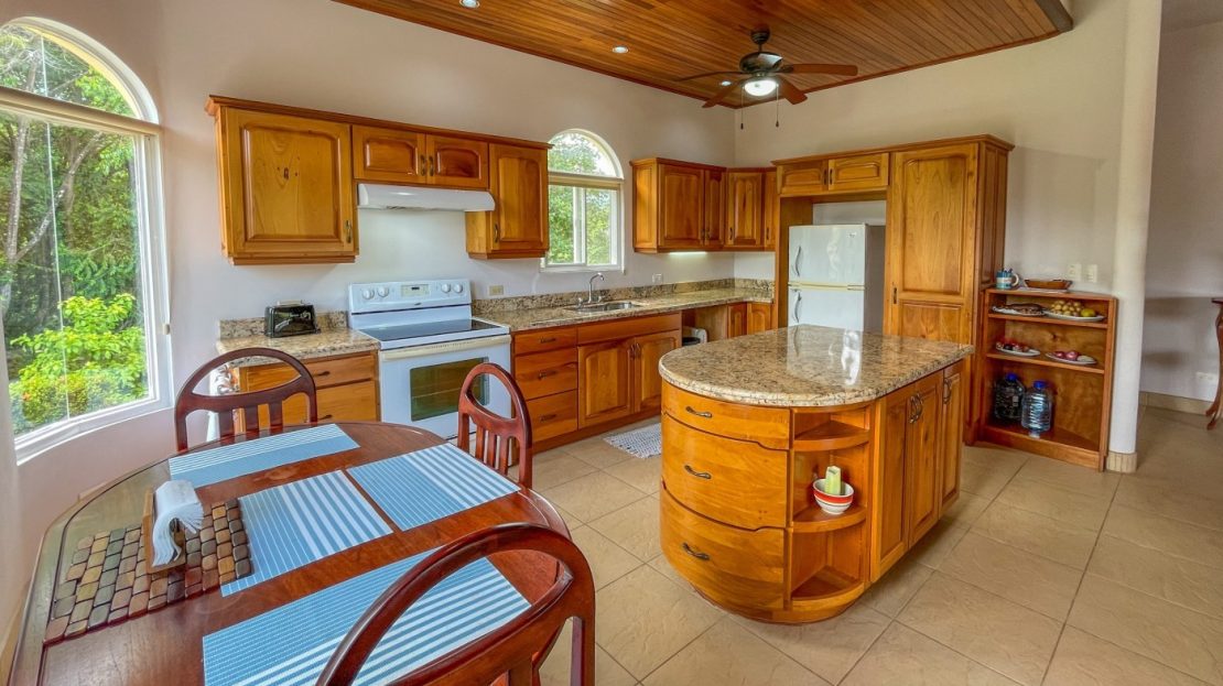 You will immediately notice the high-quality, solid construction and spacious layout with oversized doors and high ceilings throughout which make the home feel even bigger than the actual size of 2600 sf. The airy Spanish Colonial architecture is classic Ojochal style and has beautiful hardwoods accents throughout the home including furniture, cabinetry & incredible wood ceilings as well as natural elements drawn from the local natural environment. The open and airy kitchen has tons of granite countertop space combined with the ample real-wood cabinetry to ensure plenty of space to comfortably prepare meals for the whole family.