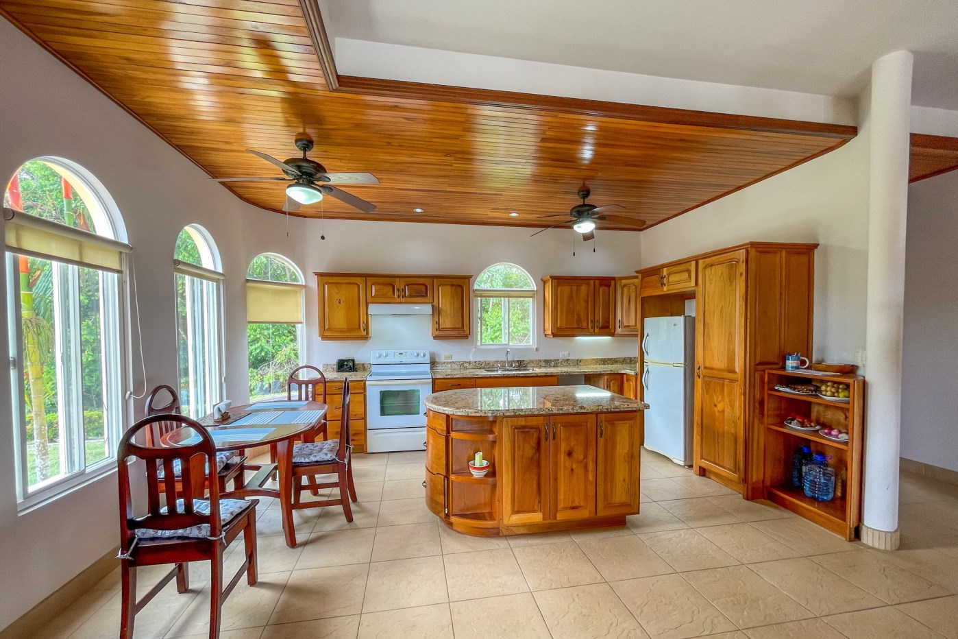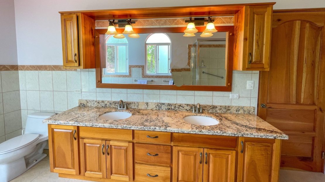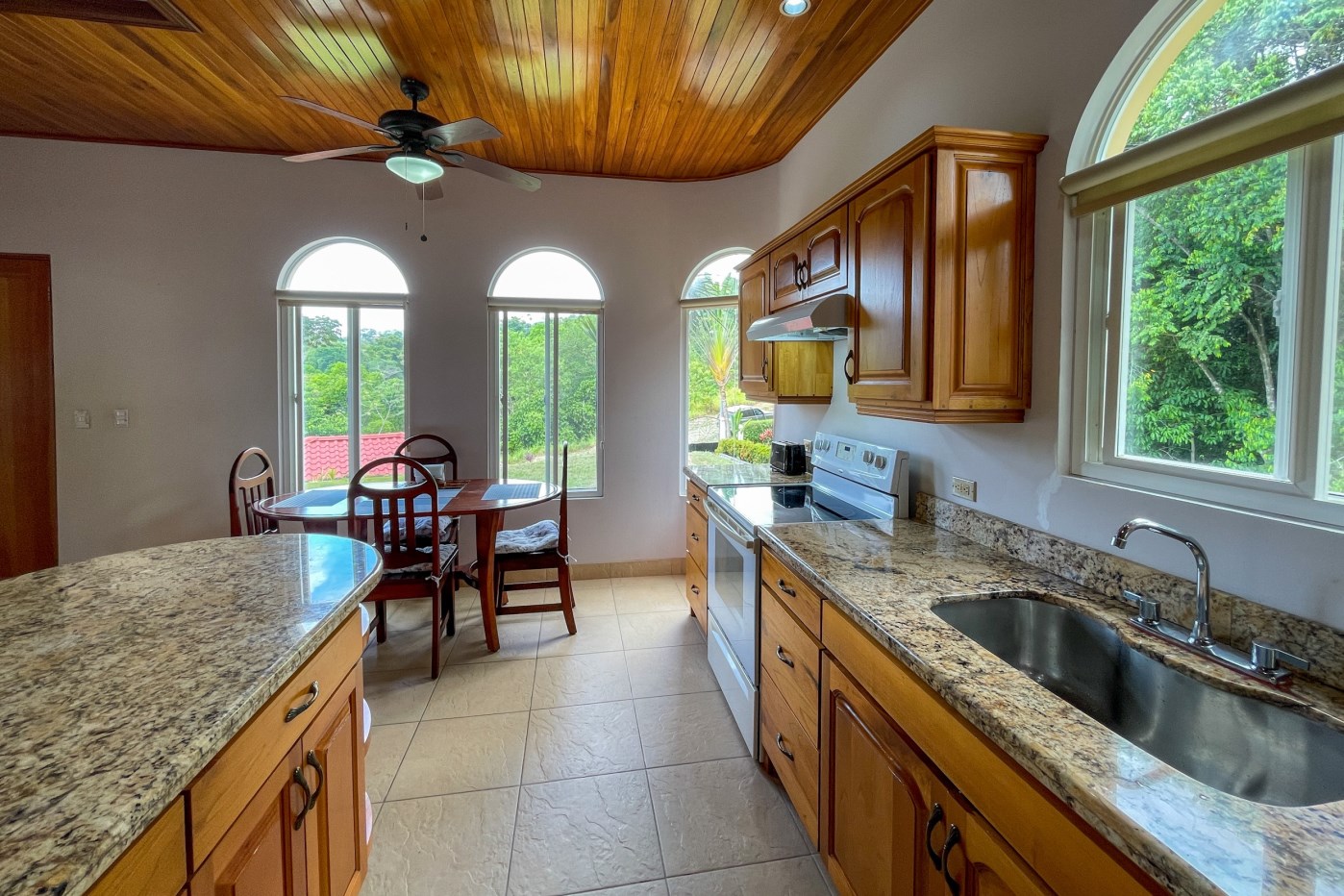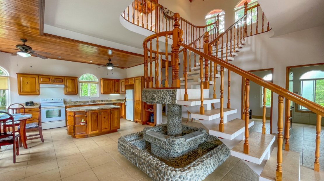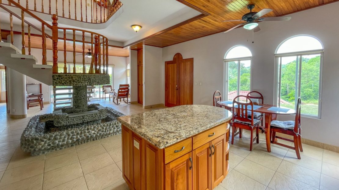 You will immediately notice the high-quality, solid construction and spacious layout with oversized doors and high ceilings throughout which make the home feel even bigger than the actual size of 2600 sf. The airy Spanish Colonial architecture is classic Ojochal style and has beautiful hardwoods accents throughout the home including furniture, cabinetry & incredible wood ceilings as well as natural elements drawn from the local natural environment. The open and airy kitchen has tons of granite countertop space combined with the ample real-wood cabinetry to ensure plenty of space to comfortably prepare meals for the whole family.