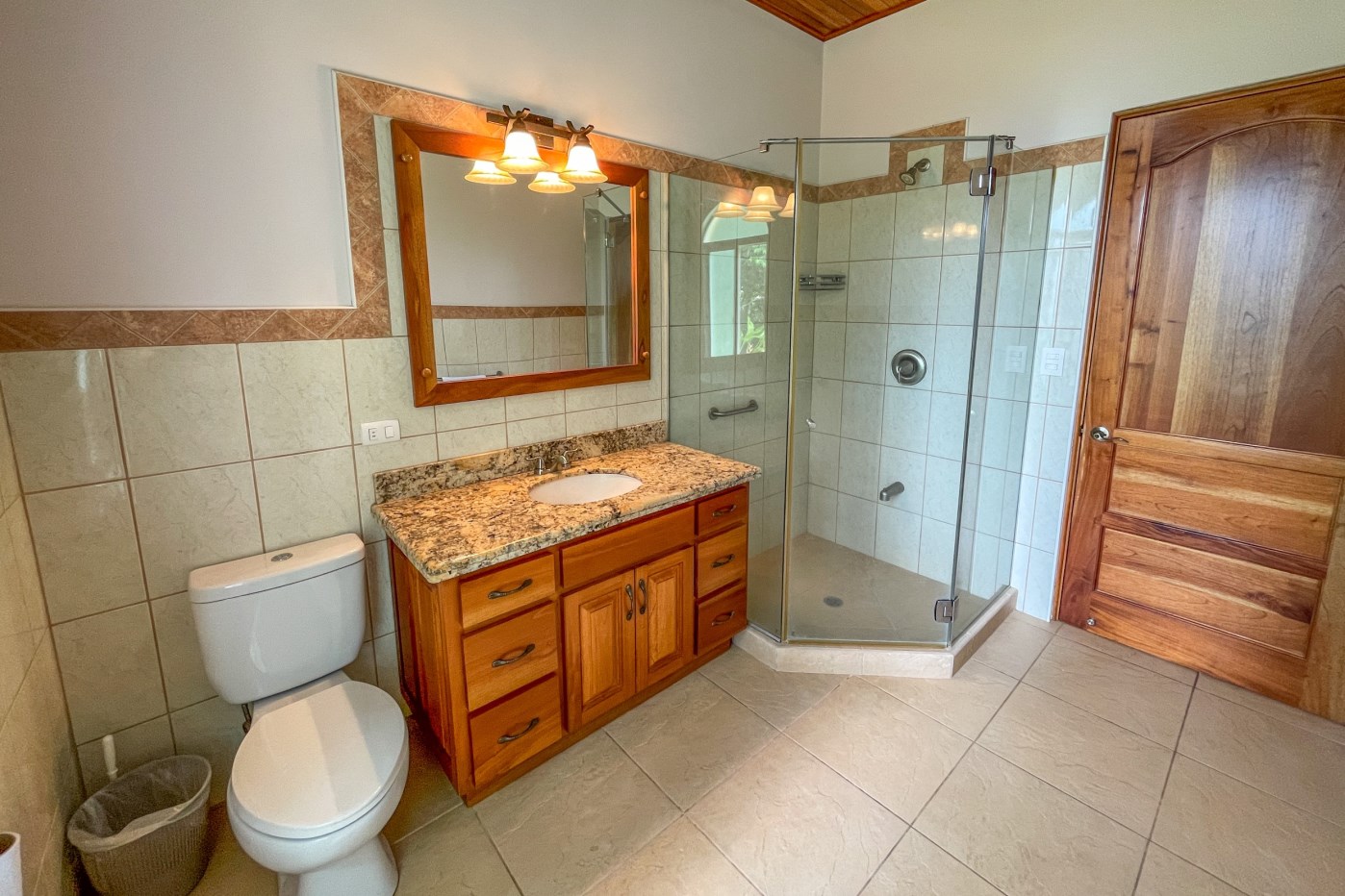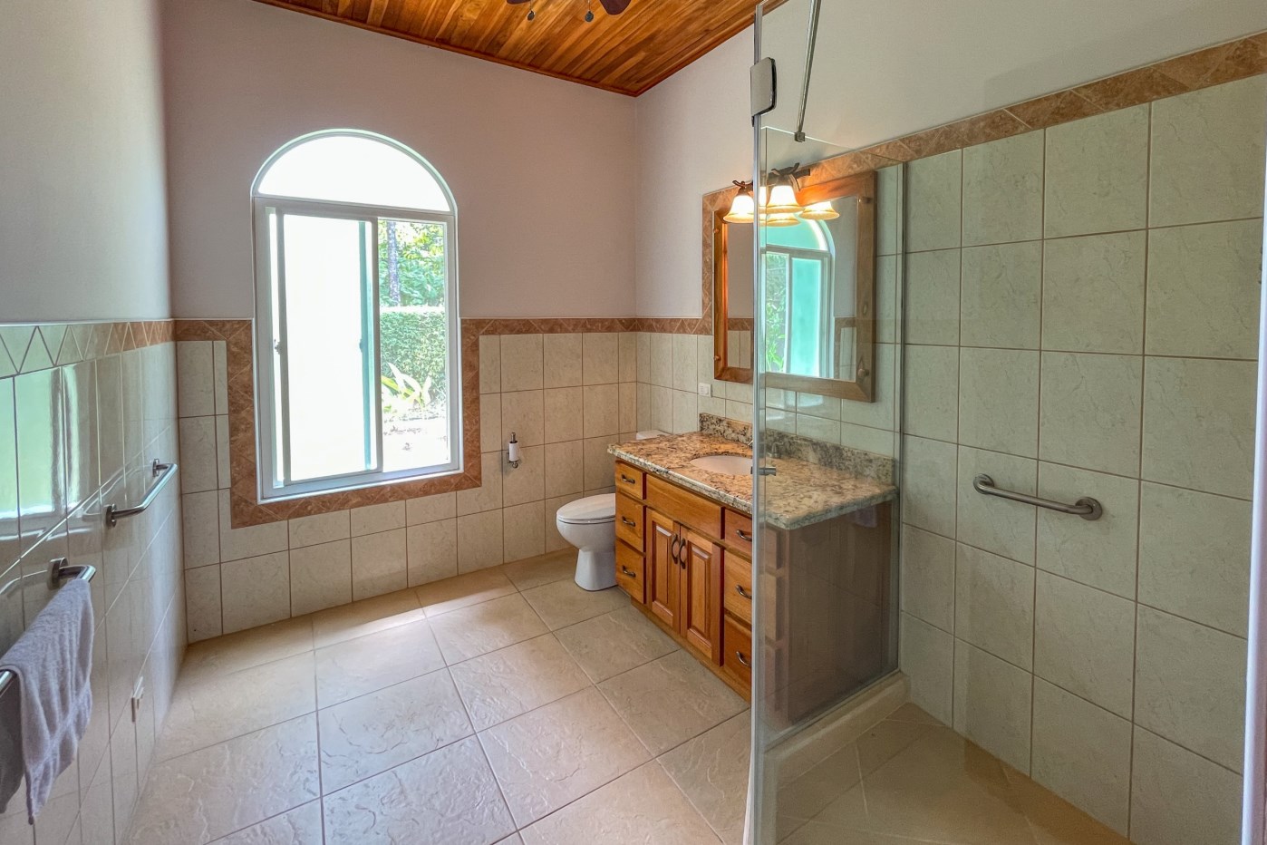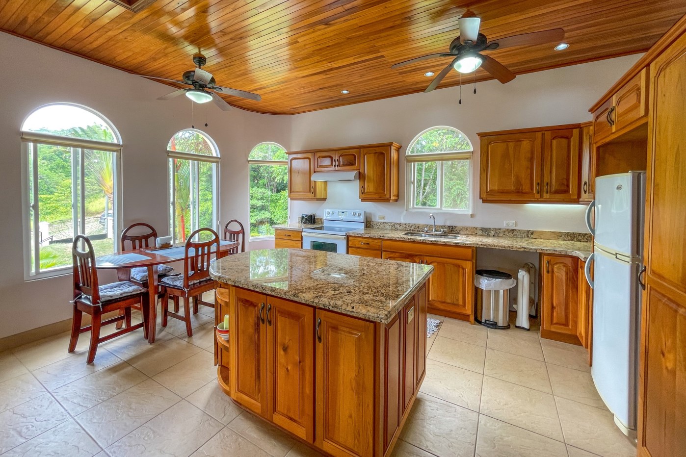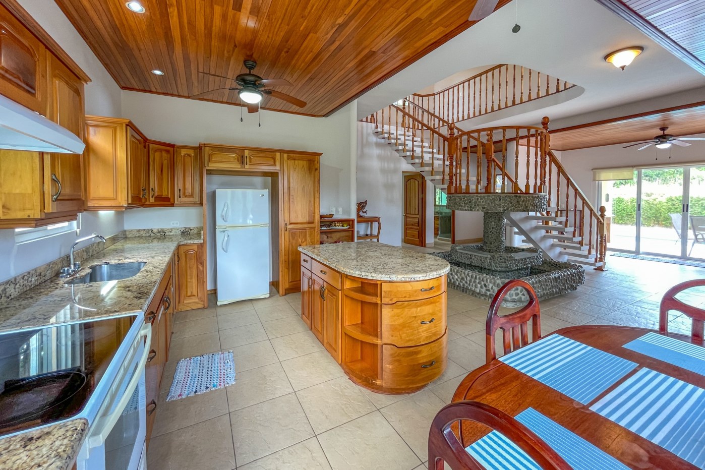 You will immediately notice the high-quality, solid construction and spacious layout with oversized doors and high ceilings throughout which make the home feel even bigger than the actual size of 2600 sf. The airy Spanish Colonial architecture is classic Ojochal style and has beautiful hardwoods accents throughout the home including furniture, cabinetry & incredible wood ceilings as well as natural elements drawn from the local natural environment. The open and airy kitchen has tons of granite countertop space combined with the ample real-wood cabinetry to ensure plenty of space to comfortably prepare meals for the whole family.