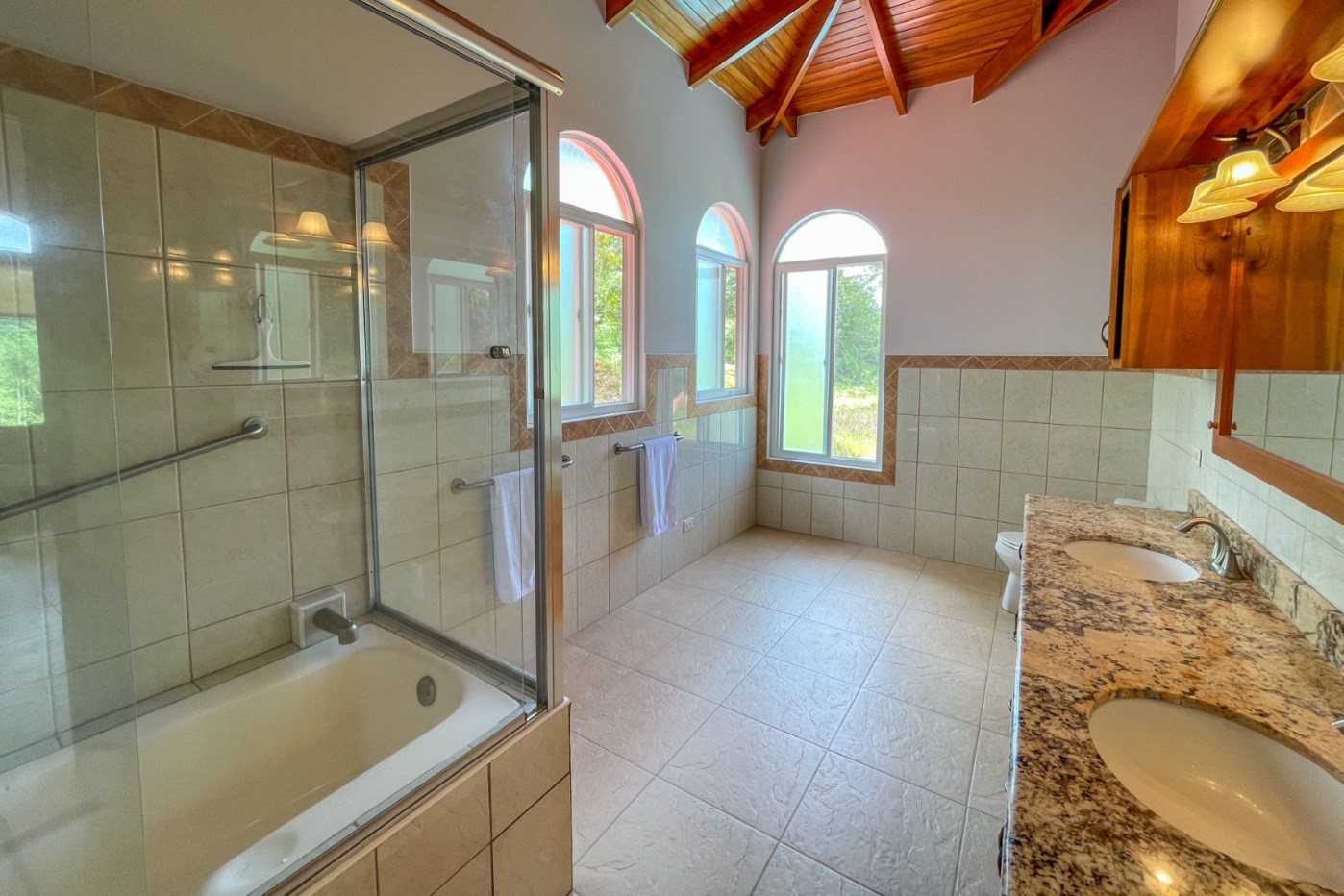 The home features 3 spacious bedrooms plus a bonus room/office which could easily be repurposed to a 4th bedroom. Downstairs, there are two spacious guest rooms, each with a big bed and closet as well as an over-sized guest bathroom with large glass shower that is perfect for family and friends to share. The upstairs is accessed by a grand staircase and hosts the bonus room with balcony which would be great as a 4th bedroom, office or workout room. The super-sized master bedroom has high, real-wood ceilings, big bed, closet and private balcony overlooking the pool surrounding jungle. The massive master bathroom has double sinks, spacious shower/tub plus plenty of room to add a big bathtub if you wish.