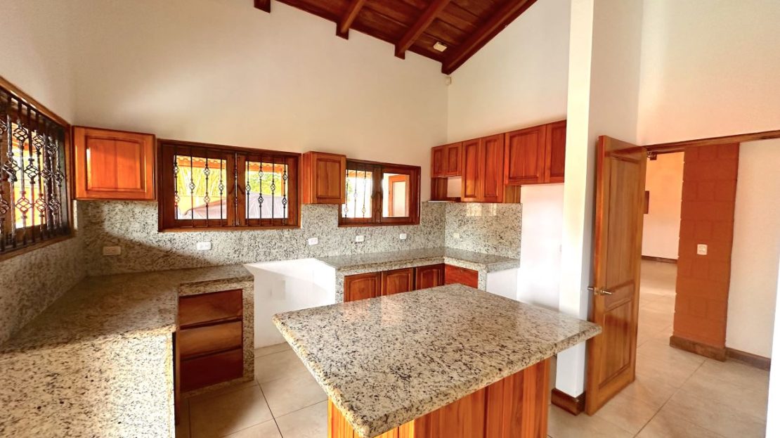Remodeled kitchen with granite countertops and custom solid wood cabinetry crafted from tropical cedar and laurel.