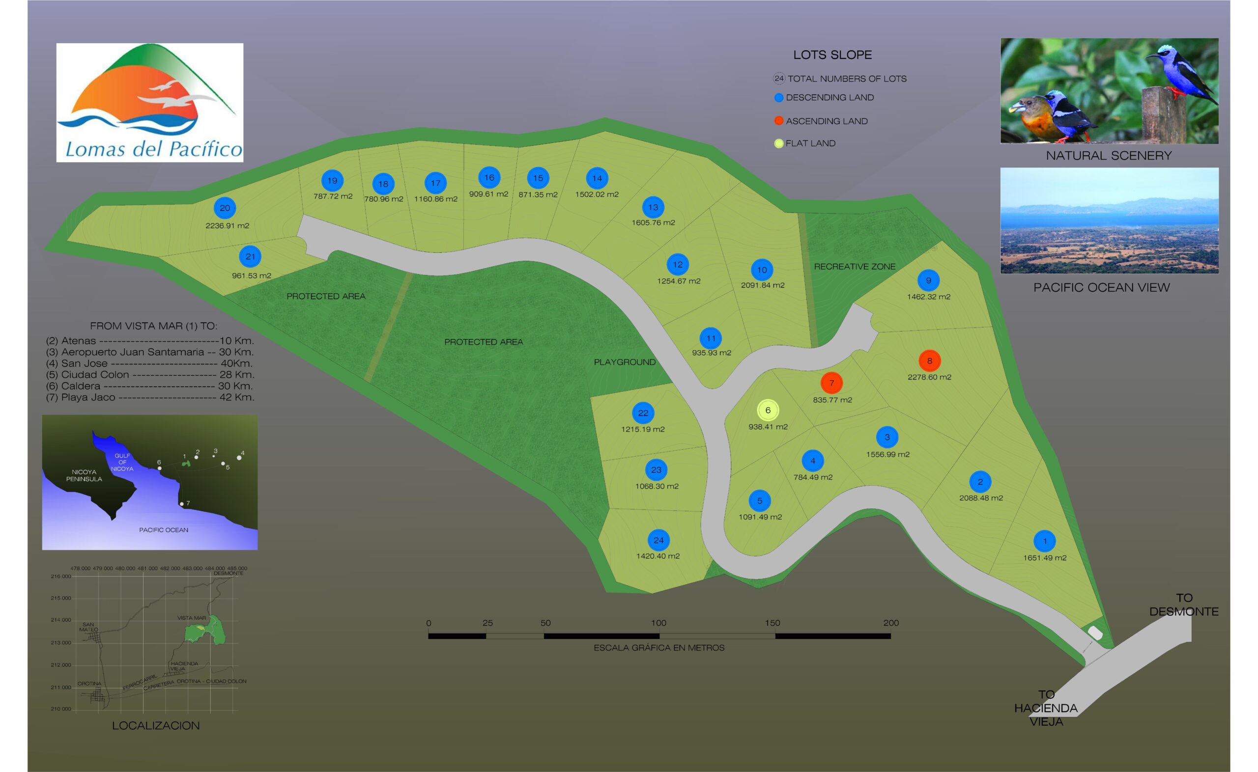 Lomas del Pacífico está ubicado en Vistas del Mar, en lo alto del Cerro Chompipe en Orotina, el cual es un Eco Residencial con calles adoquinadas a una elevación de 660 MSNM, lo que lo hace tener un clima excelente con vistas panorámicas incomparables del océano y la naturaleza circundante. Este es el lugar donde observarás a la belleza de la montaña encontrándose con la majestuosidad del mar. Además, colinda con 100 Hectáreas de la Reserva Biológica el Chompipe, que es un bosque primario protegido.