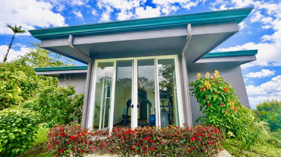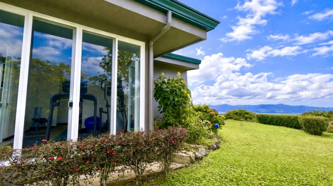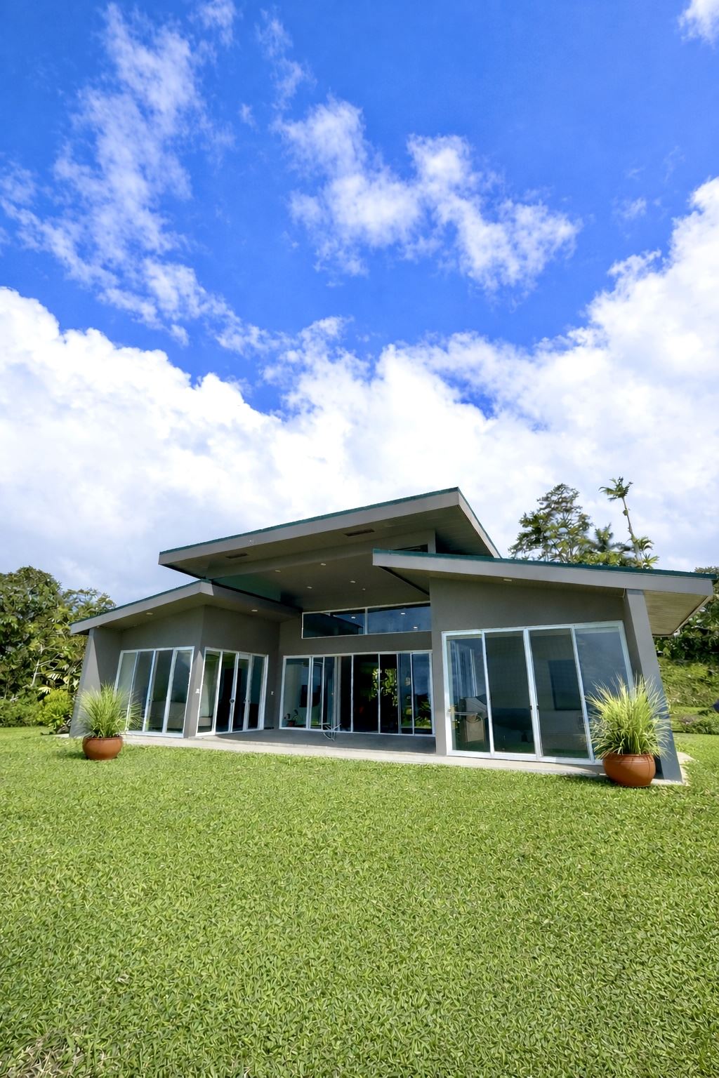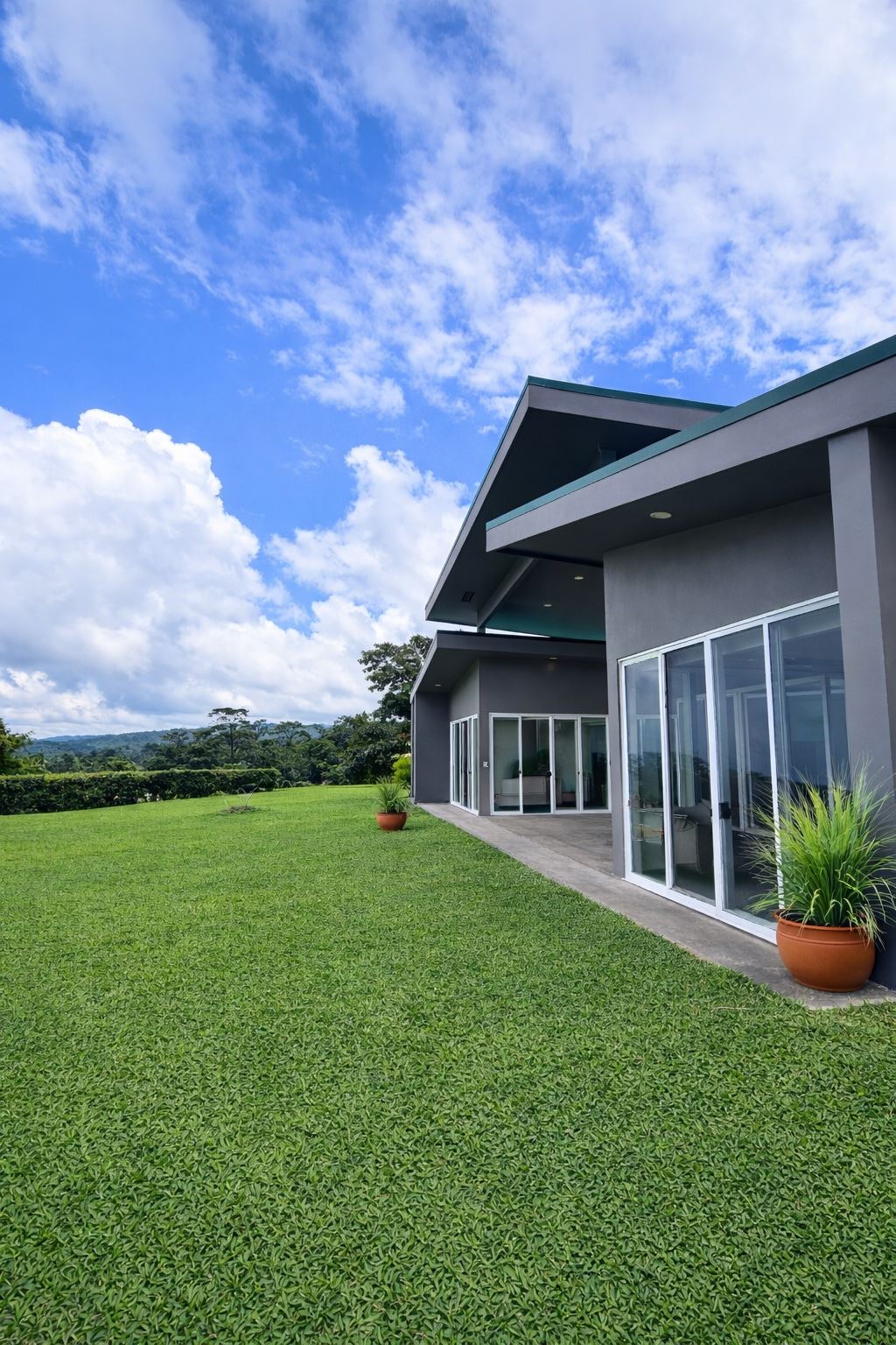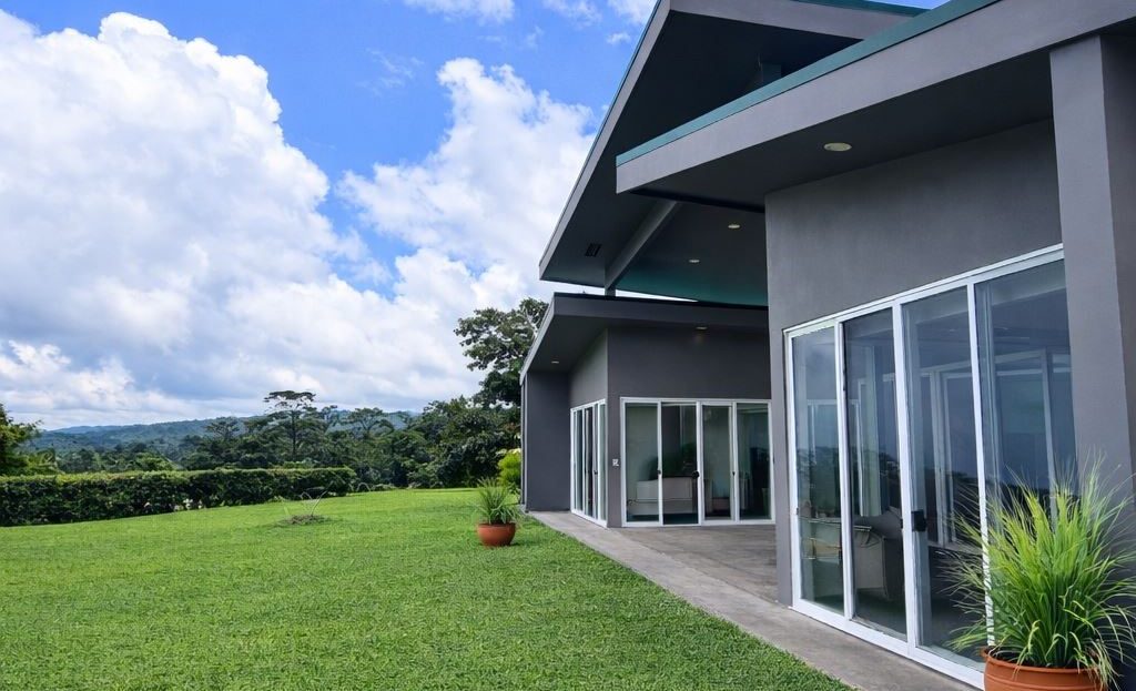 The home presents a striking contemporary exterior defined by clean architectural lines, flat roof profiles, and expansive glass elements that create a seamless connection between indoor and outdoor living. Floor-to-ceiling sliding glass doors span the façade, opening onto a wide covered terrace and manicured lawn, ideal for entertaining or quiet enjoyment of the surrounding natural landscape. A neutral color palette and modern materials complement the tropical setting while emphasizing light, openness, and simplicity. Thoughtfully designed for privacy and ease of maintenance, the residence blends refined modern design with Costa Rica’s lush environment in an understated and timeless manner.