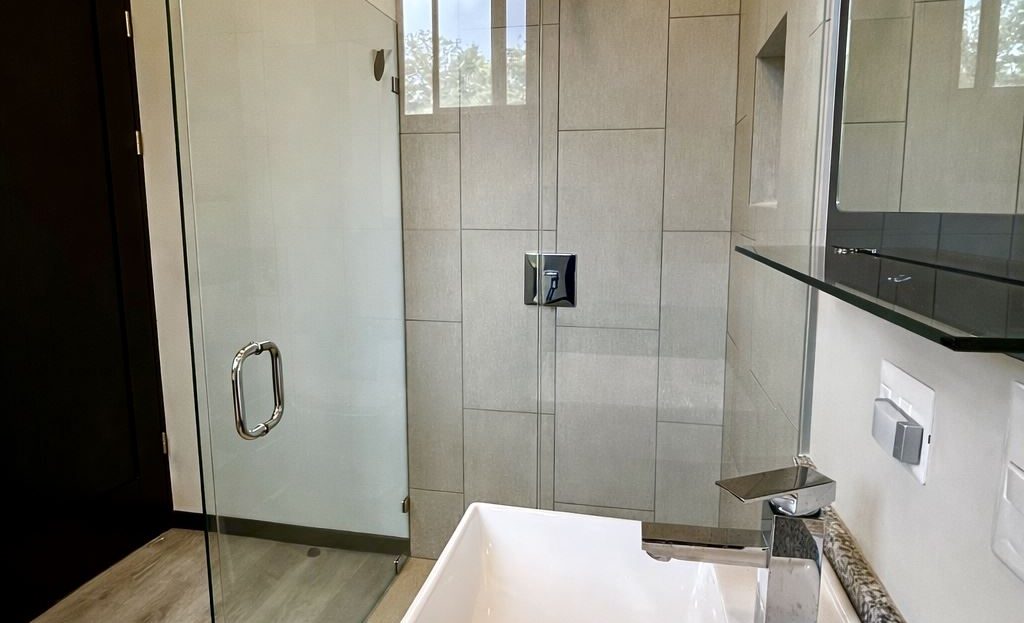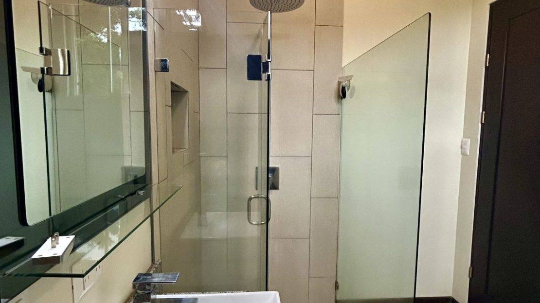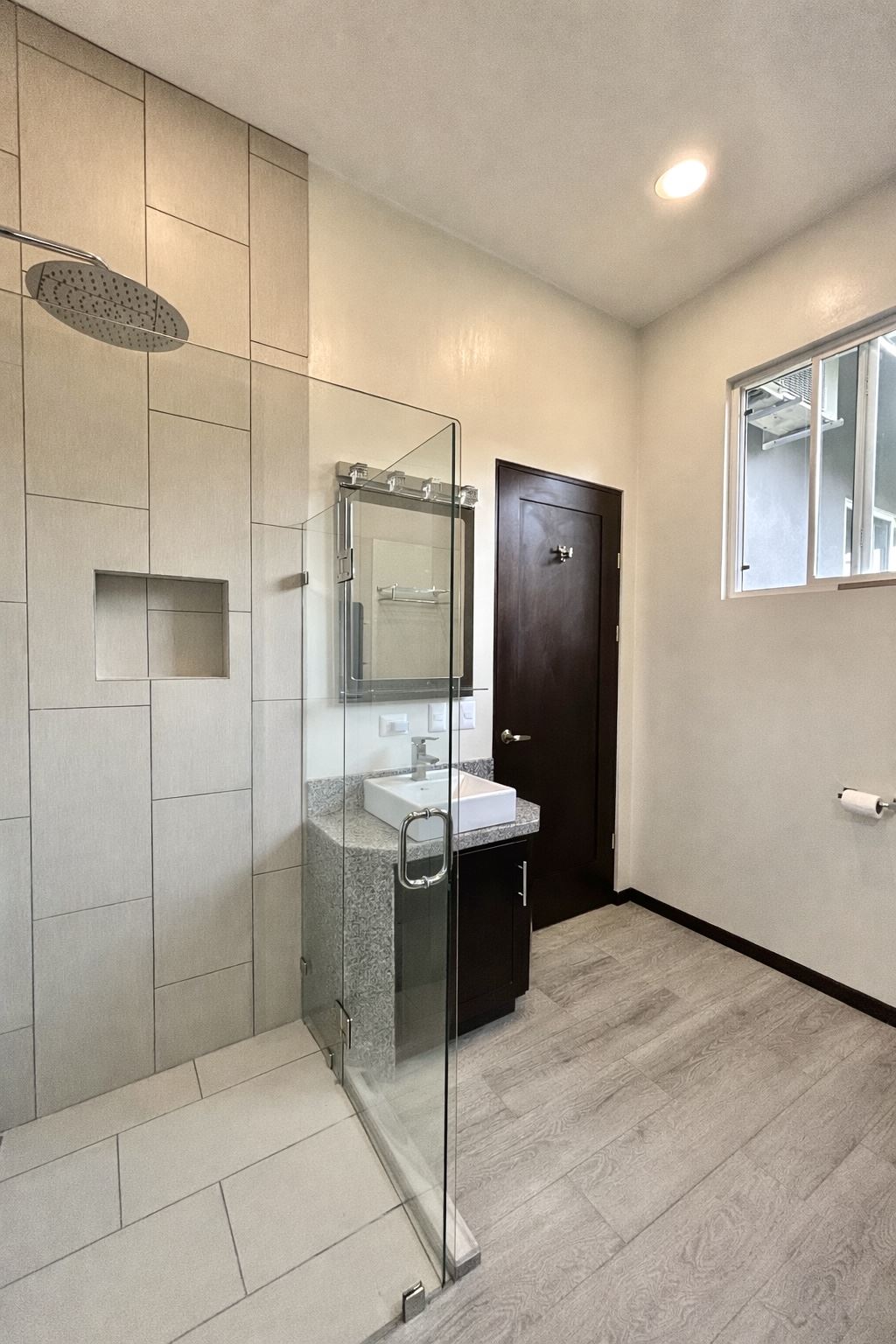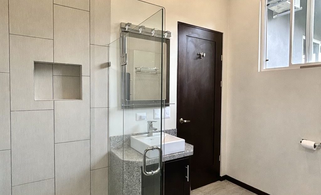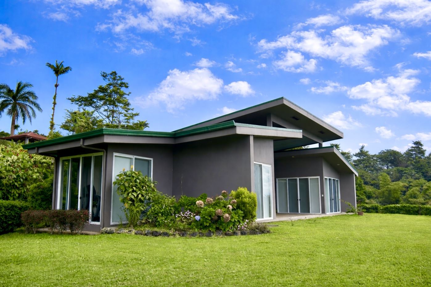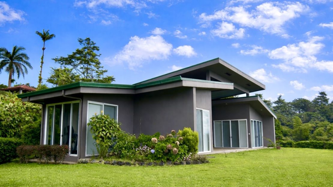 The home presents a striking contemporary exterior defined by clean architectural lines, flat roof profiles, and expansive glass elements that create a seamless connection between indoor and outdoor living. Floor-to-ceiling sliding glass doors span the façade, opening onto a wide covered terrace and manicured lawn, ideal for entertaining or quiet enjoyment of the surrounding natural landscape. A neutral color palette and modern materials complement the tropical setting while emphasizing light, openness, and simplicity. Thoughtfully designed for privacy and ease of maintenance, the residence blends refined modern design with Costa Rica’s lush environment in an understated and timeless manner.