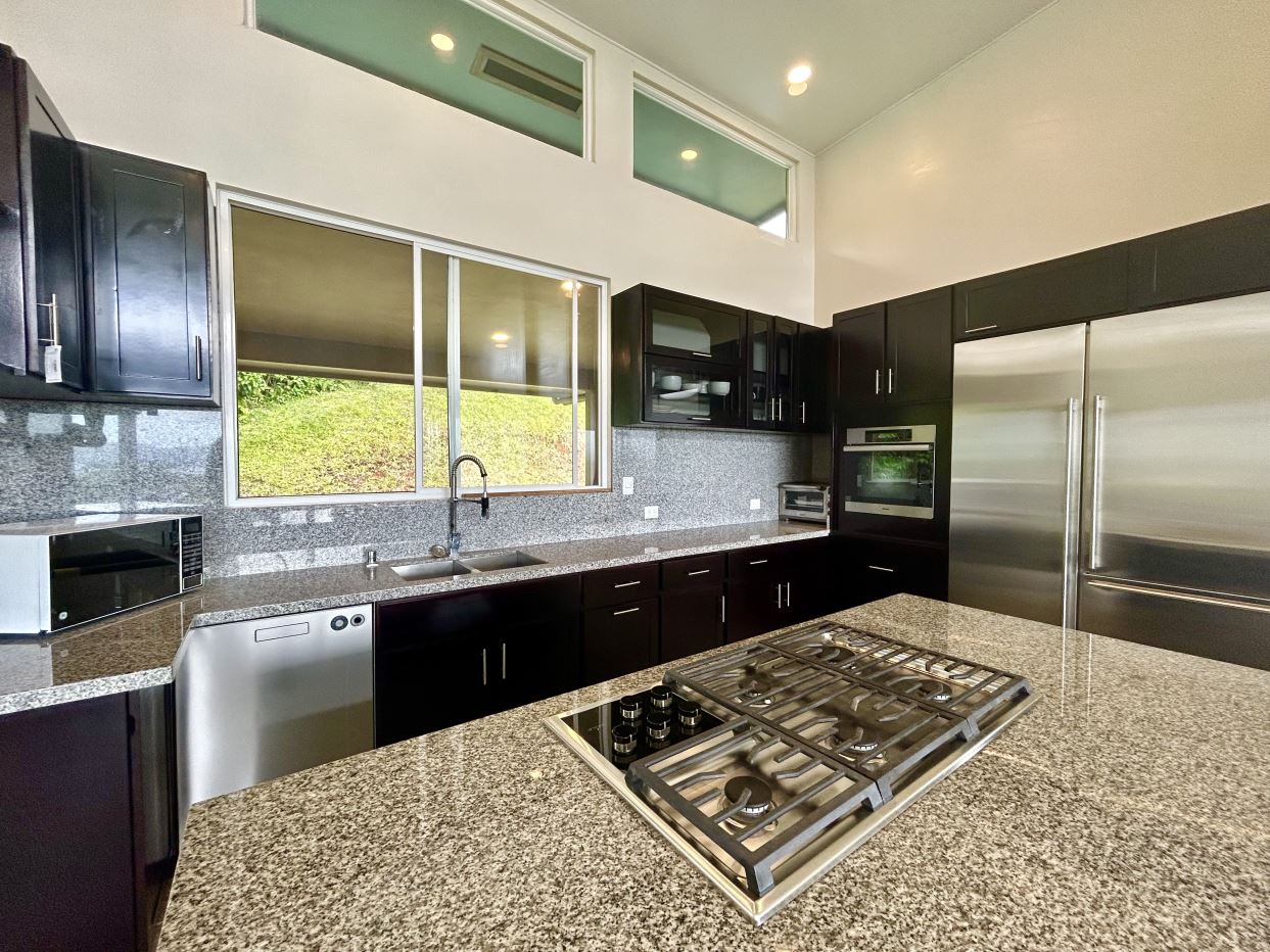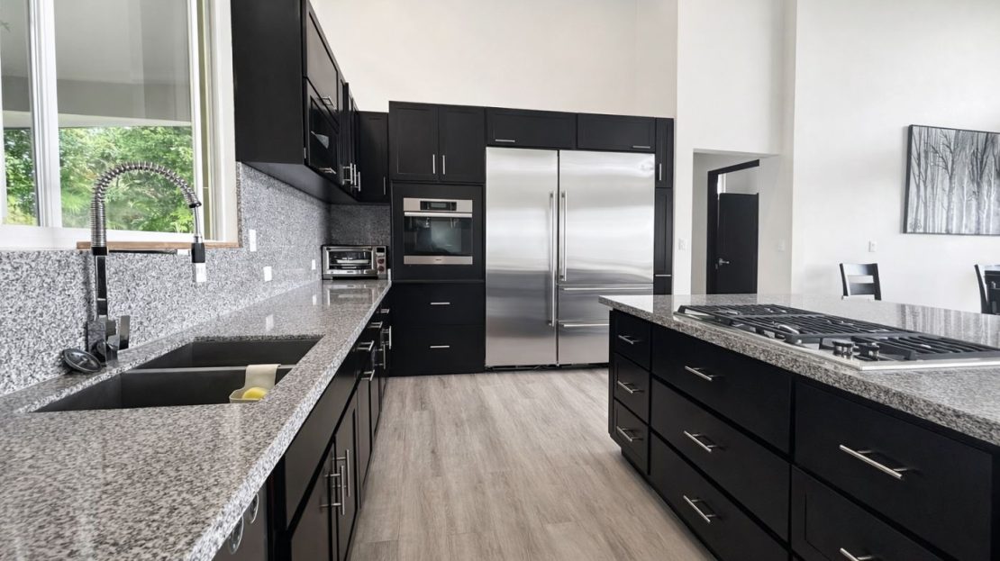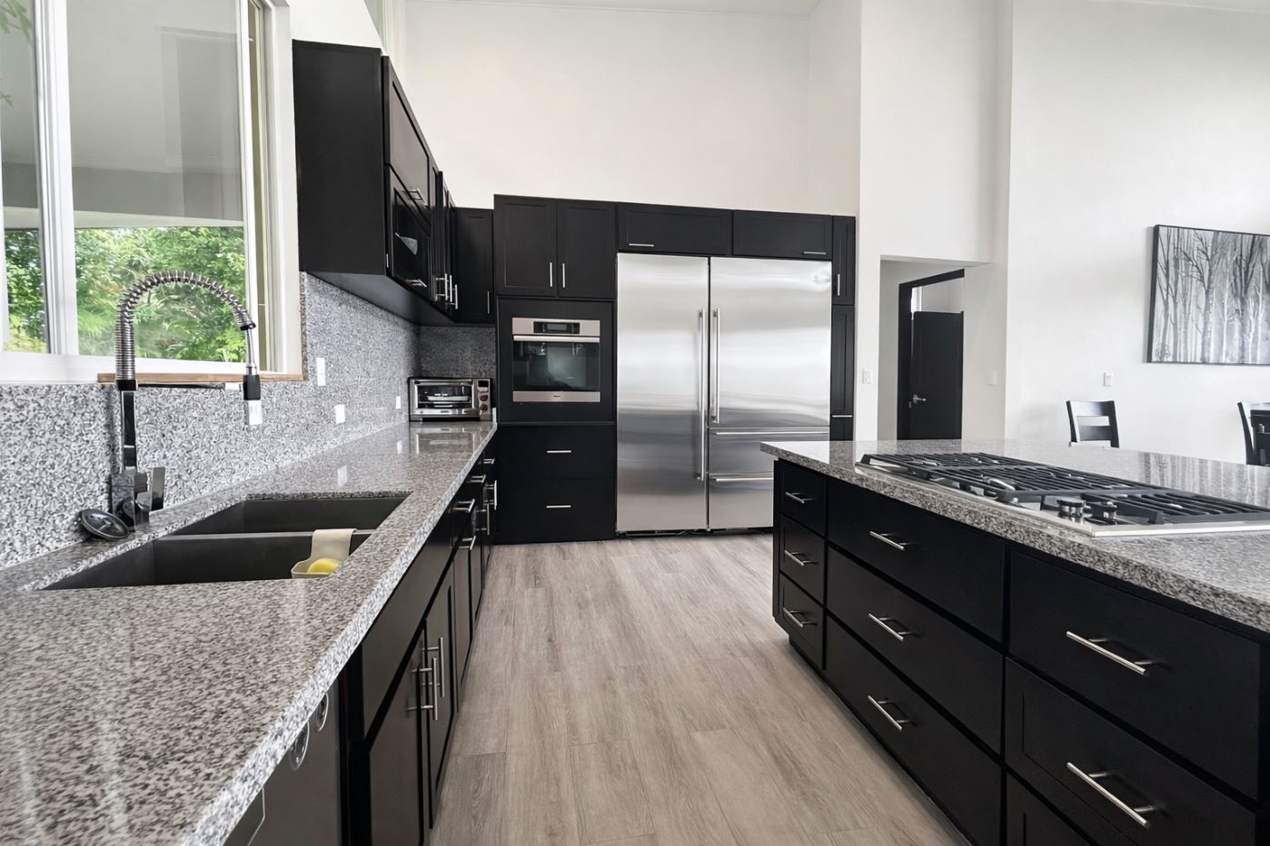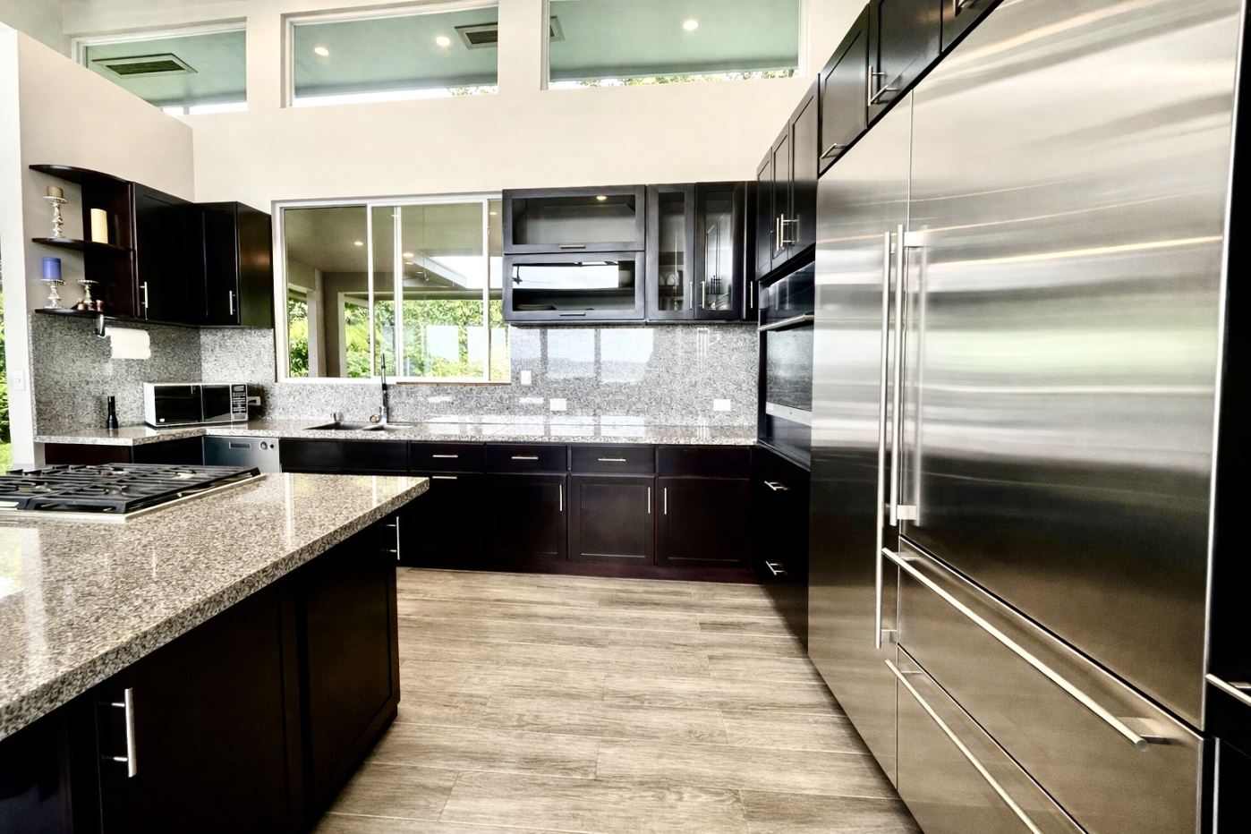 The contemporary kitchen is seamlessly integrated into the main living space and appointed with high-end appliances, including a Sub-Zero refrigerator, complemented by modern cabinetry and granite countertops. Clean lines and generous counter space include a central island with an integrated cooktop and breakfast bar seating, creating a natural gathering point for casual meals and entertaining, while the adjacent dining area accommodates more formal dining within the same open-plan layout.