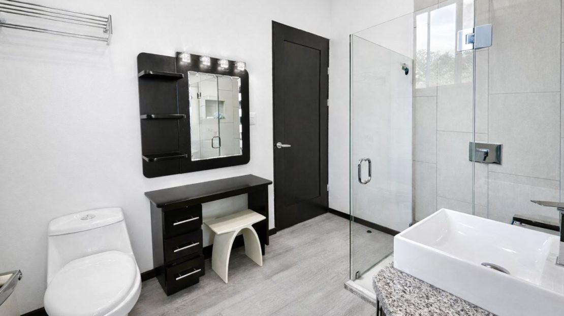 The home is configured as a three-bedroom plus den residence with a thoughtfully designed split floor plan that separates the two principal bedrooms into distinct areas of the home. Each of the air conditioned principal bedrooms is identical in size and layout, and each features an en-suite bathroom and custom built-in closets, providing flexibility for full-time living, family use, or hosting guests while preserving privacy between sleeping areas.