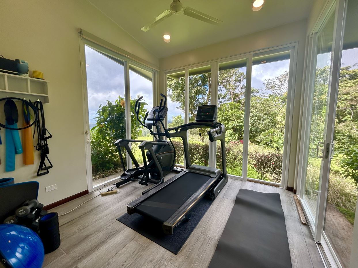 Each principal bedroom feature patio doors on multiple elevations, creating a light-filled, dual-aspect design with direct access to the terrace and surrounding gardens. This architectural detail enhances natural light, airflow, and privacy while reinforcing the home’s seamless connection to the outdoors. The den features patio doors on each elevation, increasing natural light, access, and overall usability. Currently used as a gym, this highly adaptable space opens directly to the gardens and offers excellent flexibility to be repurposed as a home office, art studio, additional sitting area, potential guest bedroom, or a dedicated wine and cigar room.