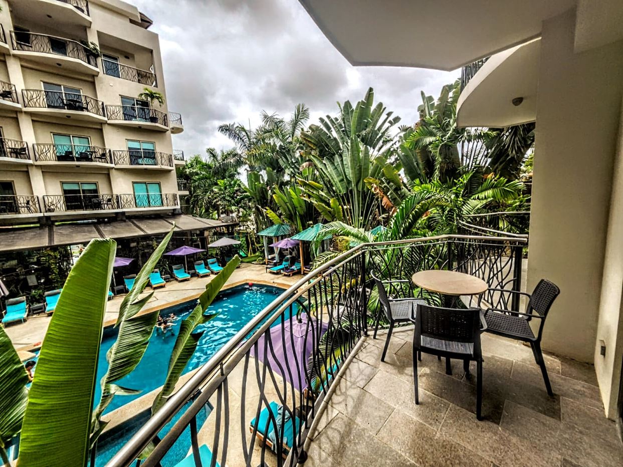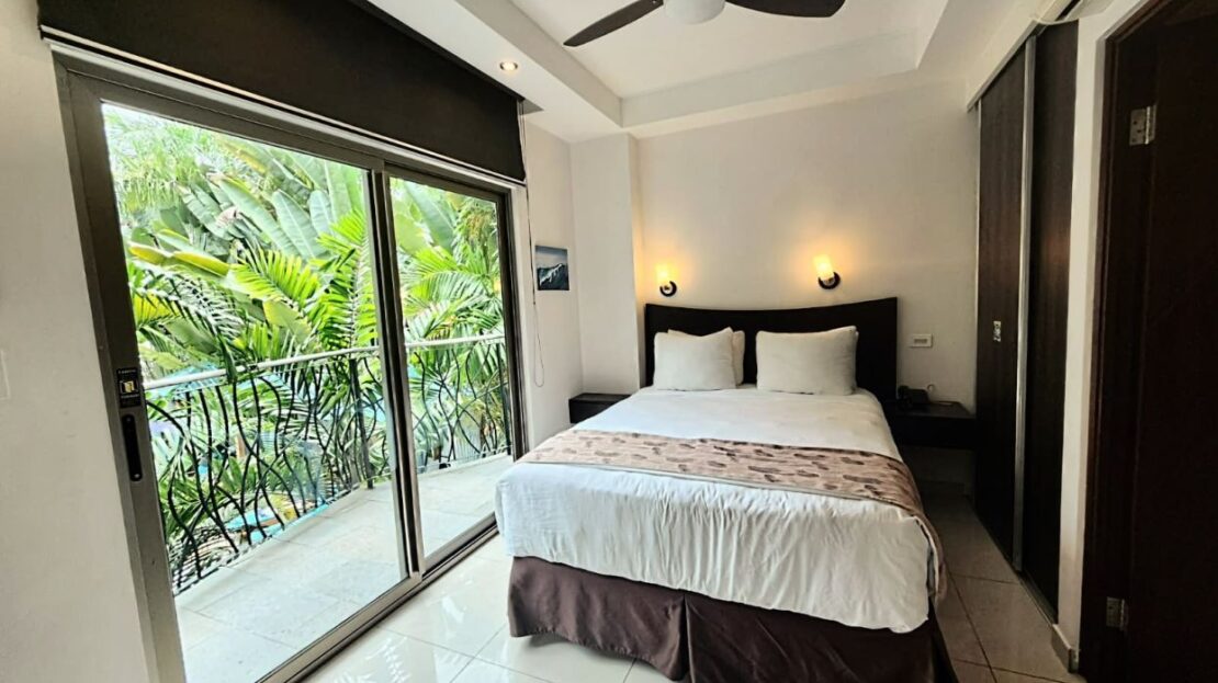Discover the perfect blend of comfort and luxury in this fully equipped, modern 1-bedroom suite. This spacious unit, on floor two, can comfortably accommodate 2 to 4 people making it perfect for a small family or close friends. The bedroom is cozy with it’s queen-sized bed, a 32″ TV, air conditioning, ceiling fans and it’s own private balcony overlooking the pool. Access the unit’s luxurious and large bathroom from the bedroom or the living area (don’t worry this units plumbed with hot water for your ultimate comfort!). The second balcony joins the living area which has a pool and mountain view complete with a comfortable sofa bed and a 39″ LED TV. Enjoy watching your loved ones play in the pool without missing your favourite sports game!