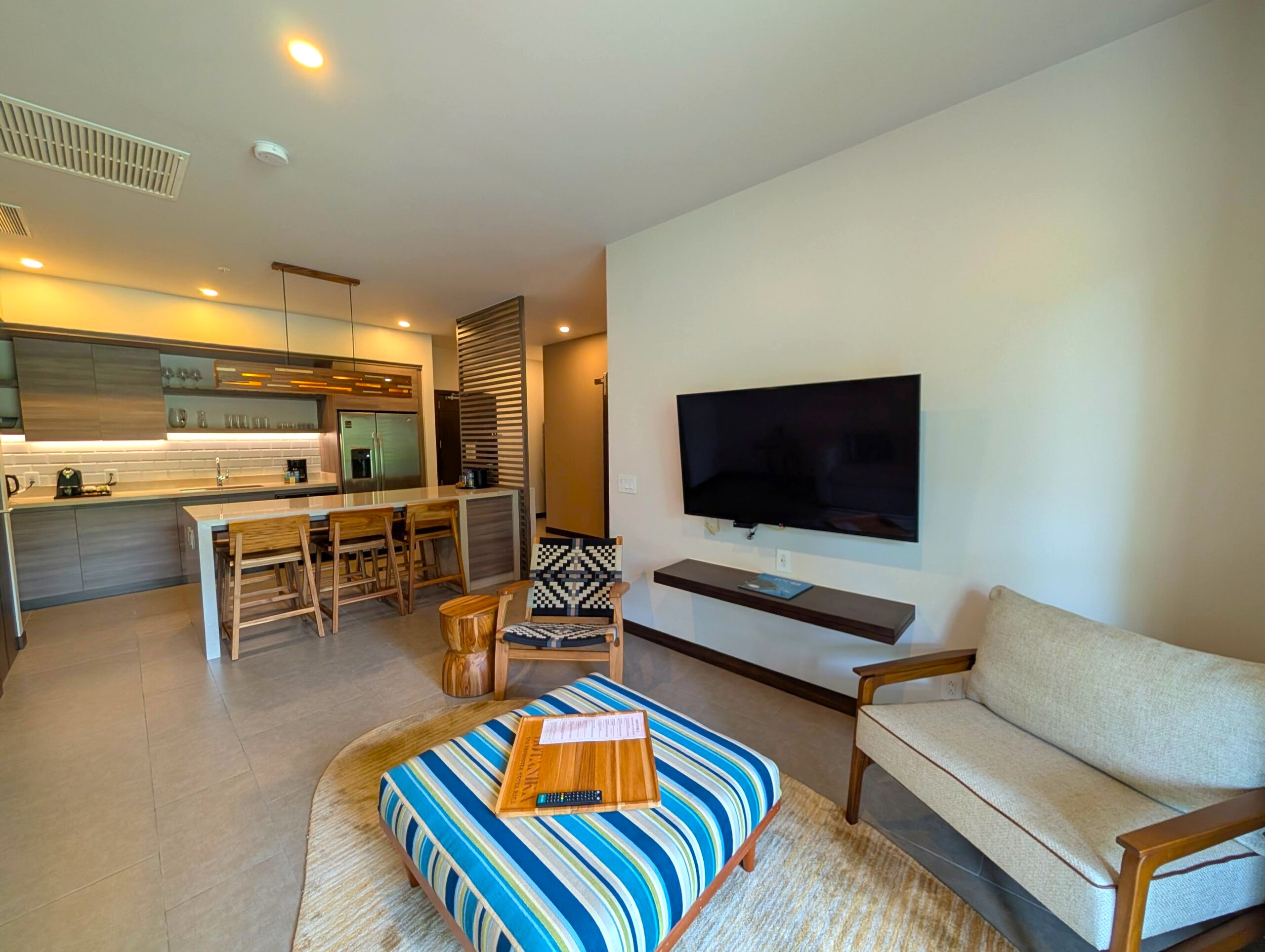 Modern kitchen, living area, air conditioning, WiFi, and a 55-inch television