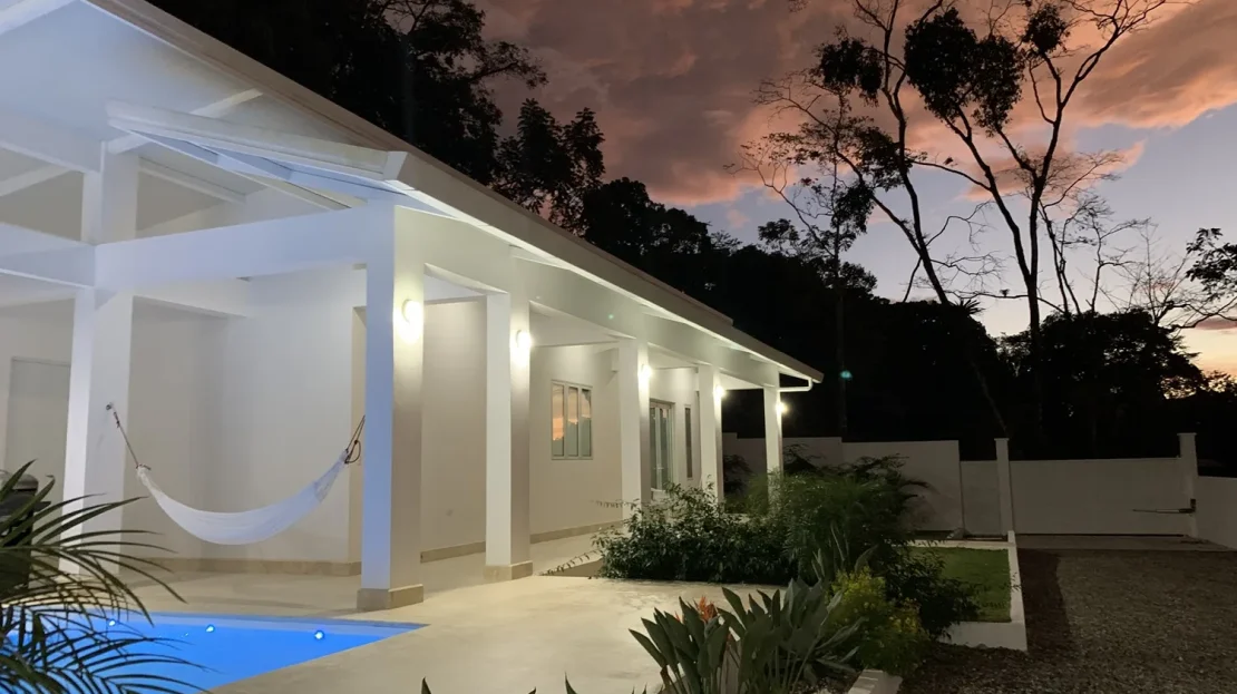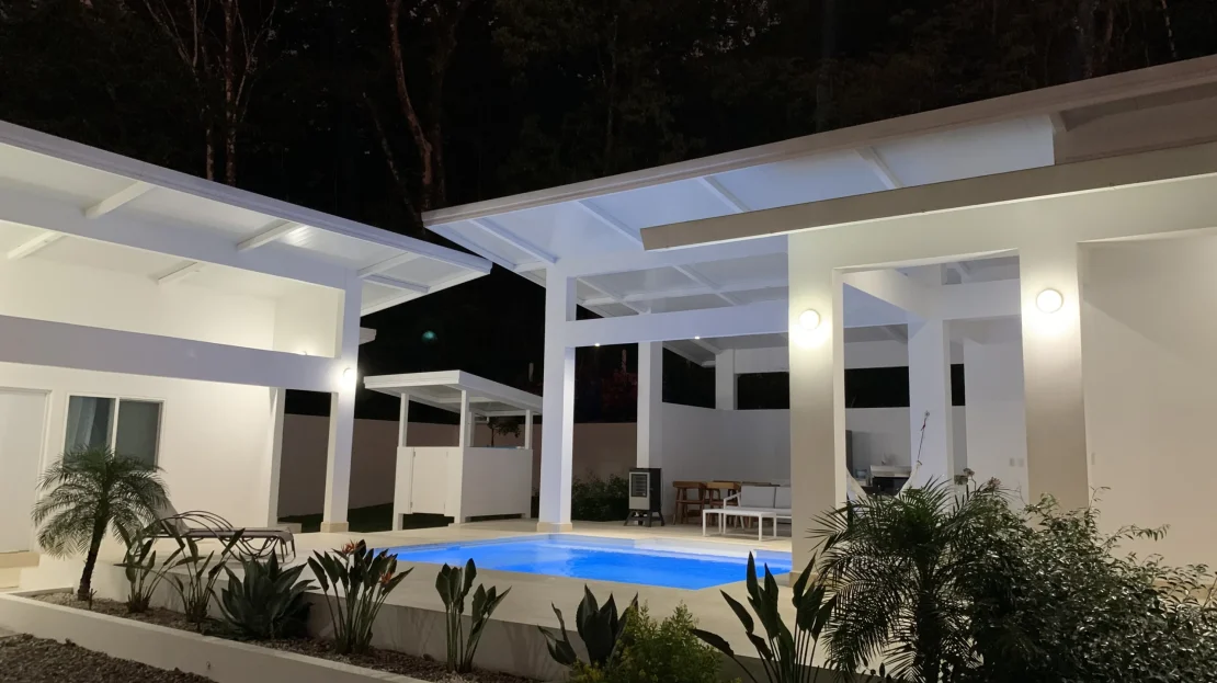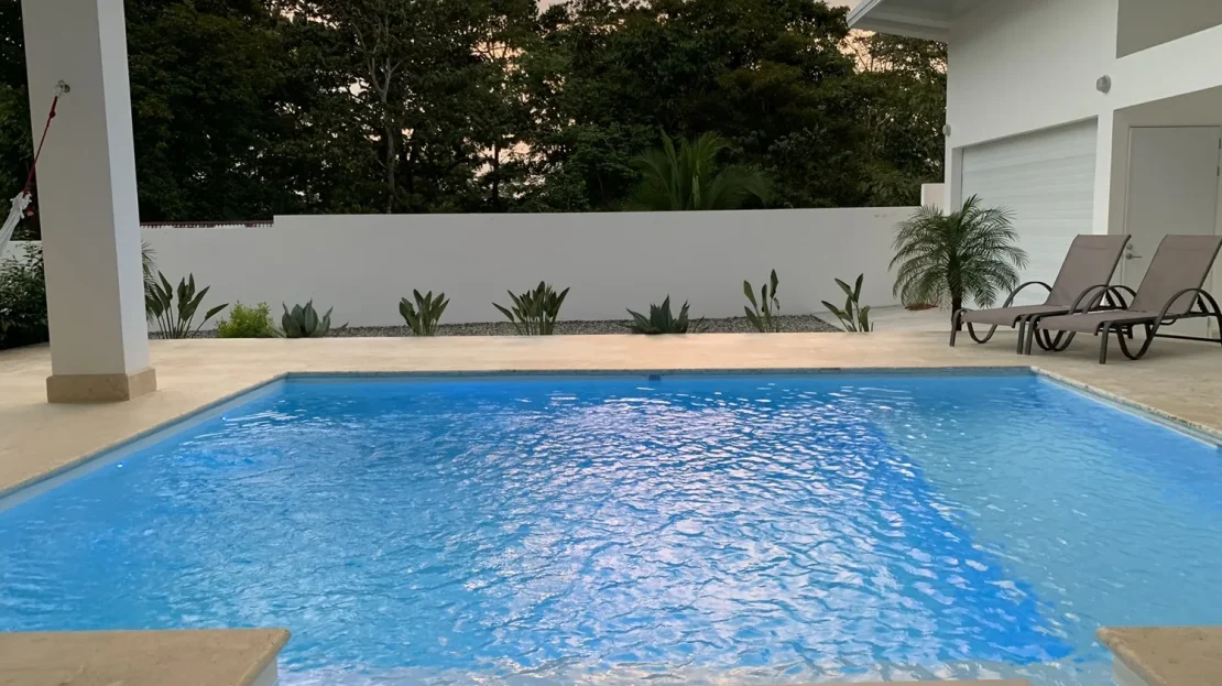 The guesthouse is a haven of comfort, accommodating up to four guests. A full bathroom with a marble shower, granite countertops, and a walk-in closet ensures their utmost convenience. An inverter A/C unit guarantees comfort, and a second door provides easy access to the pool area.