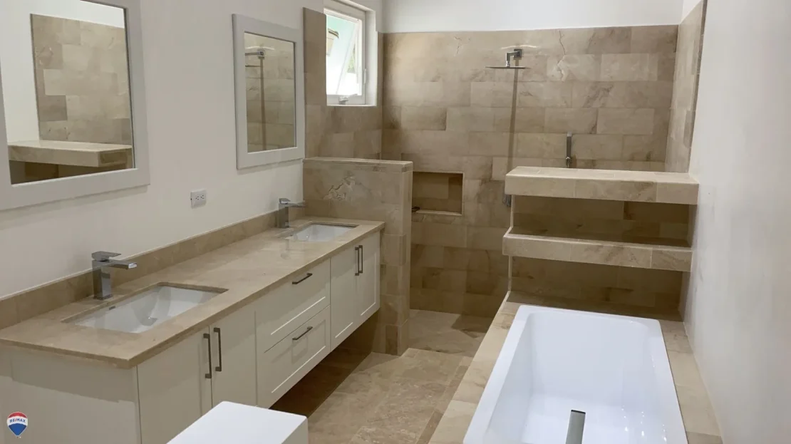 The master suite offers complete privacy and indulgence. Cream of Marfil Italian Marble graces the bathroom, featuring a spacious shower with a large rain head and bench, a separate bathtub, a double vanity sink, and a bidet. High ceilings in the master bedroom and a walk-in closet add to the allure.