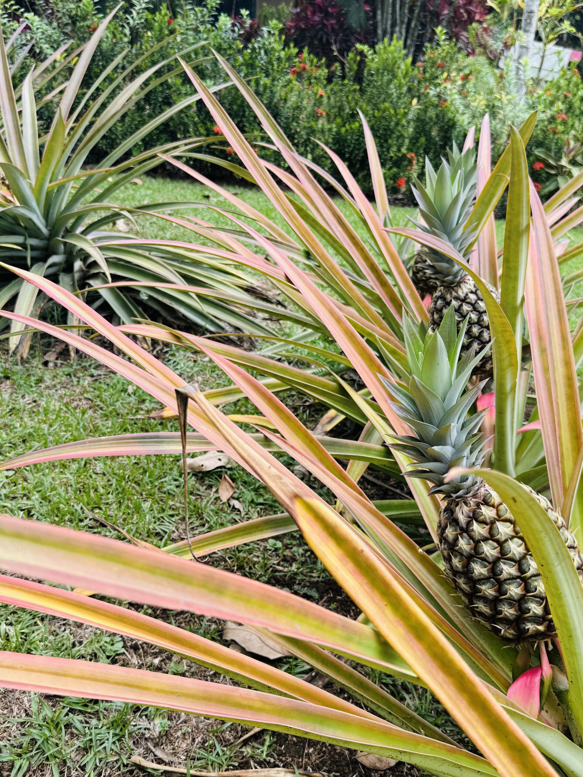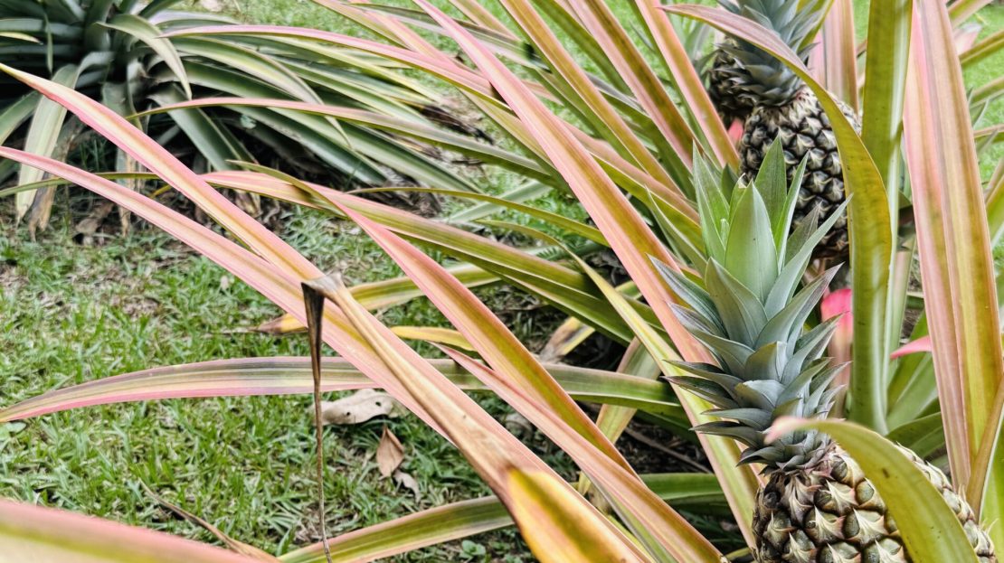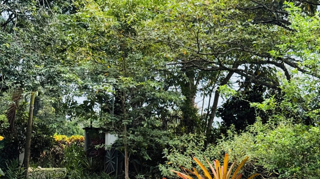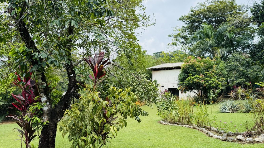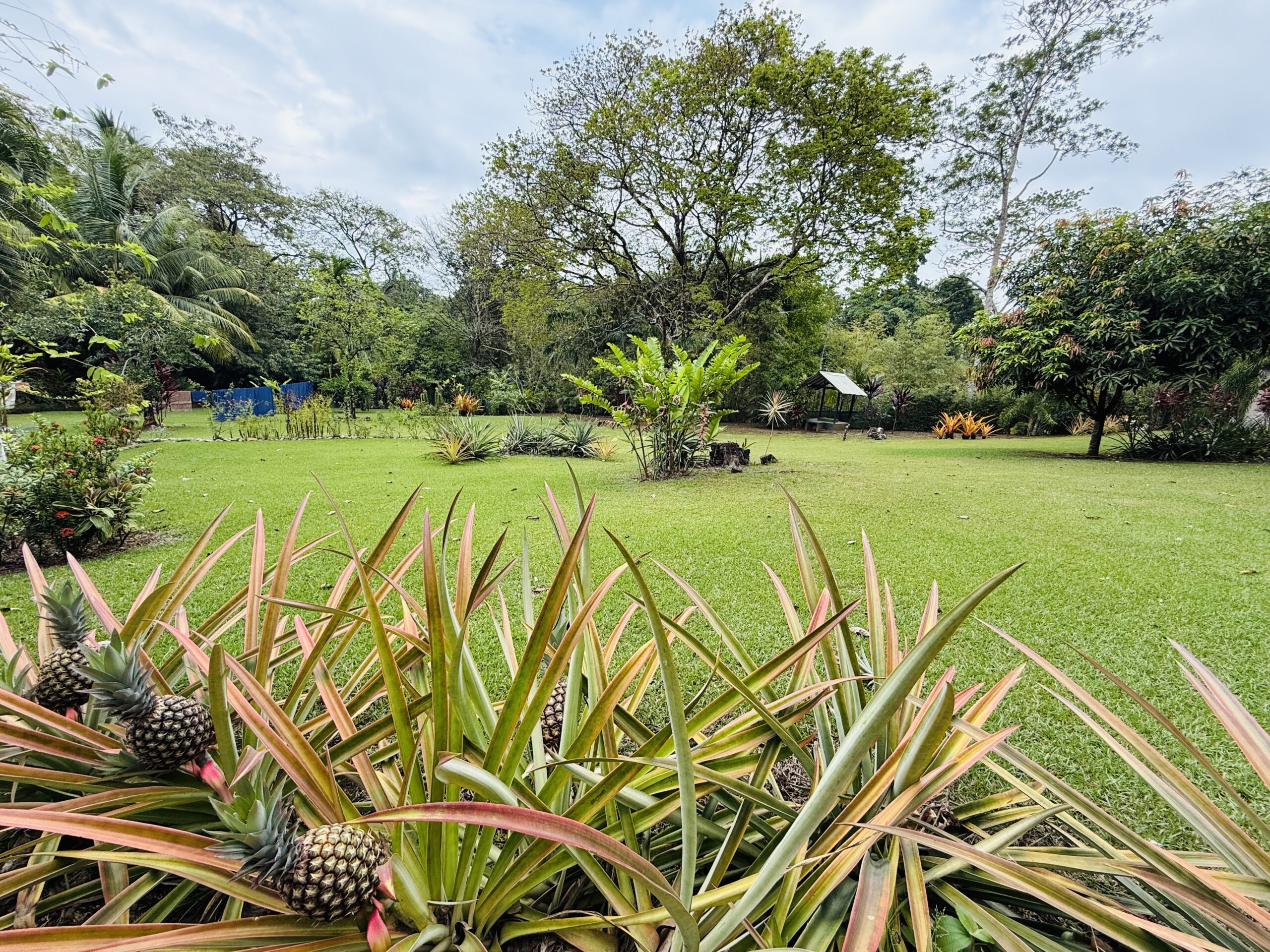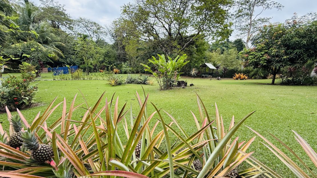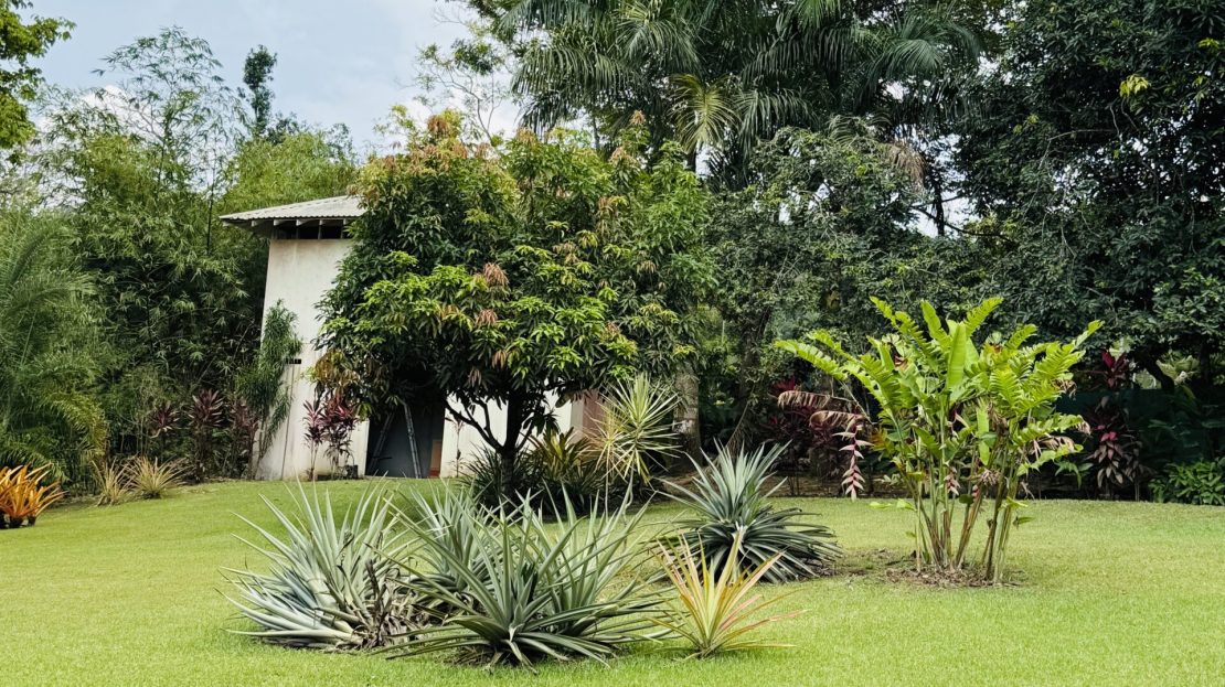 The surrounding grounds are a tropical paradise, finely maintained and planted with a variety of fruit trees, including mangosteen, lemon, soursop, mango, and coconut, along with vibrant pineapple plants.