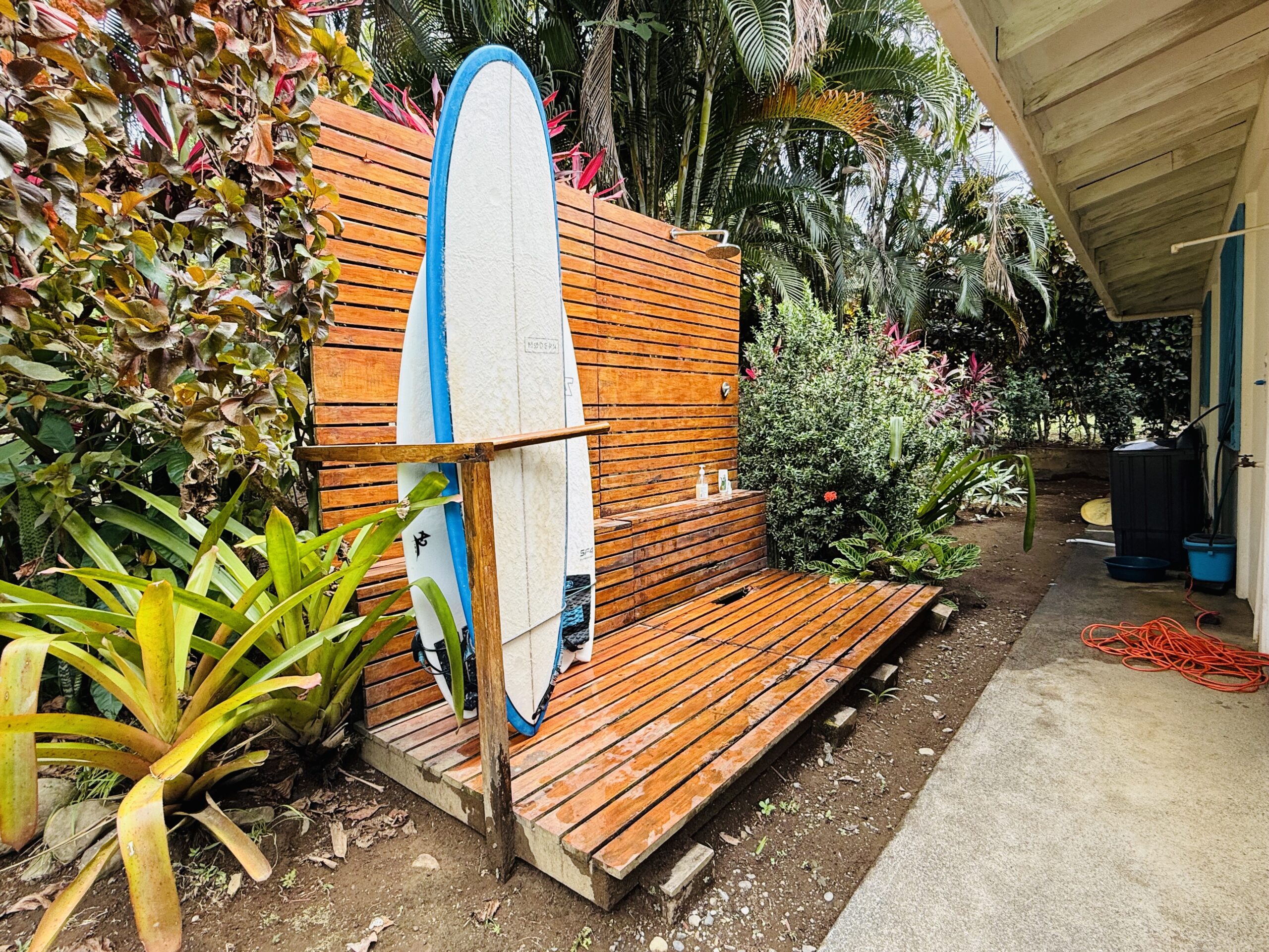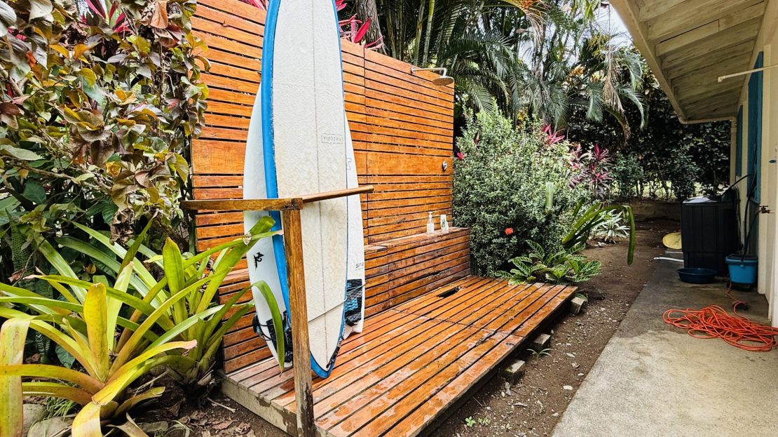 An outdoor shower adds a touch of coastal convenience, whether rinsing off after a beach session or just cooling down under the sky.
