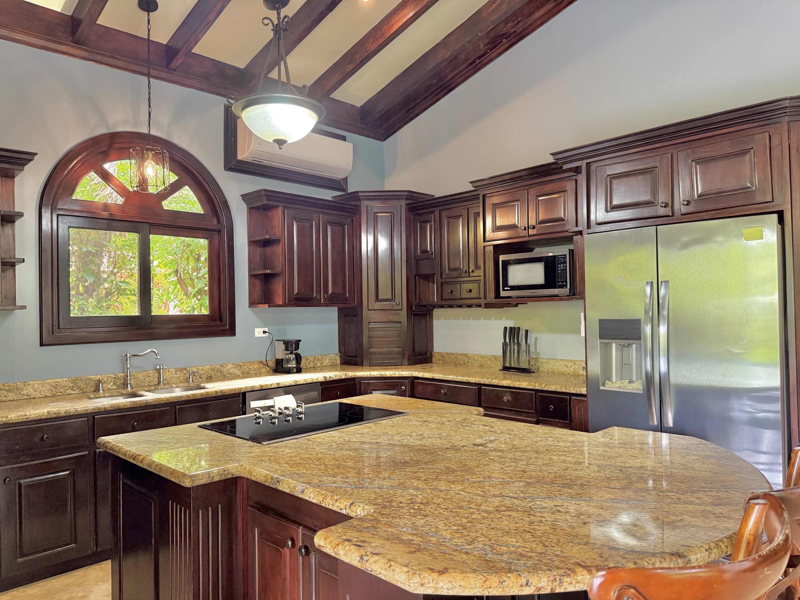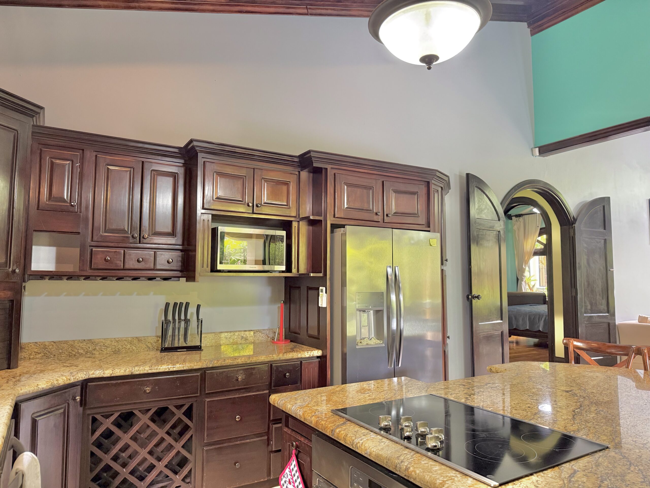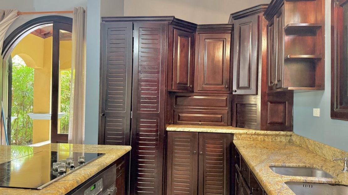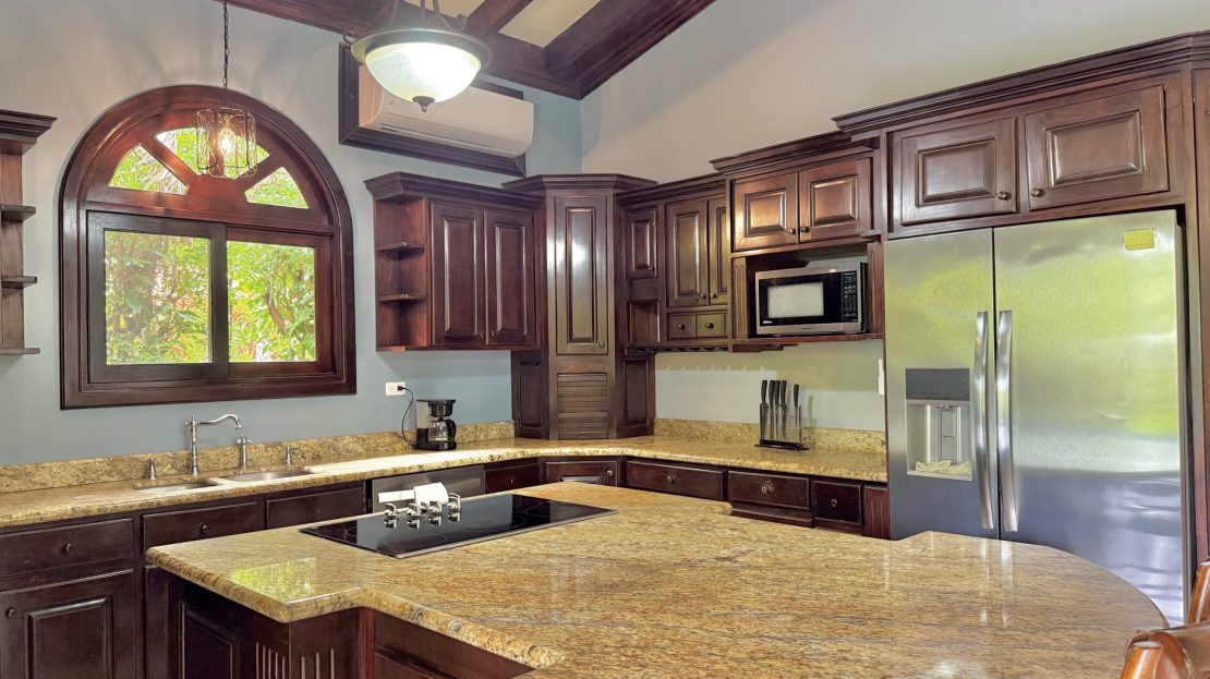 Gourmet Built-in Kitchen (cocina empotrada) with granite countertops, stainless-steel appliances, and rich wood cabinetry.