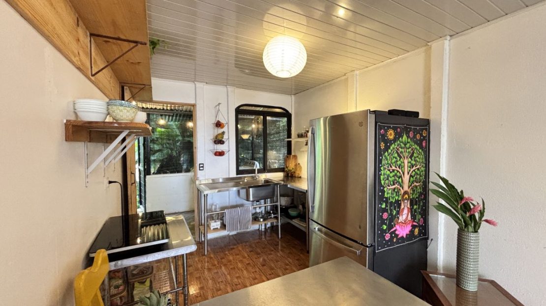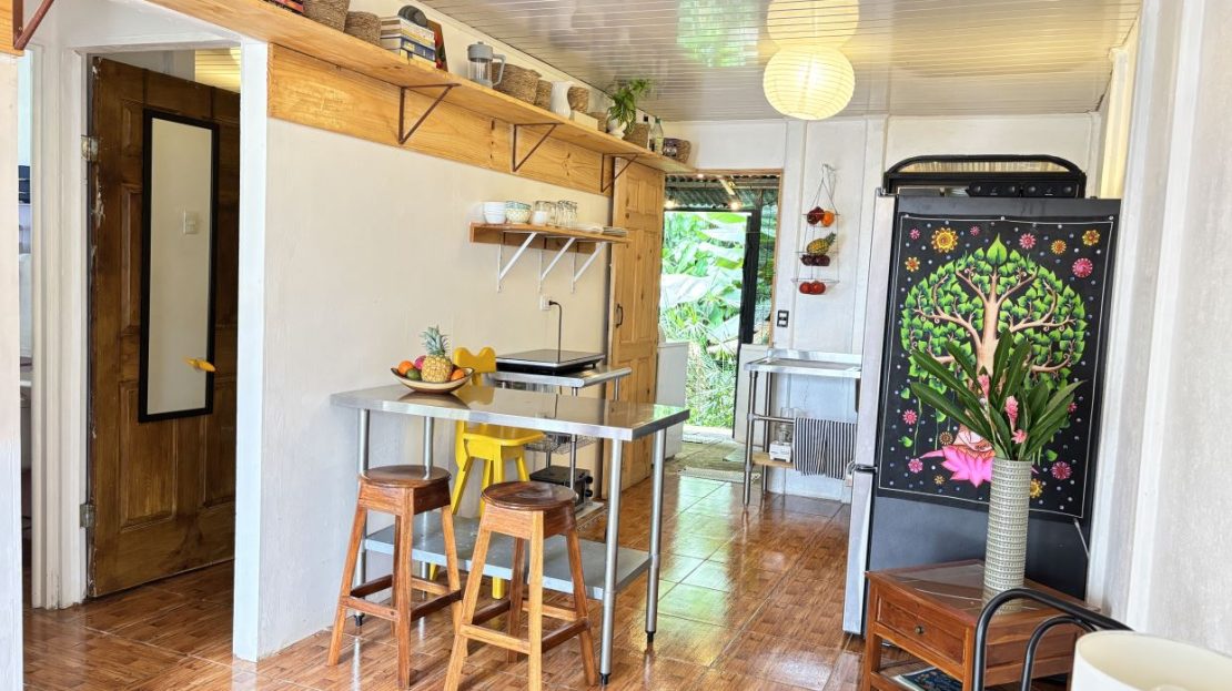 La cocina es luminosa y funcional, con mesones de acero inoxidable, repisas abiertas y vistas a la vegetación exuberante justo afuera de tu ventana. Los dormitorios son refugios tranquilos, mientras que el baño recibe luz natural y aire fresco para empezar el día de manera simple y renovadora.