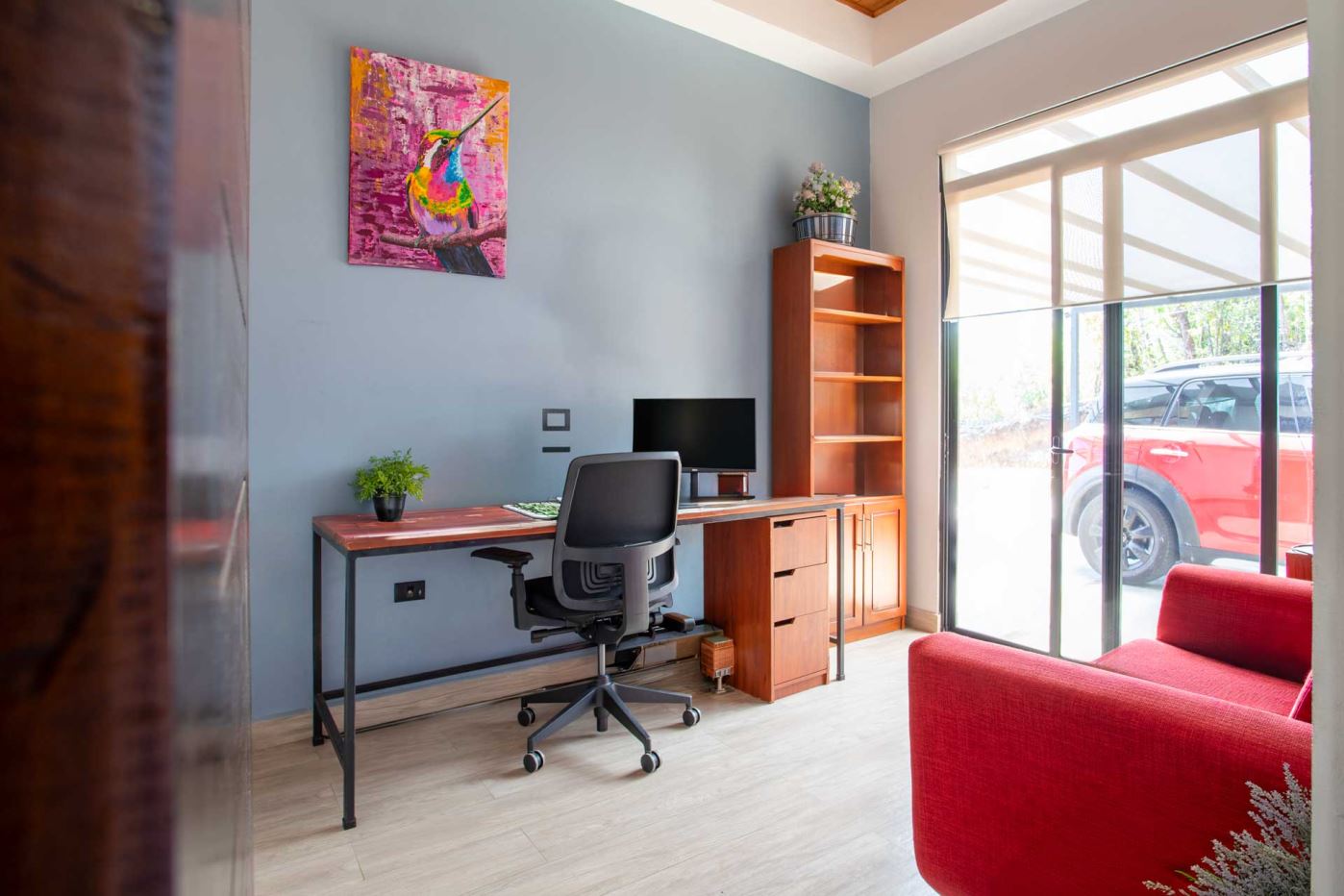 Eclectic modern meets traditional home with views in a farm setting located no more than 5 minutes from Atenas Center and 5 minutes from the new highway 27. The home features two private gates that leads to a hilltop with views of the Central Valley mountains and much of San Jose. The nice size yard is nicely landscaped throughout. The artesenal main formal entry wooden door leads to a inner terranium and office nook. The open living room has plenty of space for the formal dining room, living room and ample modern kitchen. There is nicely finished woodwork throughout the outside and inside of the home. The main extra large master bedroom suite leads to a bathroom with shower and tub and two double sinks with an added walk in closet. There are two nice size guest rooms with guest bathroom. There is an added room for an office or any other use. Come find your new Atenas home in Costa Rica!