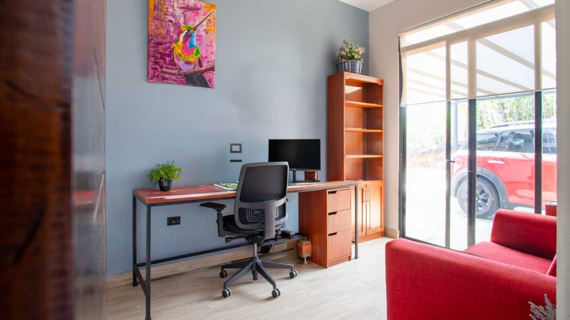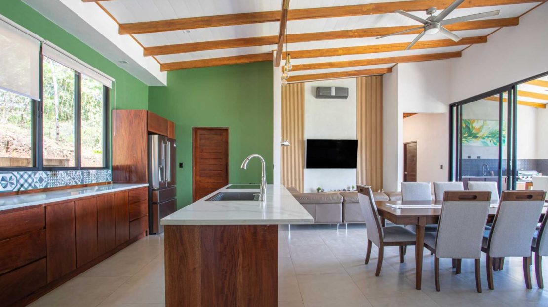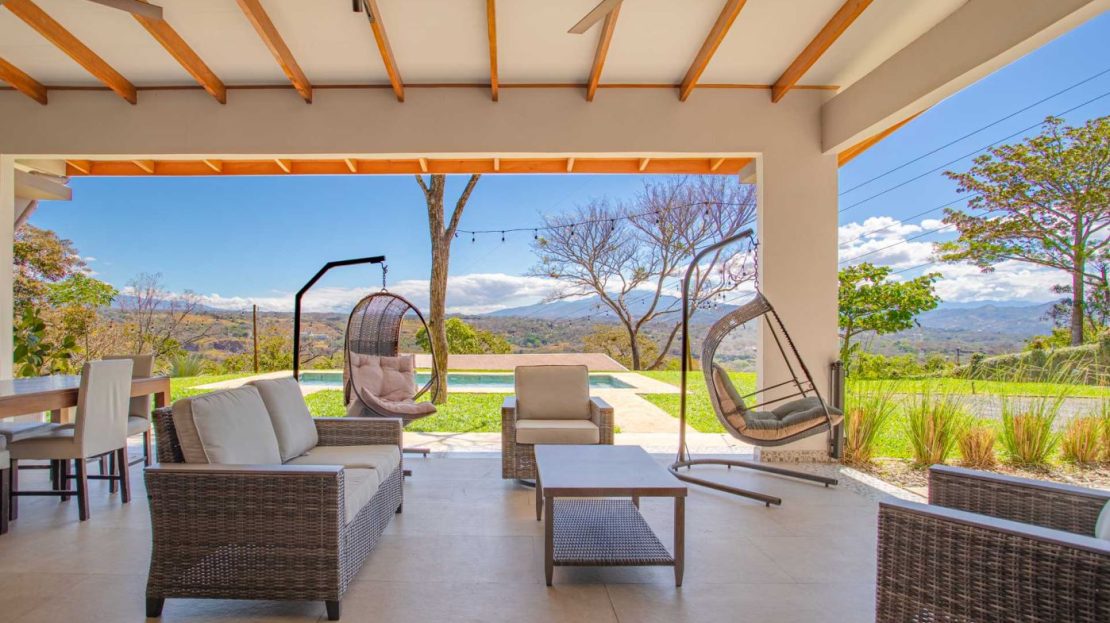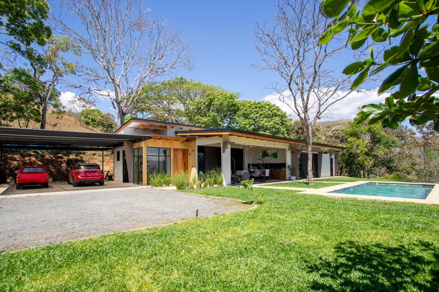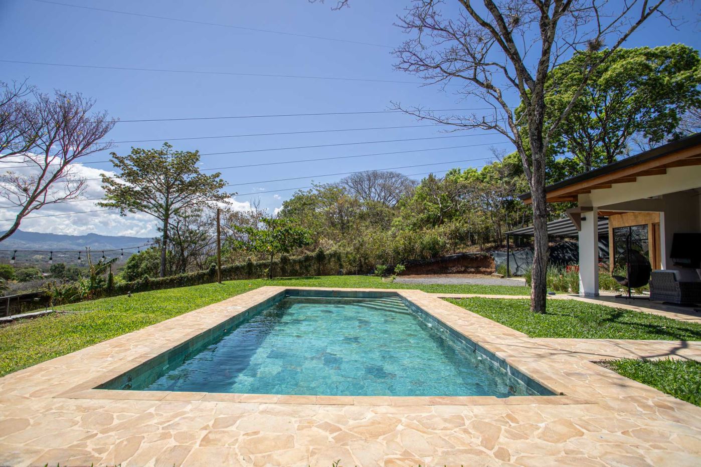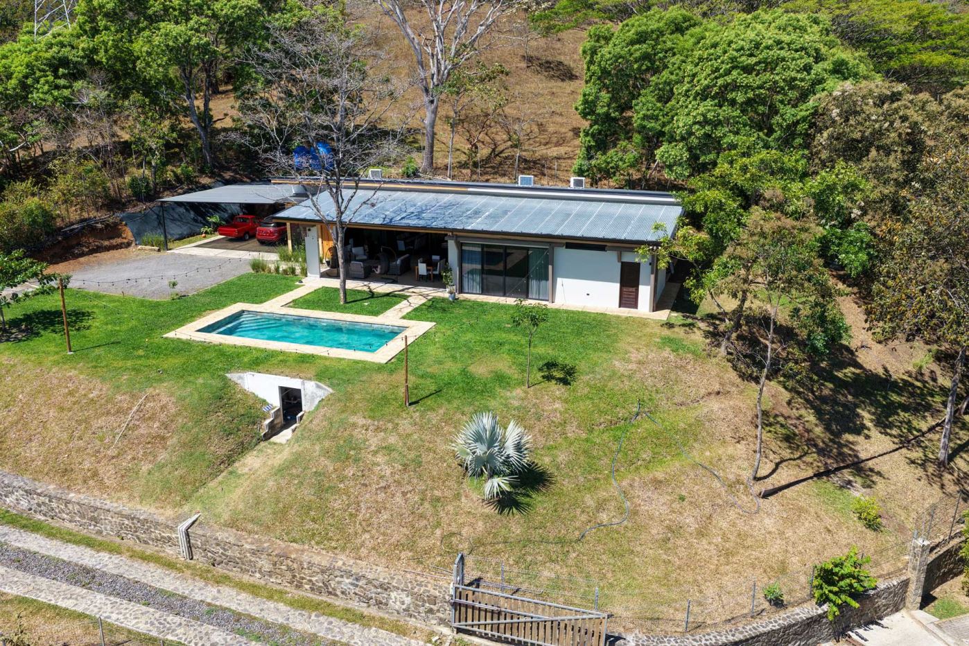 Eclectic modern meets traditional home with views in a farm setting located no more than 5 minutes from Atenas Center and 5 minutes from the new highway 27. The home features two private gates that leads to a hilltop with views of the Central Valley mountains and much of San Jose. The nice size yard is nicely landscaped throughout. The artesenal main formal entry wooden door leads to a inner terranium and office nook. The open living room has plenty of space for the formal dining room, living room and ample modern kitchen. There is nicely finished woodwork throughout the outside and inside of the home. The main extra large master bedroom suite leads to a bathroom with shower and tub and two double sinks with an added walk in closet. There are two nice size guest rooms with guest bathroom. There is an added room for an office or any other use with a third adjacent full bathroom. Outside there is a half bathroom for pool use. Come find your new Atenas home in Costa Rica!