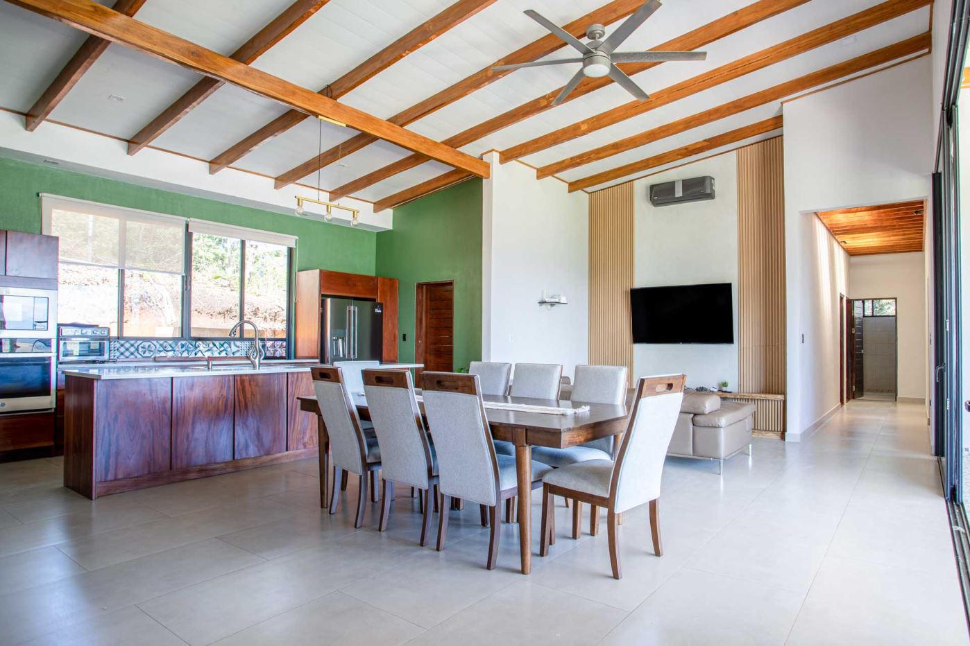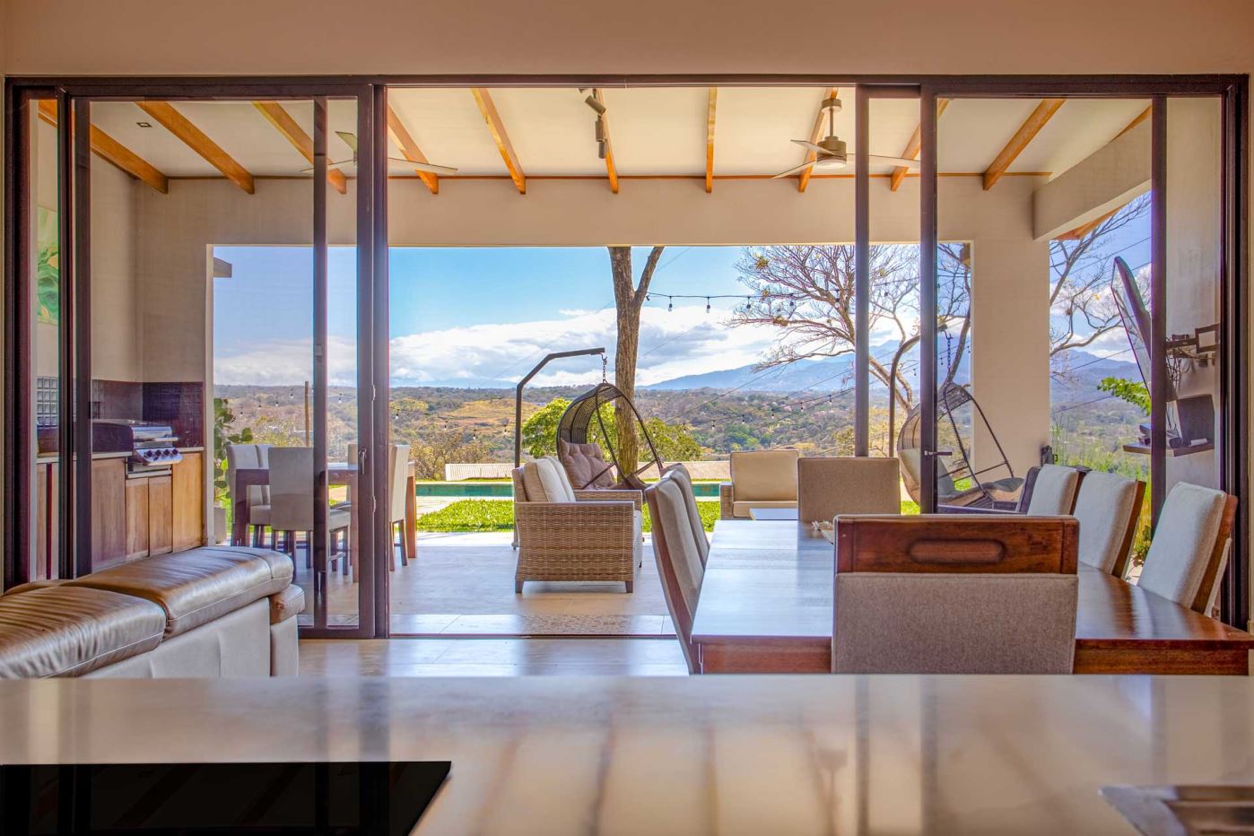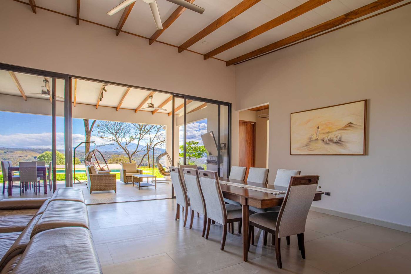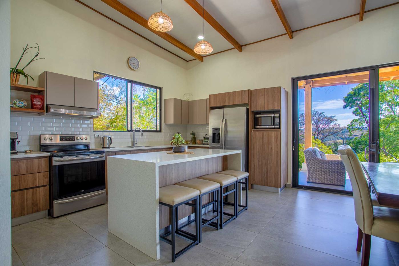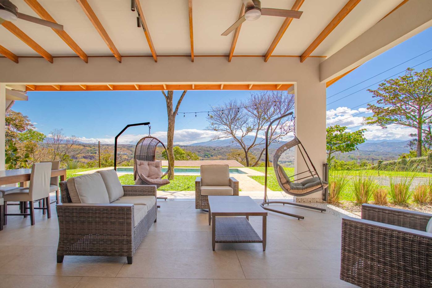 Eclectic modern meets traditional home with views in a farm setting located no more than 5 minutes from Atenas Center and 5 minutes from the new highway 27. The home features two private gates that leads to a hilltop with views of the Central Valley mountains and much of San Jose. The nice size yard is nicely landscaped throughout. The artesenal main formal entry wooden door leads to a inner terranium and office nook. The open living room has plenty of space for the formal dining room, living room and ample modern kitchen. There is nicely finished woodwork throughout the outside and inside of the home. The main extra large master bedroom suite leads to a bathroom with shower and tub and two double sinks with an added walk in closet. There are two nice size guest rooms with guest bathroom. There is an added room for an office or any other use with a third adjacent full bathroom. Outside there is a half bathroom for pool use. Come find your new Atenas home in Costa Rica!