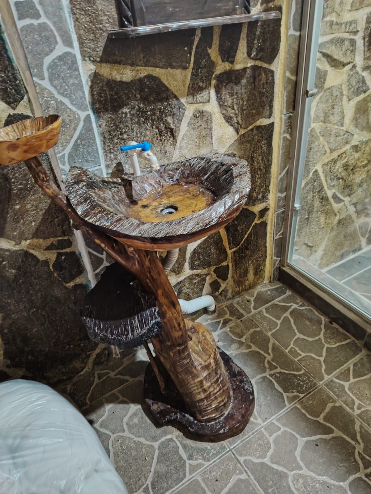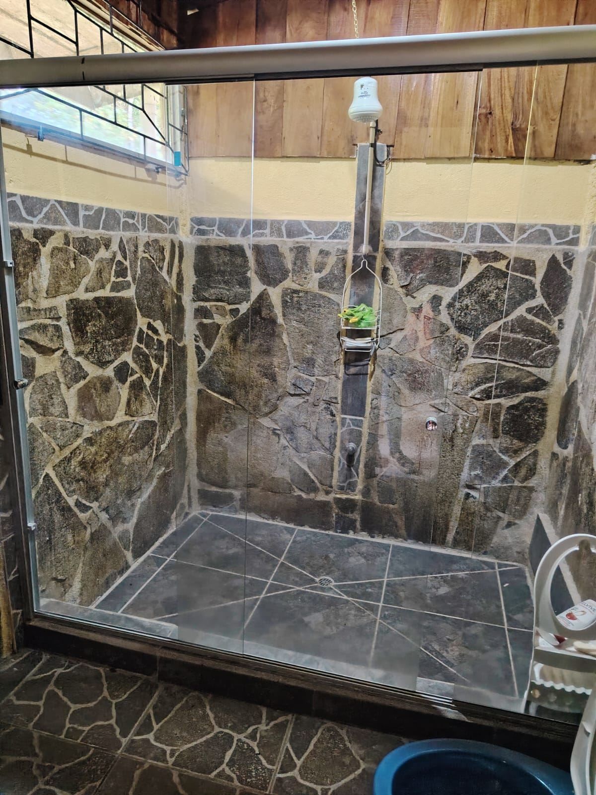 Baño rústico con acabados en madera, piedra natural y enchapes en piedra laja