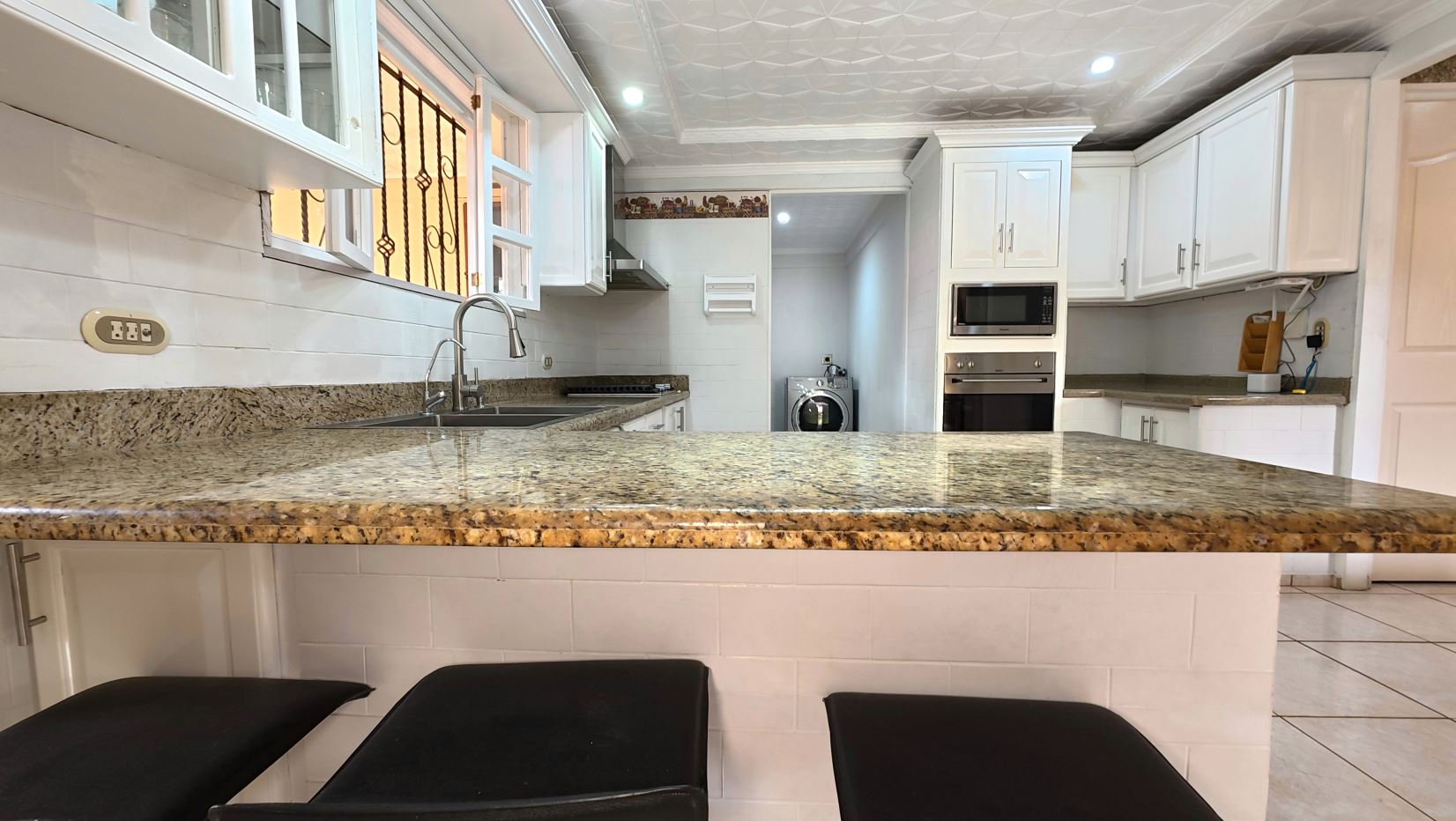 Cocina: con amplio espacio de almacenamiento, alacena independiente, sobres de granito, torre de hornos y refrigeradora con filtro de agua.