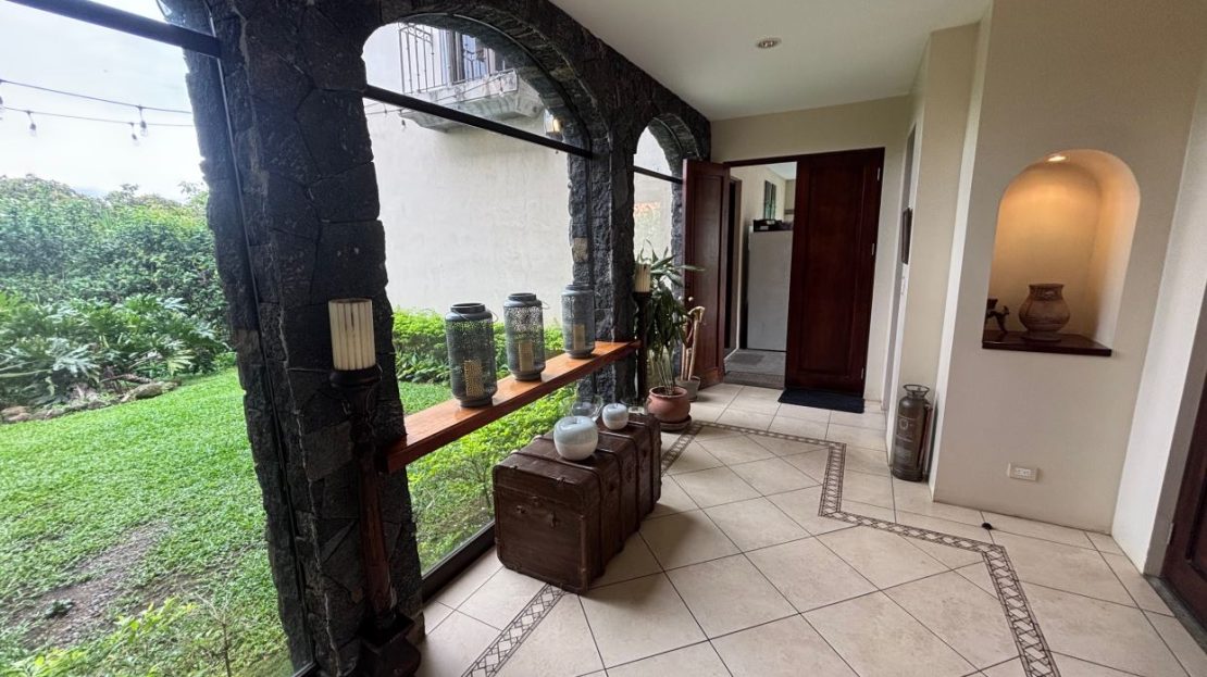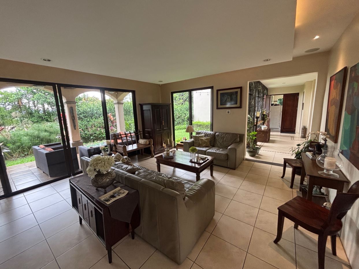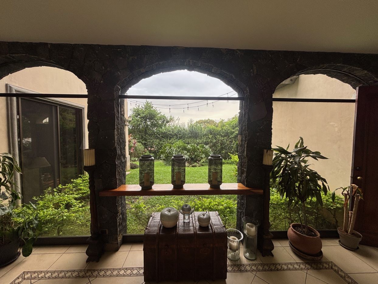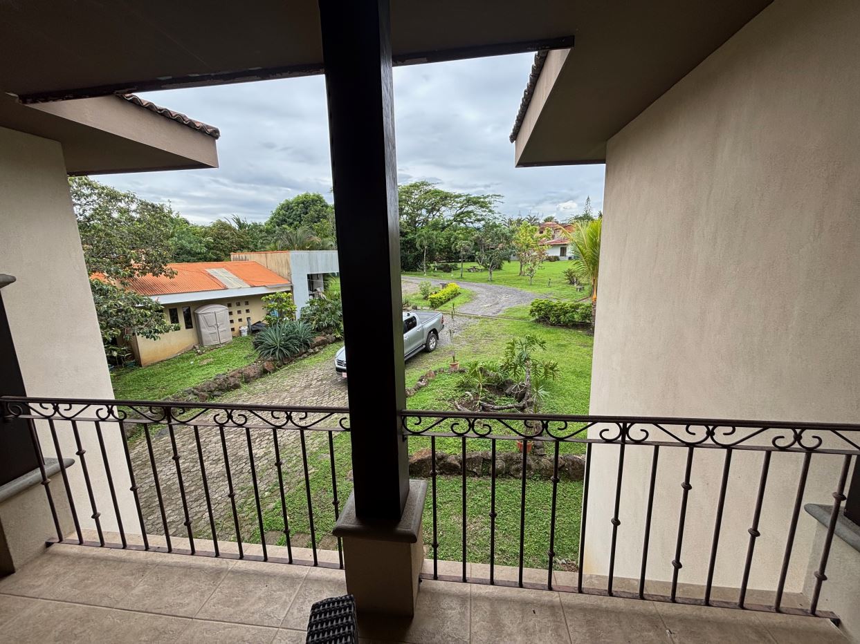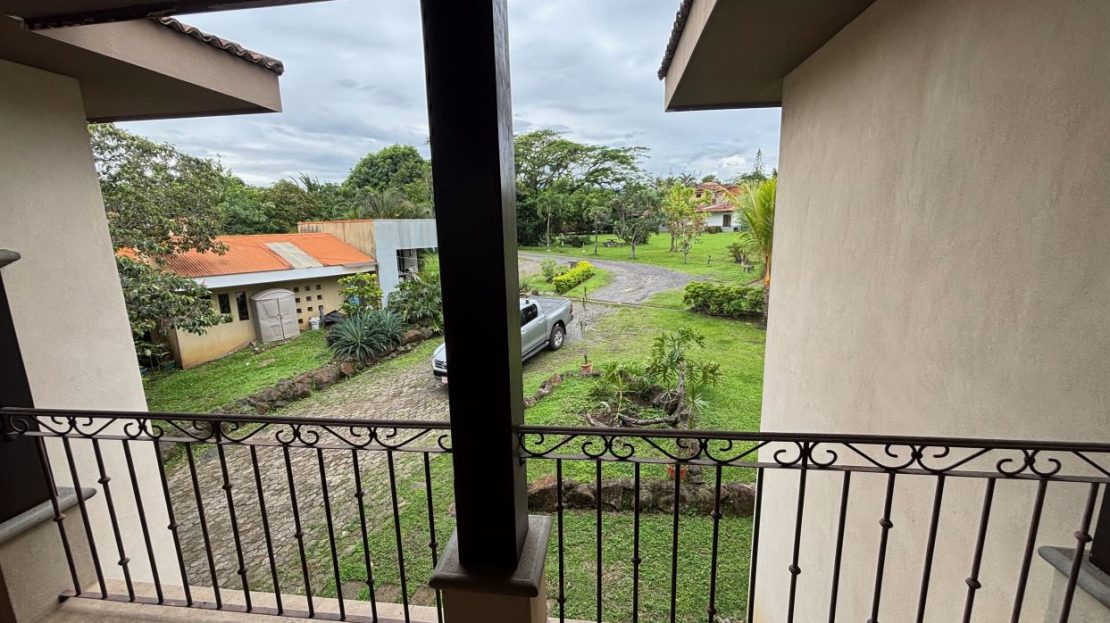 Elegant colonial style home in private community countryside setting. The gate and long private driveway into a small gated community leads to this home and features a nice size front yard with plenty of parking. The home’s formal entry leads way to a nice size living room, dining room and large kitchen. The back porch leads to large covered sitting and bbq area with an inviting back yard ideal for a private pool. On the opposite end of the first floor is a laundry area with 2 car garage and an adjacent service room and bathroom and guest half bathroom. The home has artesenal woodwork throughout. The staircase leads to a second level with a large tv or second living room. There is the main bedroom suite, bathroom and walk in closet with 3 additional bedrooms. The main bedroom has its own private balcony overlooking the courtyard. The property enjoys use of a common community bbq area and inviting pool area. The property is close to all of the La Guacima services and just a short drive to the new highway 27.