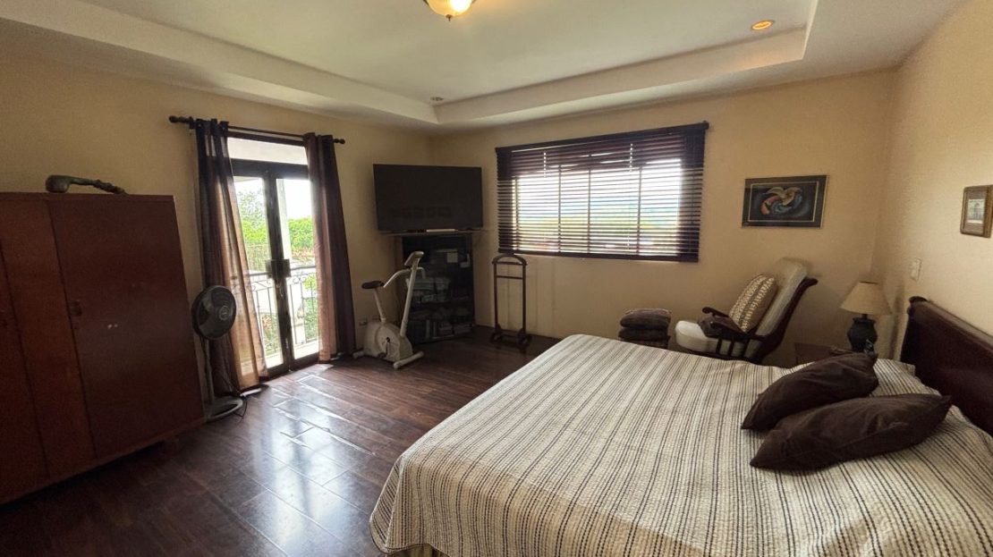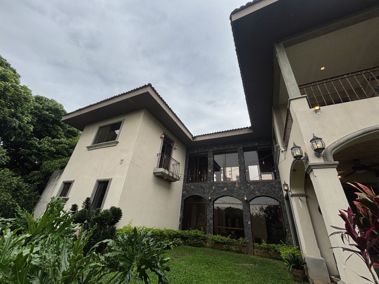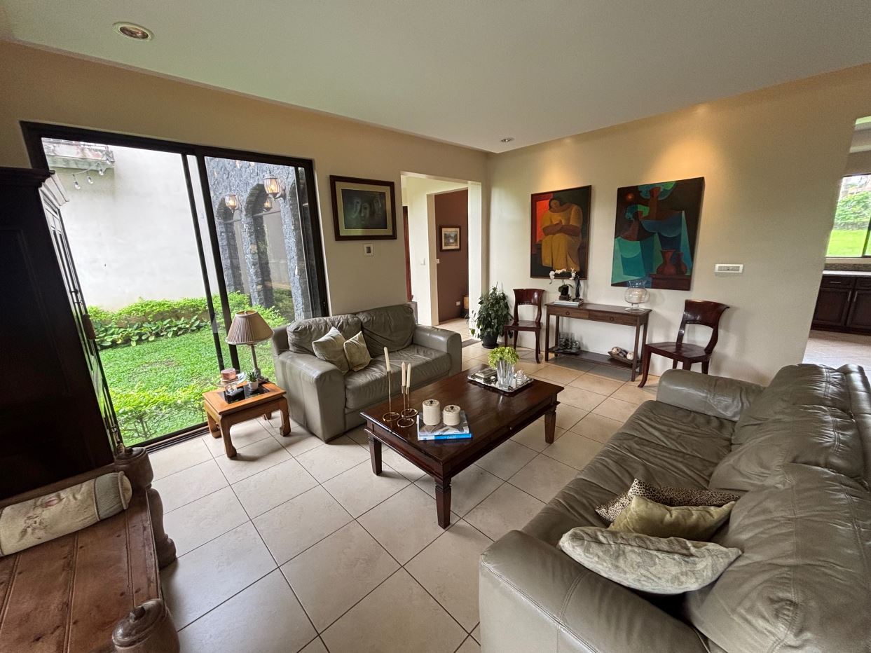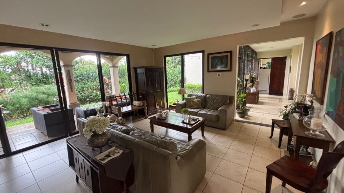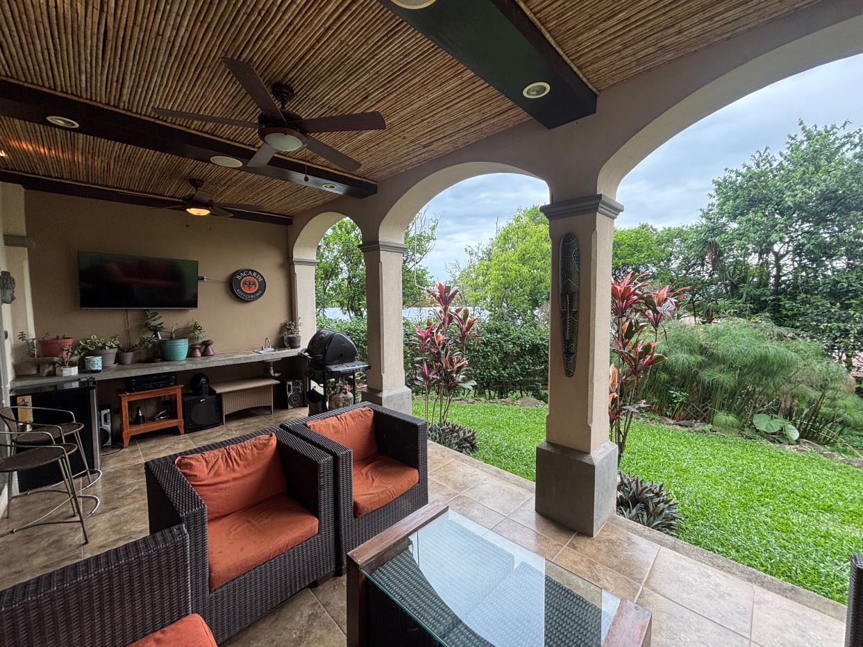 Elegant colonial style home in private community countryside setting. The gate and long private driveway into a small gated community leads to this home and features a nice size front yard with plenty of parking. The home’s formal entry leads way to a nice size living room, dining room and large kitchen. The back porch leads to large covered sitting and bbq area with an inviting back yard ideal for a private pool. On the opposite end of the first floor is a laundry area with 2 car garage and an adjacent service room and bathroom and guest half bathroom. The home has artesenal woodwork throughout. The staircase leads to a second level with a large tv or second living room. There is the main bedroom suite, bathroom and walk in closet with 3 additional bedrooms. The main bedroom has its own private balcony overlooking the courtyard. The property enjoys use of a common community bbq area and inviting pool area. The property is close to all of the La Guacima services and just a short drive to the new highway 27.