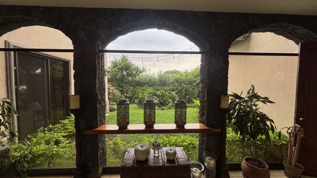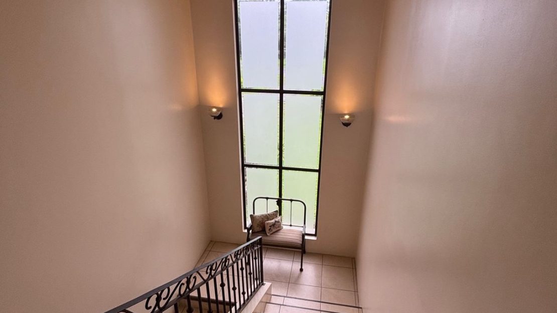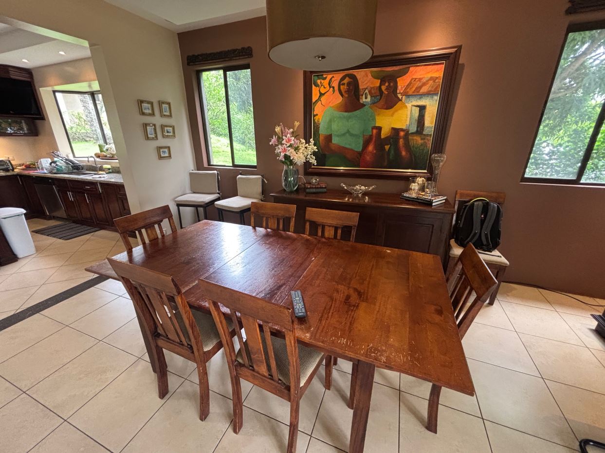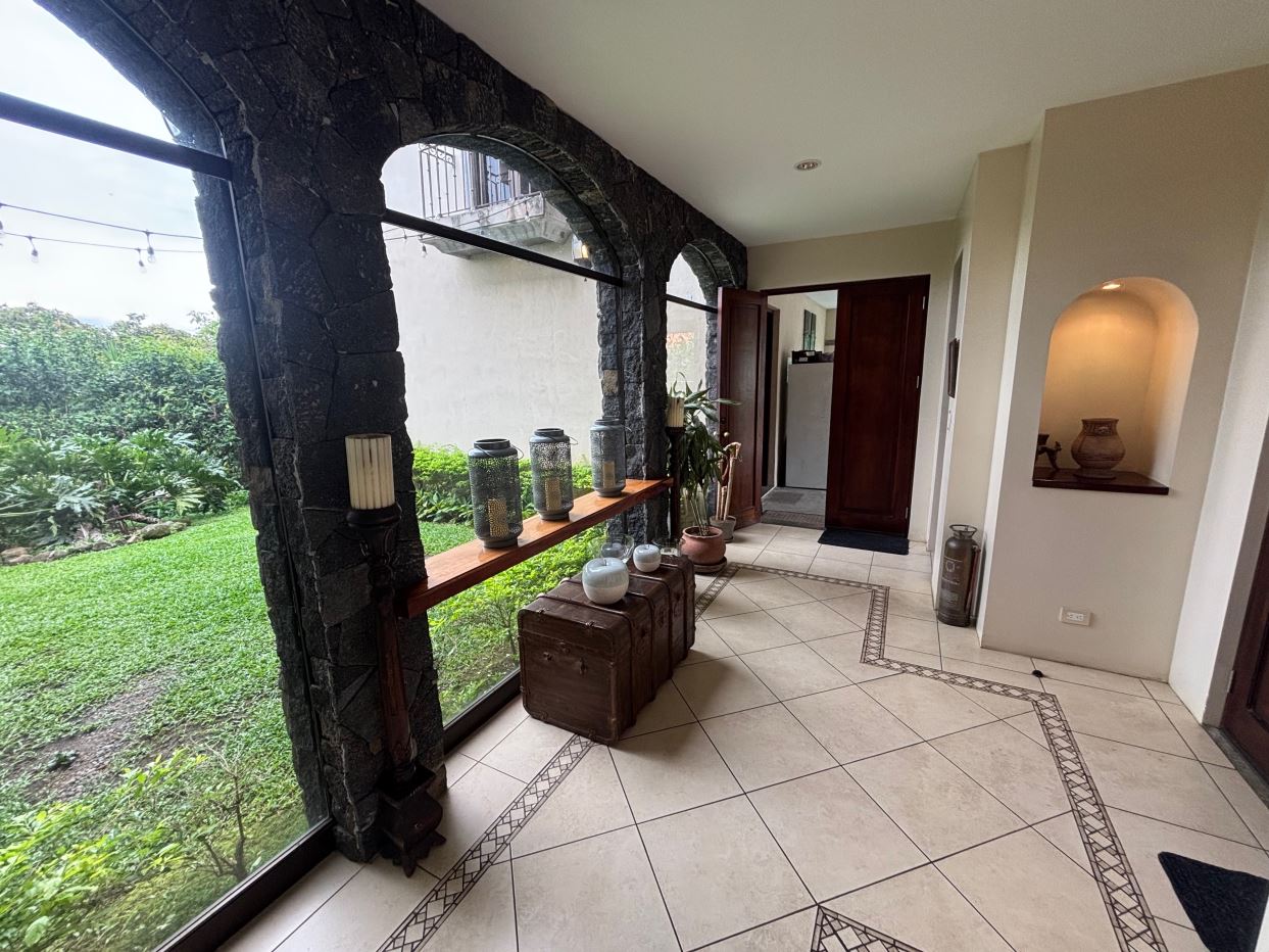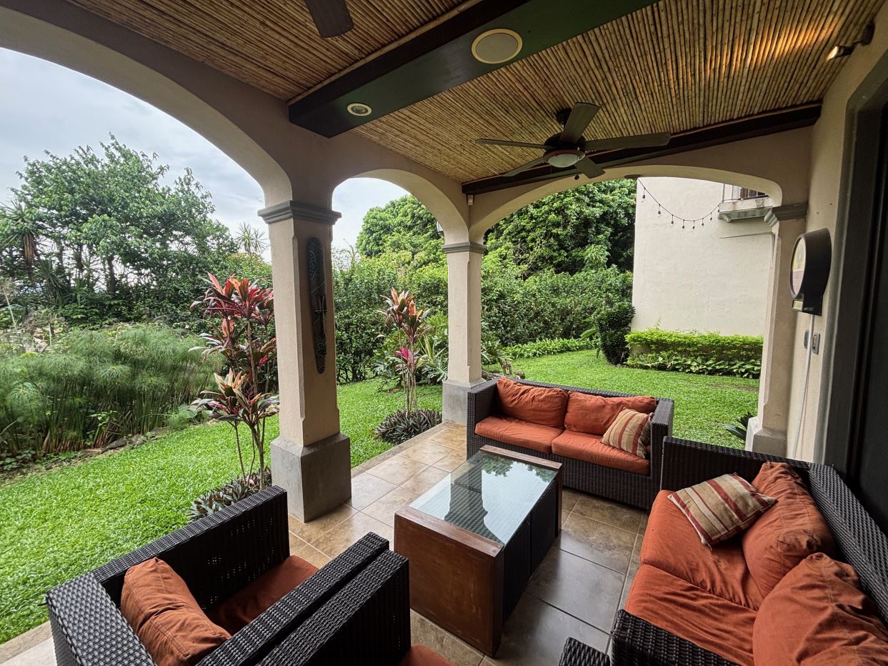 Elegant colonial style home in private community countryside setting. The gate and long private driveway into a small gated community leads to this home and features a nice size front yard with plenty of parking. The home’s formal entry leads way to a nice size living room, dining room and large kitchen. The back porch leads to large covered sitting and bbq area with an inviting back yard ideal for a private pool. On the opposite end of the first floor is a laundry area with 2 car garage and an adjacent service room and bathroom and guest half bathroom. The home has artesenal woodwork throughout. The staircase leads to a second level with a large tv or second living room. There is the main bedroom suite, bathroom and walk in closet with 3 additional bedrooms. The main bedroom has its own private balcony overlooking the courtyard. The property enjoys use of a common community bbq area and inviting pool area. The property is close to all of the La Guacima services and just a short drive to the new highway 27.