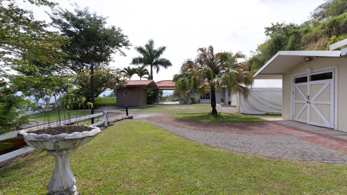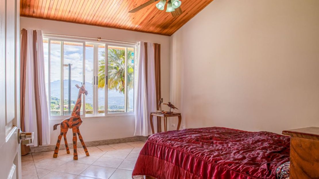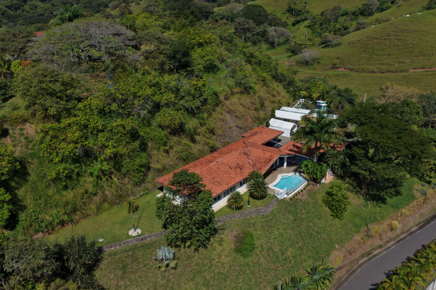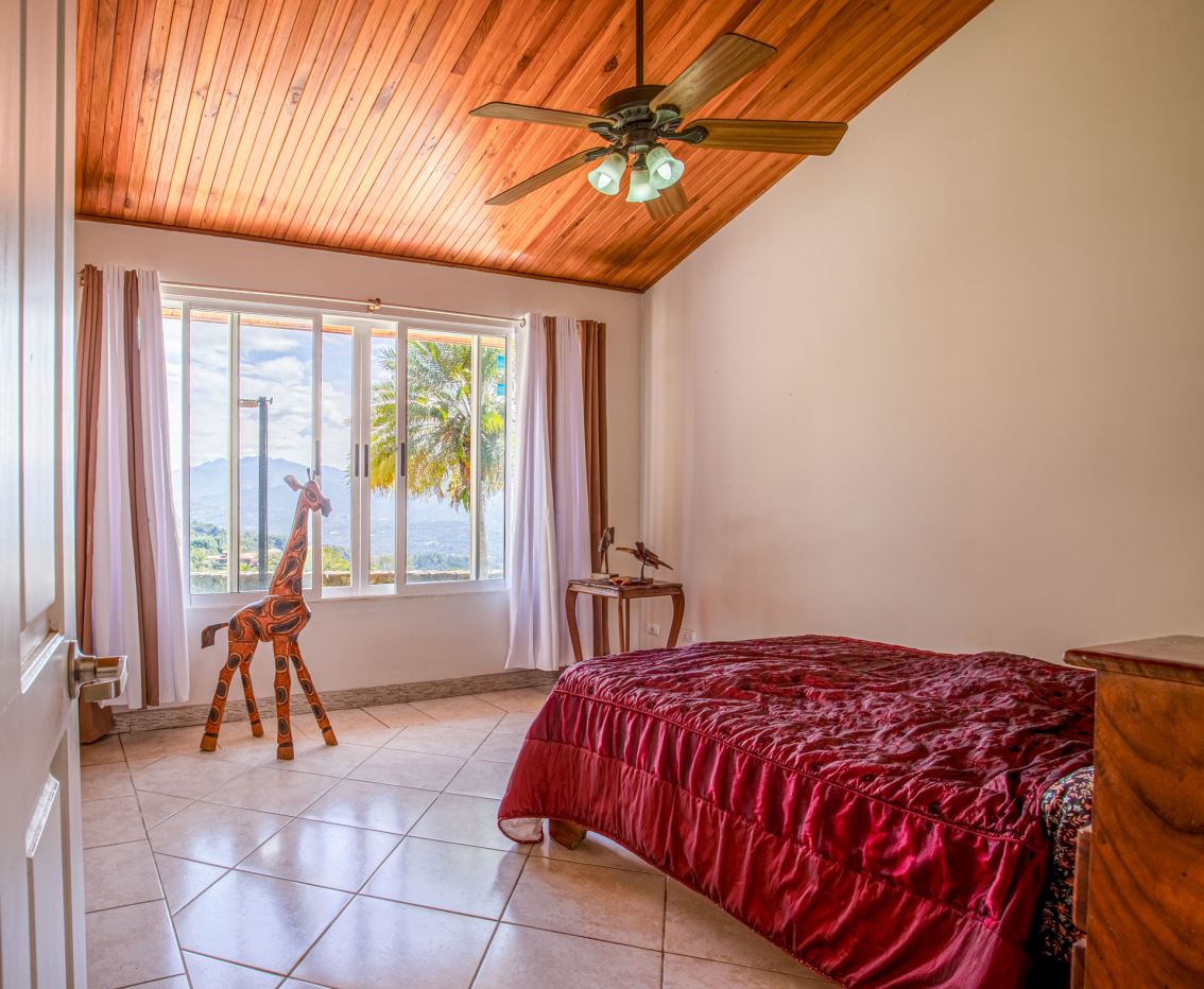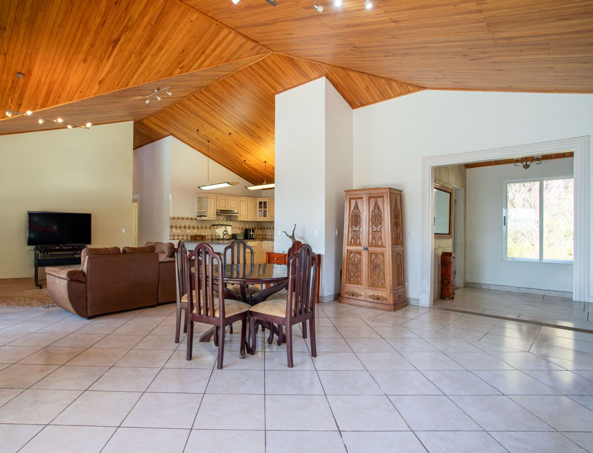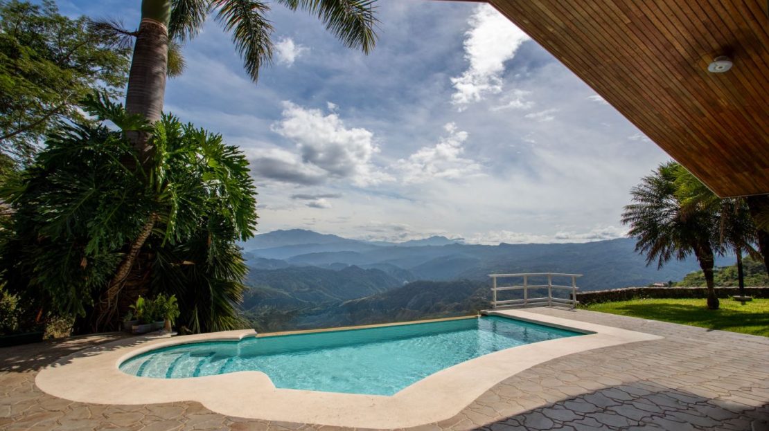 This elegant Mediterranean-Style Home is located in the exclusive community of Hacienda Atenas which is located just 6 minutes from town center but is in the relaxed countryside and cooler climate hills above Atenas Center with plenty of elbow room between the area’s homes. The long private entrance of the home features several storage and garage areas which can easily be refurbished to any number of uses. There’s plenty of parking ideal for a crowd and the property is nicely surrounded by manicured gardens. There is plenty of outside covered porch areas ideal for outside living. There’s a nice size swimming pool with an infinity edge with inviting deck areas that overlook the amazing area mountains.