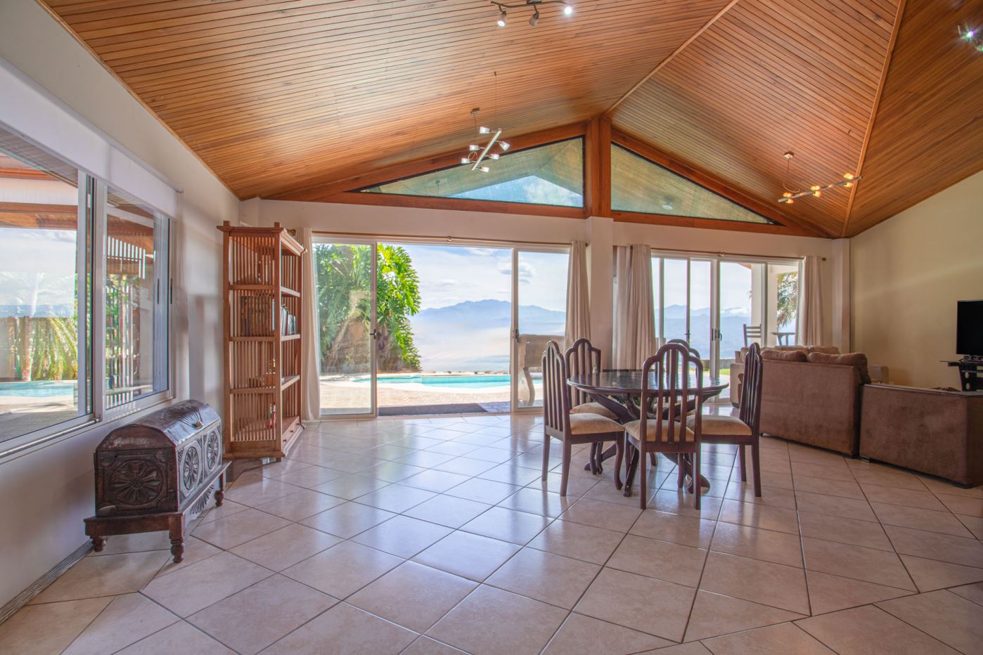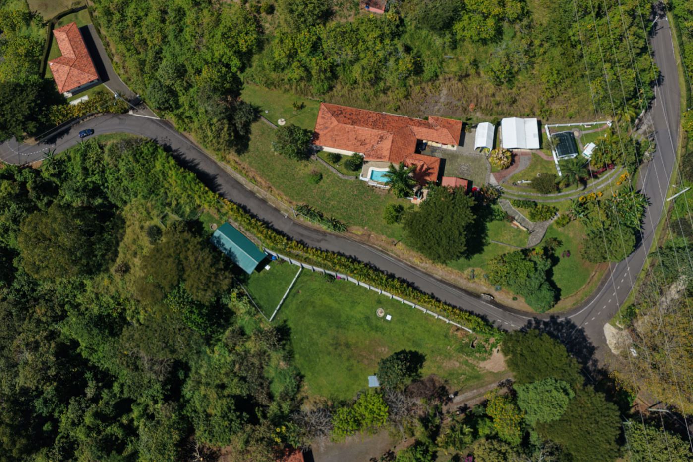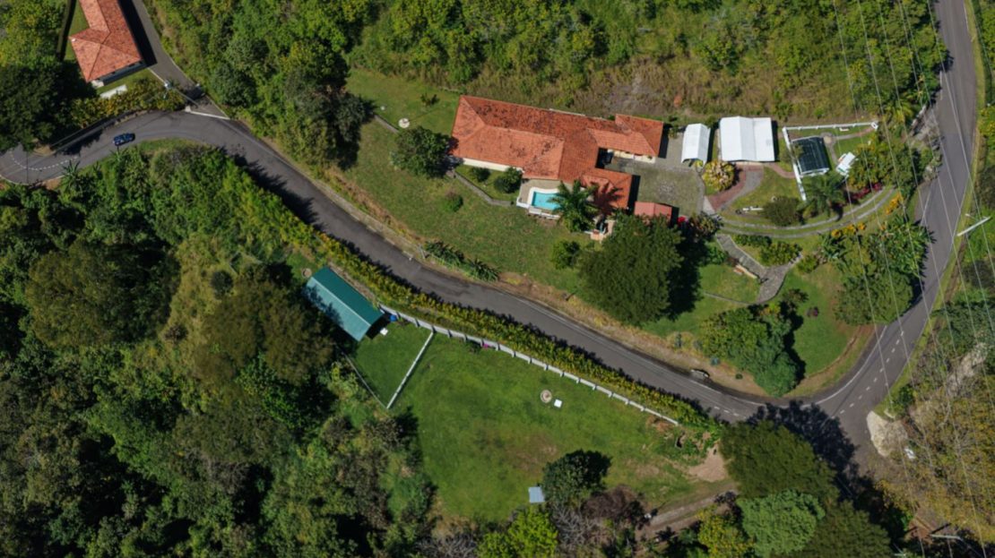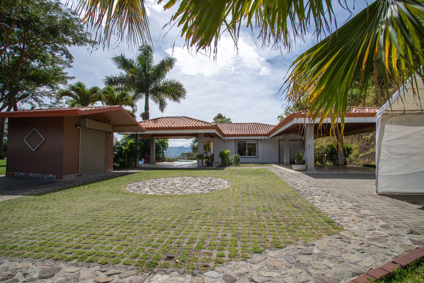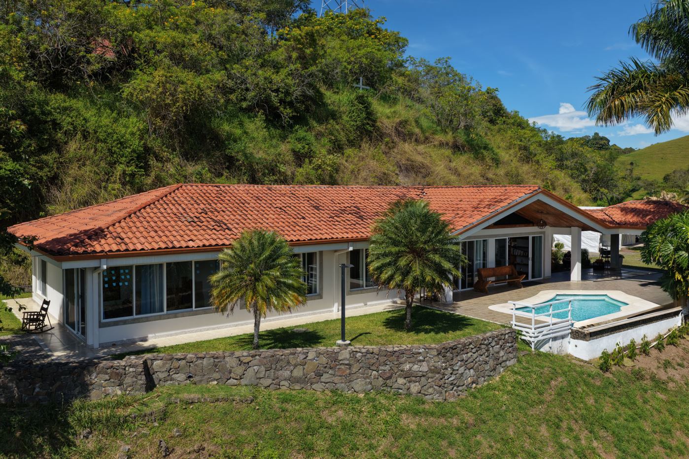 This elegant Mediterranean-Style Home is located in the exclusive community of Hacienda Atenas which is located just 6 minutes from town center but is in the relaxed countryside and cooler climate hills above Atenas Center with plenty of elbow room between the area’s homes. The long private entrance of the home features several storage and garage areas which can easily be refurbished to any number of uses. There’s plenty of parking ideal for a crowd and the property is nicely surrounded by manicured gardens. There is plenty of outside covered porch areas ideal for outside living. There’s a nice size swimming pool with an infinity edge with inviting deck areas that overlook the amazing area mountains.