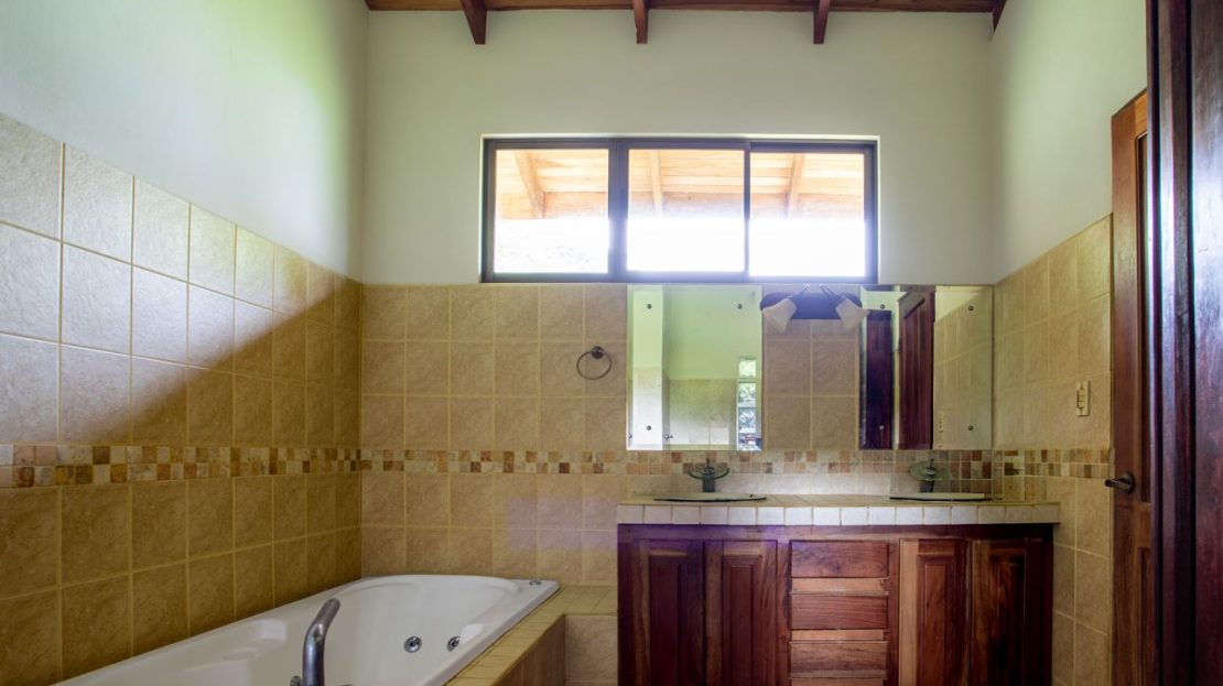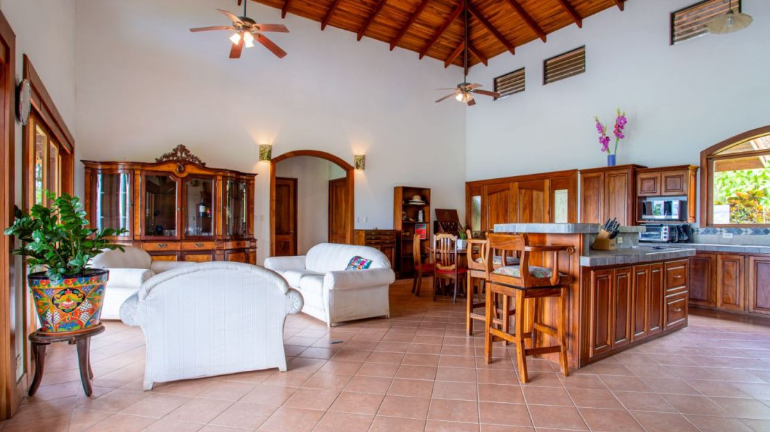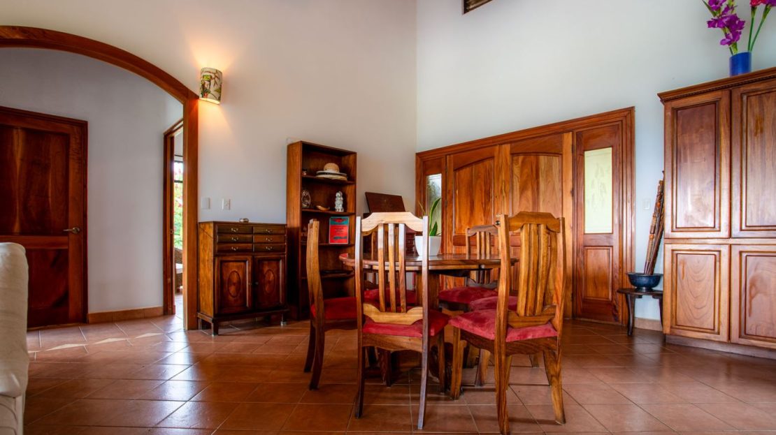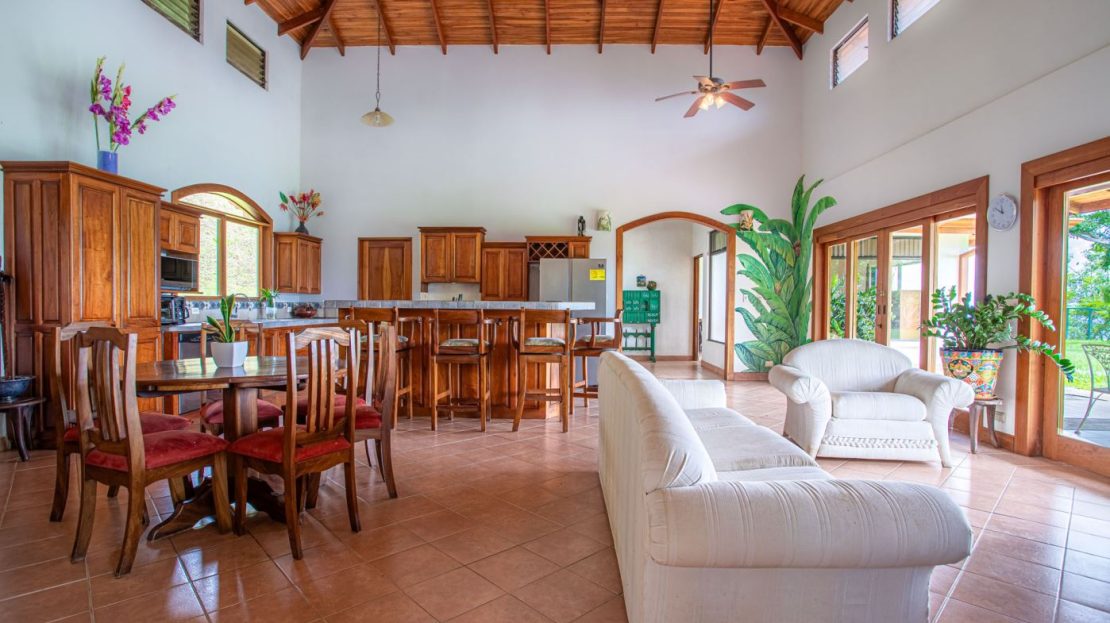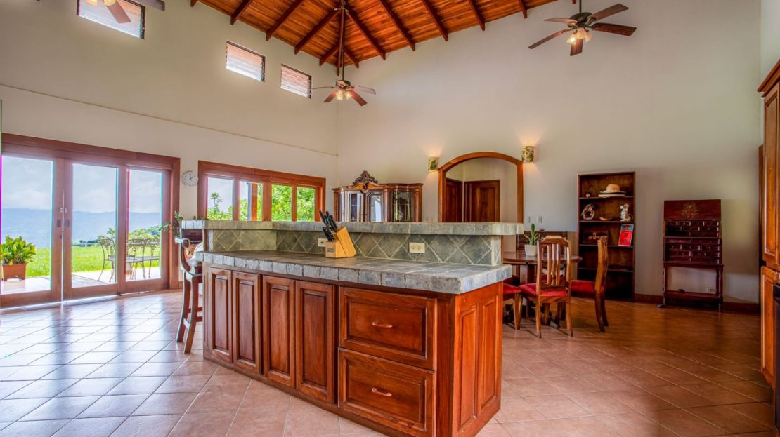 Elegant Spanish colonial style home with views in Hacienda Atenas is located just about eight minutes from Atenas Center and sits perched atop a resdential hill with amazing panoramic views of the area mountains and surrounded by nature. There is plenty of elbow room between the nieghbors in a secure and private setting with a nice size yard ideal for added builds or space available for a pool. The elegant entry into the home feautures tall cathedral ceilings with artesenal woodwork throughout. This space leads to two guest rooms and a guest bathroom, a small hallway leads to a guest half bath. On the opposite end of the guest rooms is a master bedroom suite. The large kitchen leads way to a laundry and secure storage area.