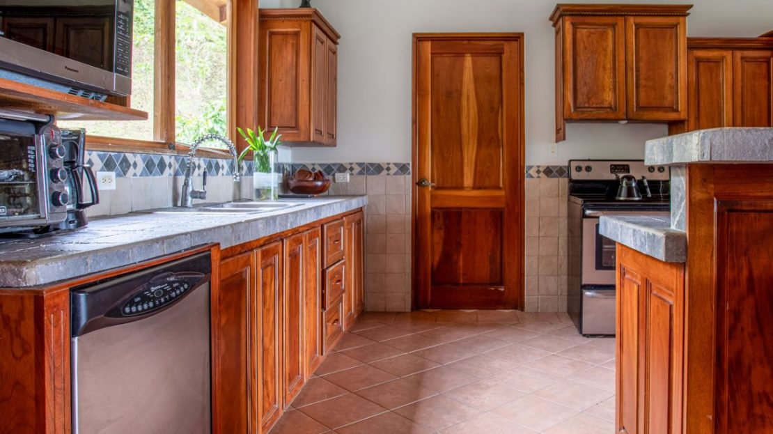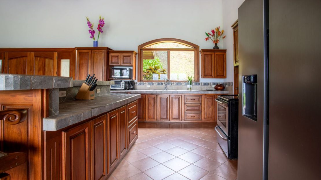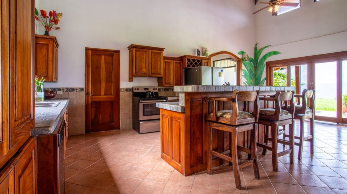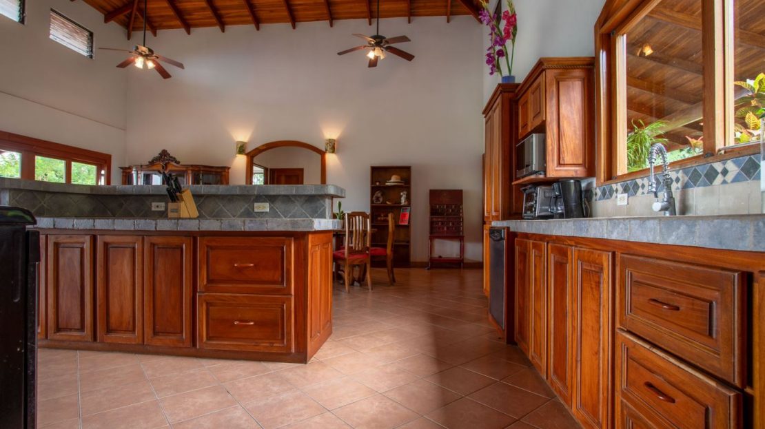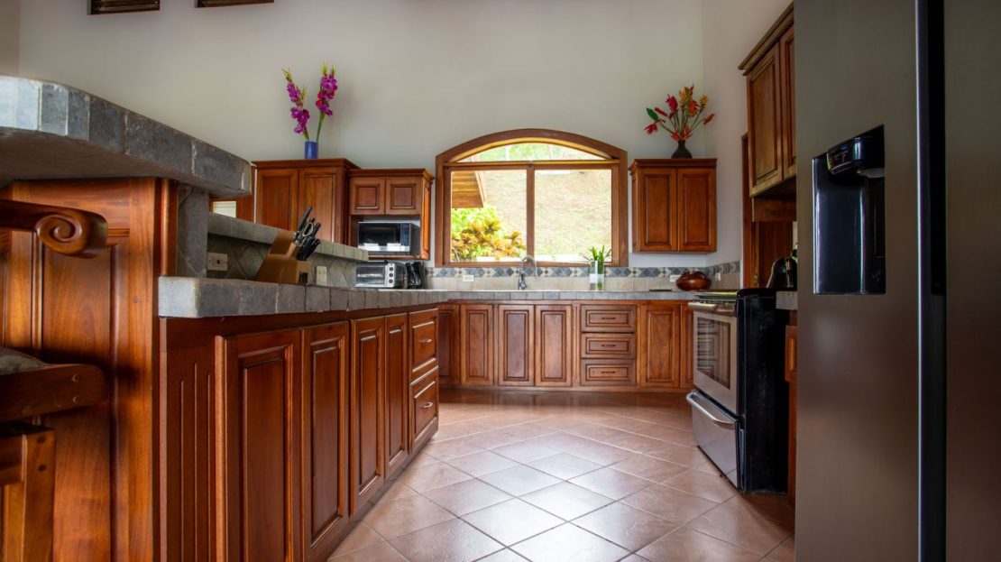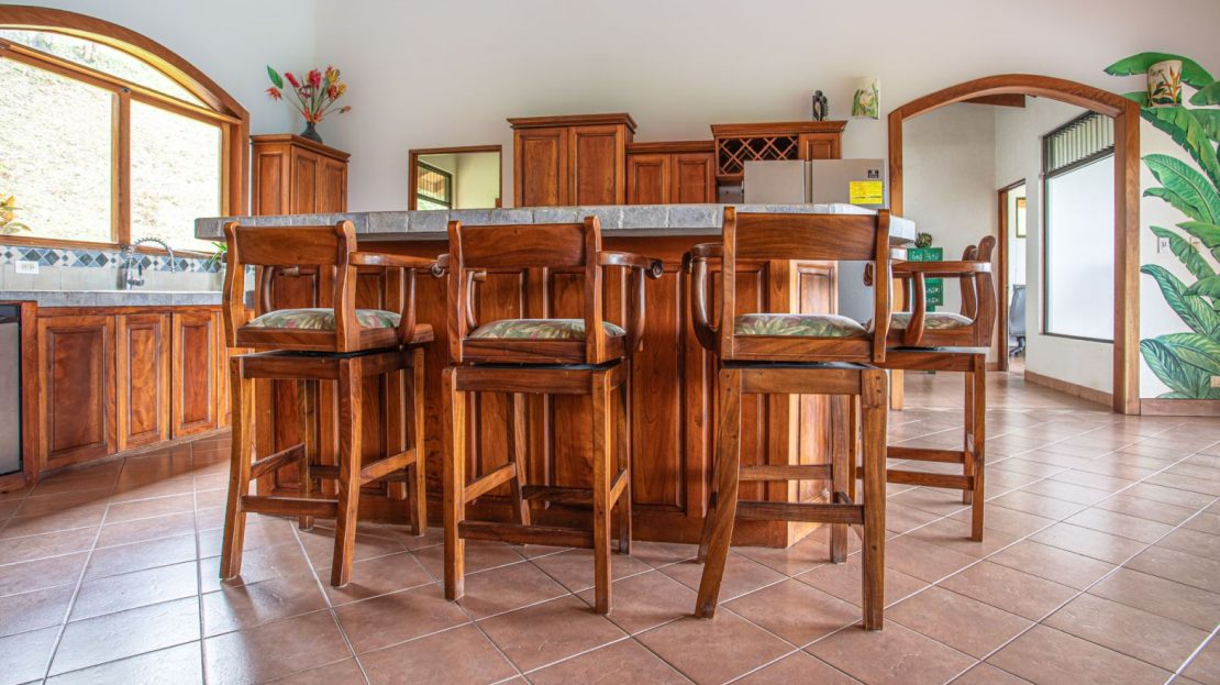 Elegant Spanish colonial style home with views in Hacienda Atenas is located just about eight minutes from Atenas Center and sits perched atop a resdential hill with amazing panoramic views of the area mountains and surrounded by nature. There is plenty of elbow room between the nieghbors in a secure and private setting with a nice size yard ideal for added builds or space available for a pool. The elegant entry into the home feautures tall cathedral ceilings with artesenal woodwork throughout. This space leads to two guest rooms and a guest bathroom, a small hallway leads to a guest half bath. On the opposite end of the guest rooms is a master bedroom suite. The large kitchen leads way to a laundry and secure storage area.