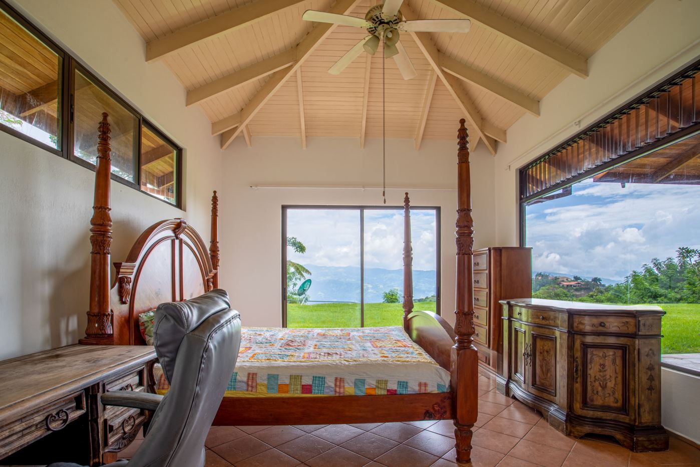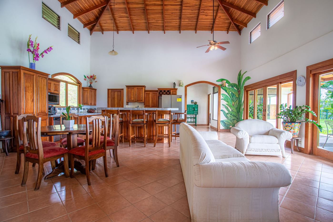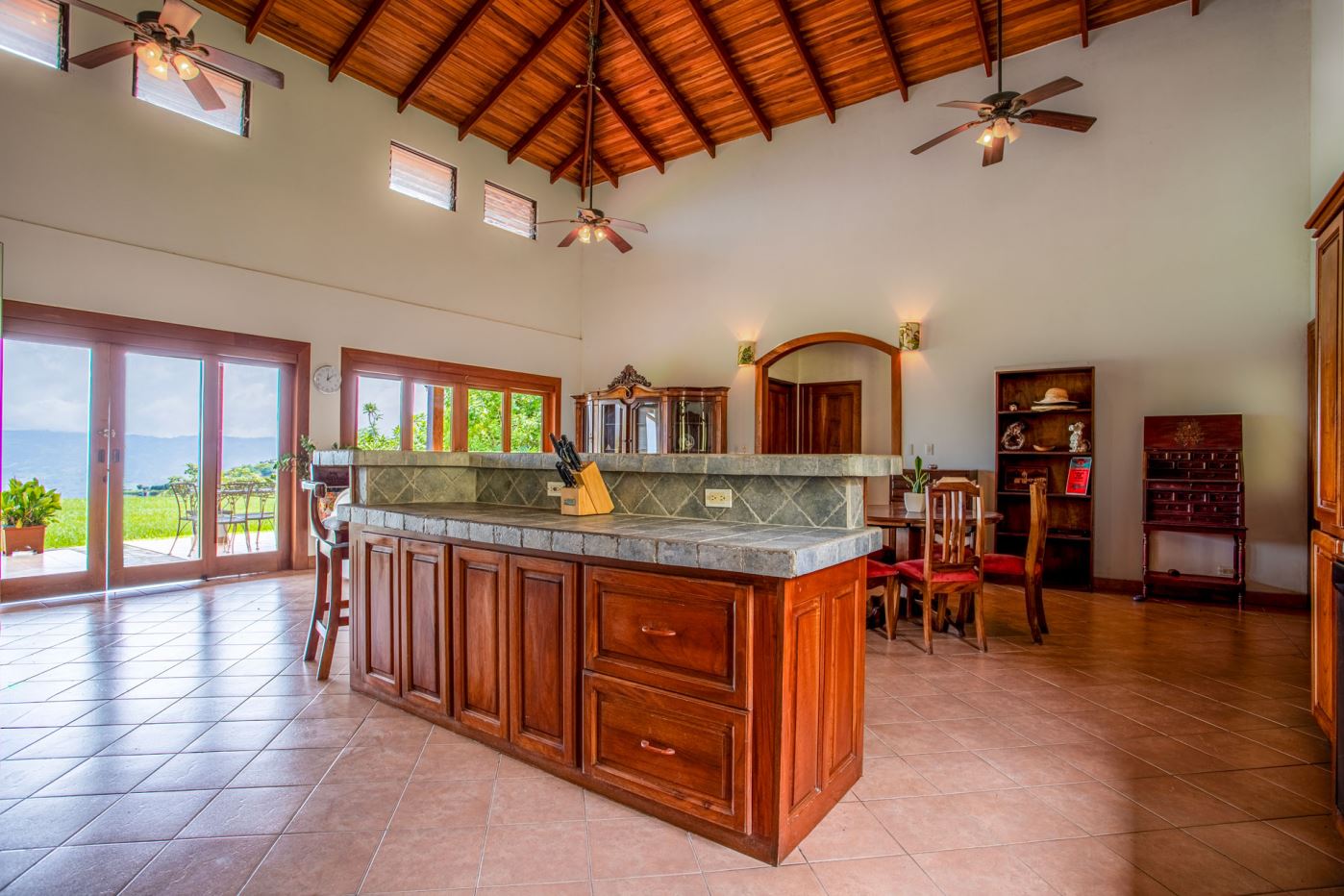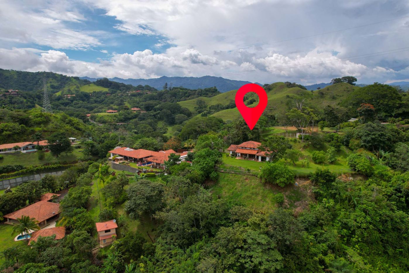 Elegant Spanish colonial style home with views in Hacienda Atenas is located just about eight minutes from Atenas Center and sits perched atop a resdential hill with amazing panoramic views of the area mountains and surrounded by nature. There is plenty of elbow room between the nieghbors in a secure and private setting with a nice size yard ideal for added builds or space available for a pool. The elegant entry into the home feautures tall cathedral ceilings with artesenal woodwork throughout. This space leads to two guest rooms and a guest bathroom, a small hallway leads to a guest half bath. On the opposite end of the guest rooms is a master bedroom suite. The large kitchen leads way to a laundry and secure storage area.