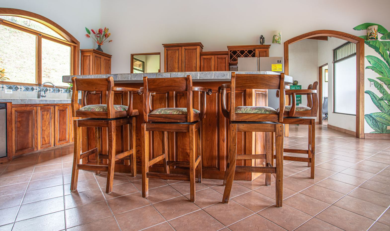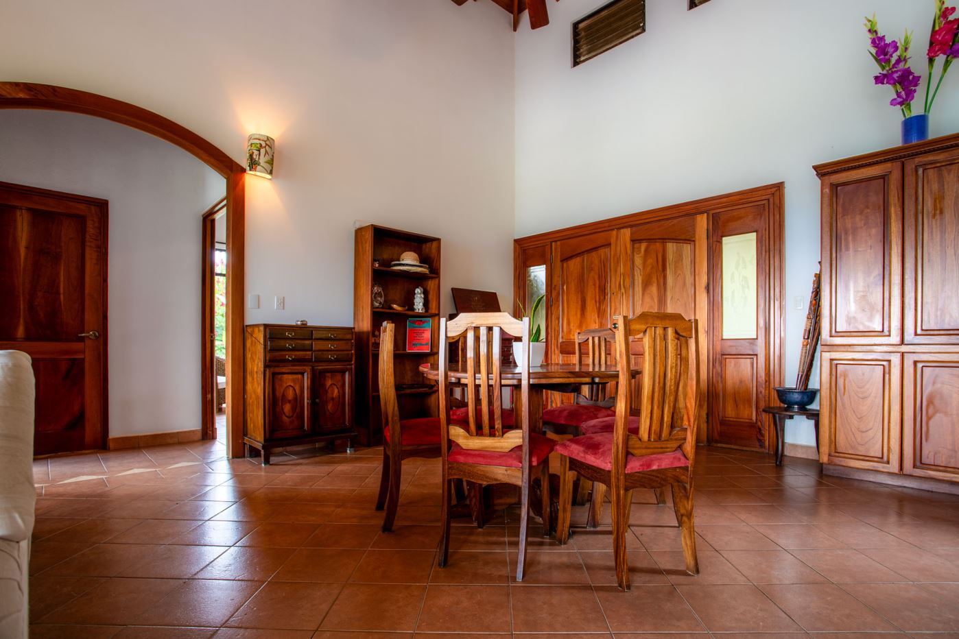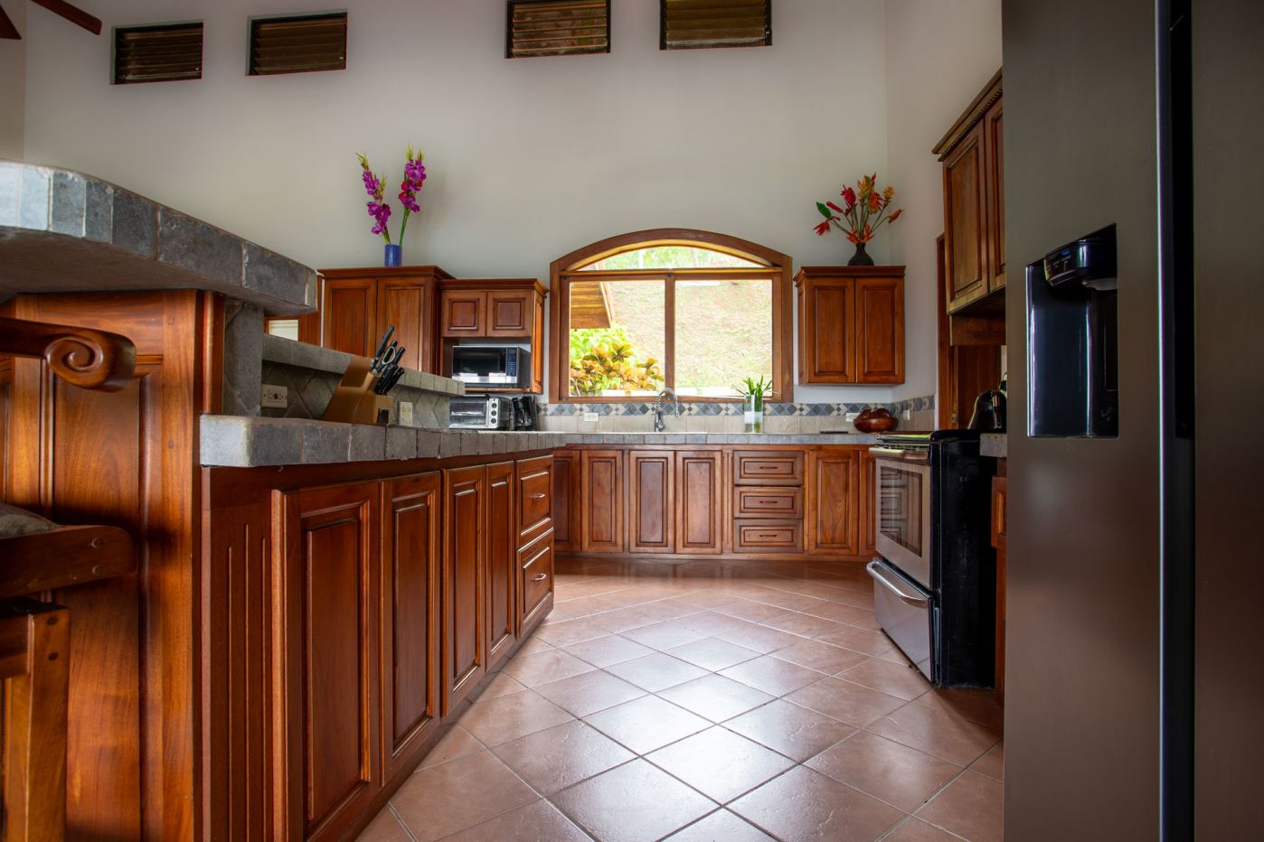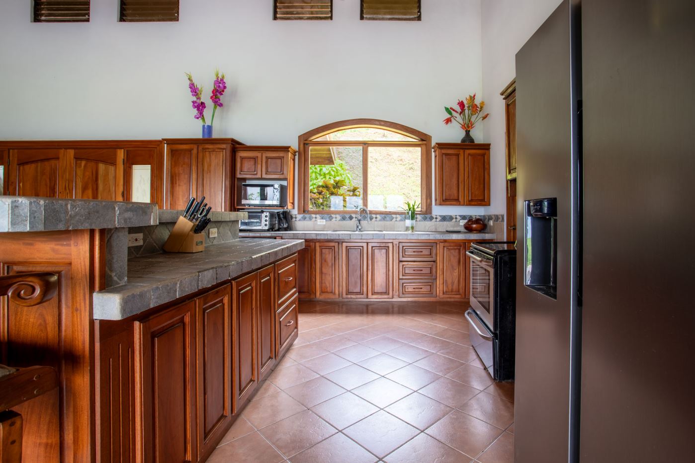 Elegant Spanish colonial style home with views in Hacienda Atenas is located just about eight minutes from Atenas Center and sits perched atop a resdential hill with amazing panoramic views of the area mountains and surrounded by nature. There is plenty of elbow room between the nieghbors in a secure and private setting with a nice size yard ideal for added builds or space available for a pool. The elegant entry into the home feautures tall cathedral ceilings with artesenal woodwork throughout. This space leads to two guest rooms and a guest bathroom, a small hallway leads to a guest half bath. On the opposite end of the guest rooms is a master bedroom suite. The large kitchen leads way to a laundry and secure storage area.