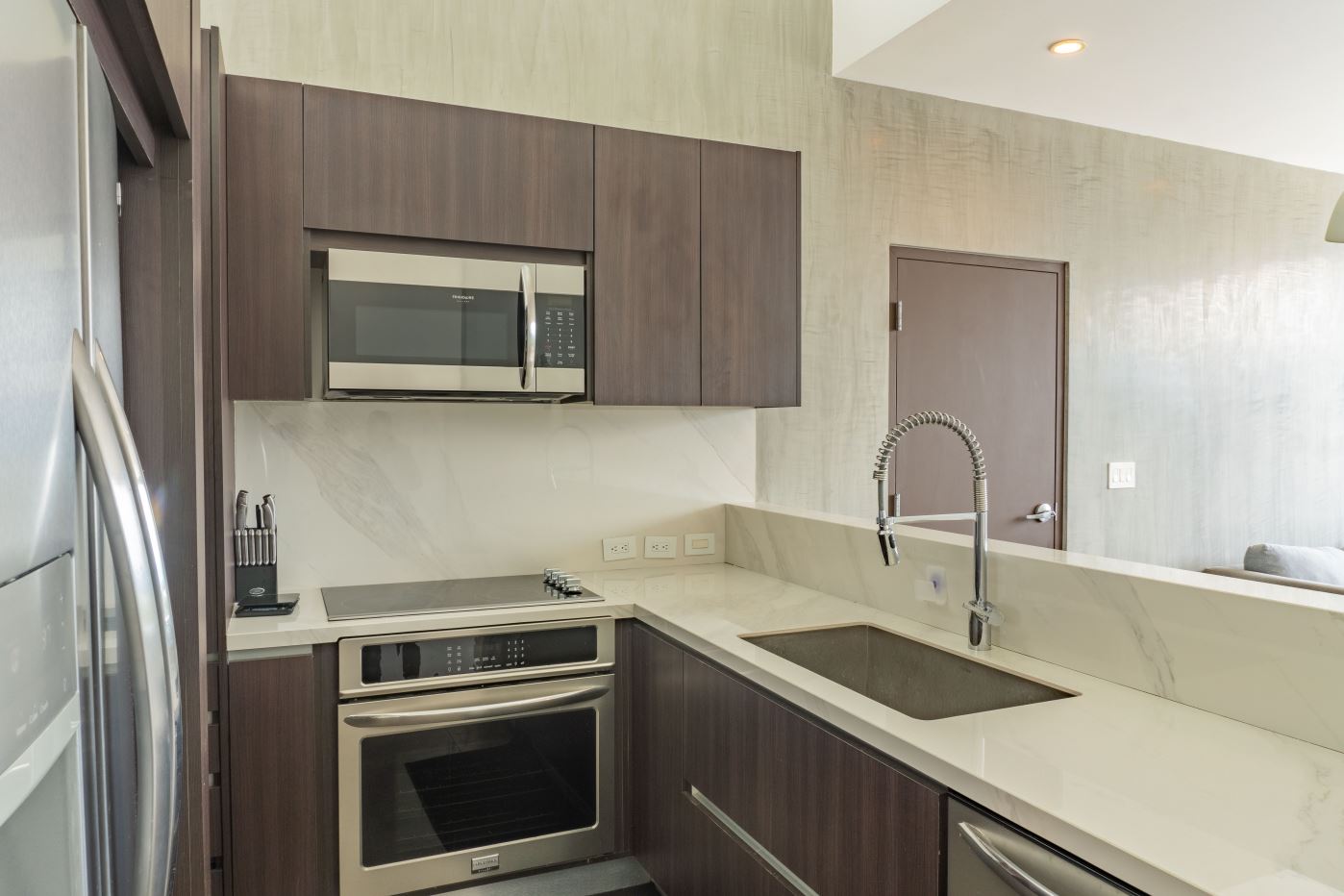 Cocina compacta con sobres de cuarzo, muebles de doble altura y electrodomésticos empotrados de alta gama