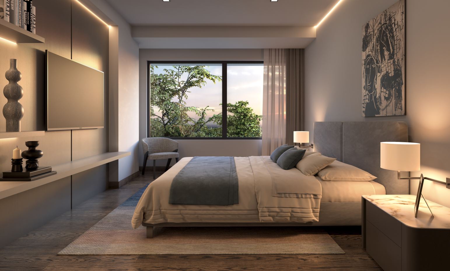 Los apartamentos ofrecen un diseño moderno y elegante. Con grandes ventanales que permiten la entrada de luz natural. La cocina moderna de concepto abierto se integra con las áreas comunes, creando un ambiente funcional.