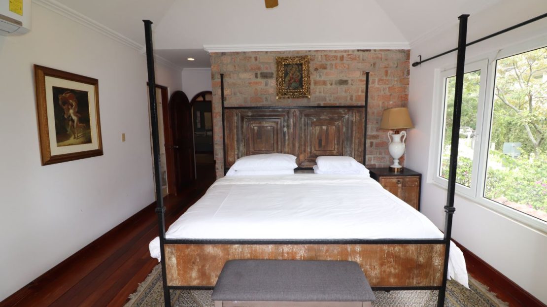 En la planta superior, pasando por un techo abovedado decorado, se encuentran los espacios privados con tres habitaciones bien diseñadas. La suite principal ofrece un refugio sereno con amplio espacio, luz natural, un hermoso muro de ladrillo, balcón y ventanales que permiten disfrutar de vistas espectaculares. El baño principal es moderno y cuenta con lavamanos dobles. Las habitaciones adicionales son perfectas para familiares, invitados o incluso una oficina en casa. Dos baños completos sirven el nivel superior, complementados por un medio baño en el nivel principal.