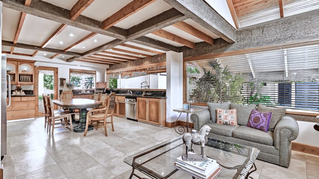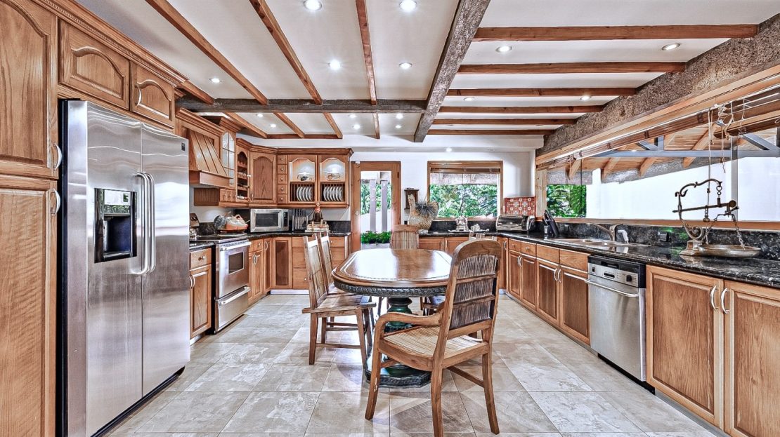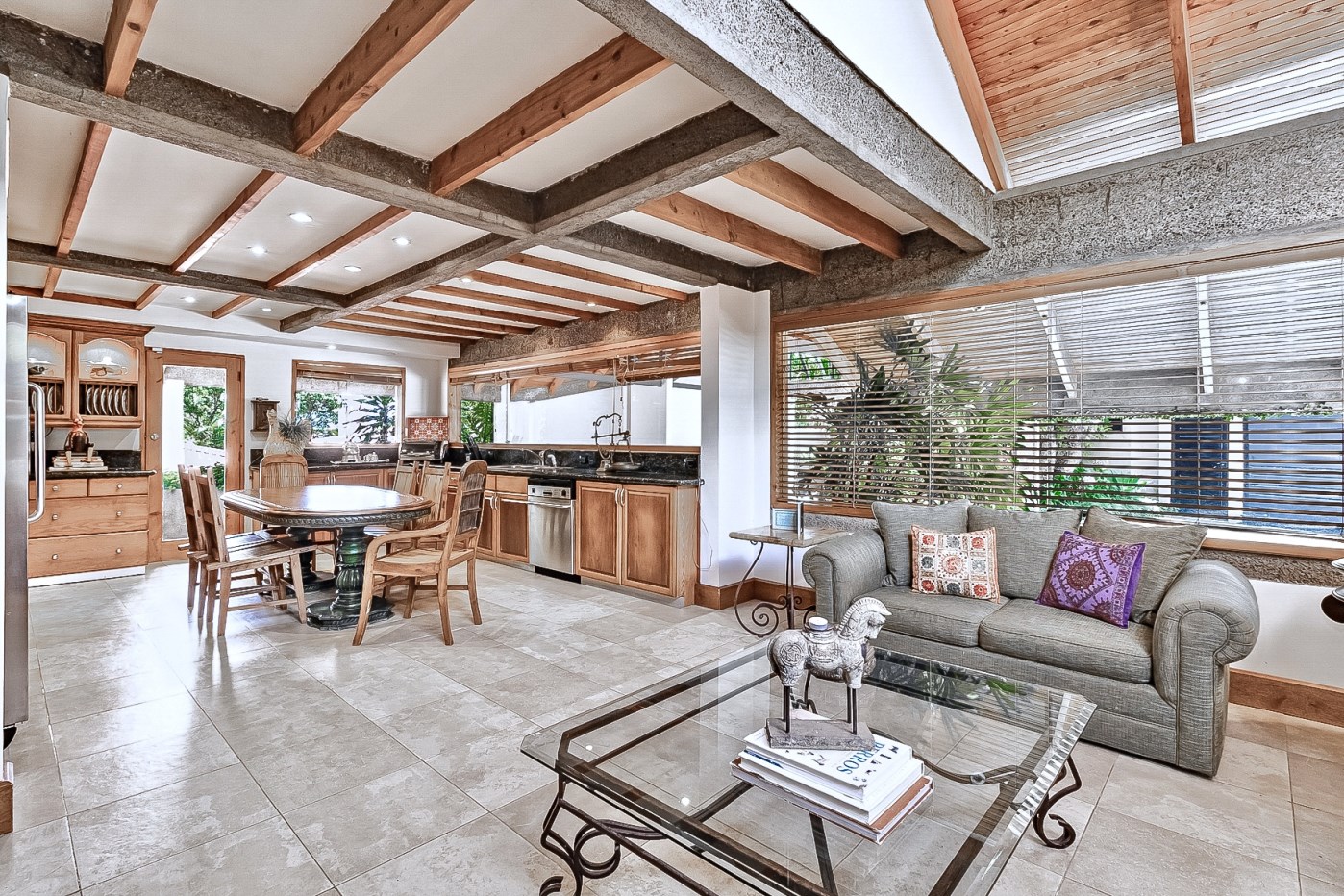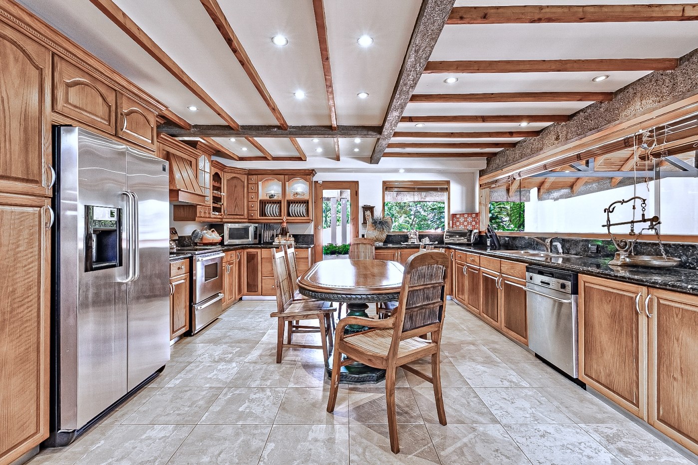 Boasting a lounge area with ample space for cooking and dining, integrated with ample wood cabinetry for storage, black granite counter tops, both wood and concrete beams, this kitchen makes cooking, socializing and lounging all in one a super Cozy experience!