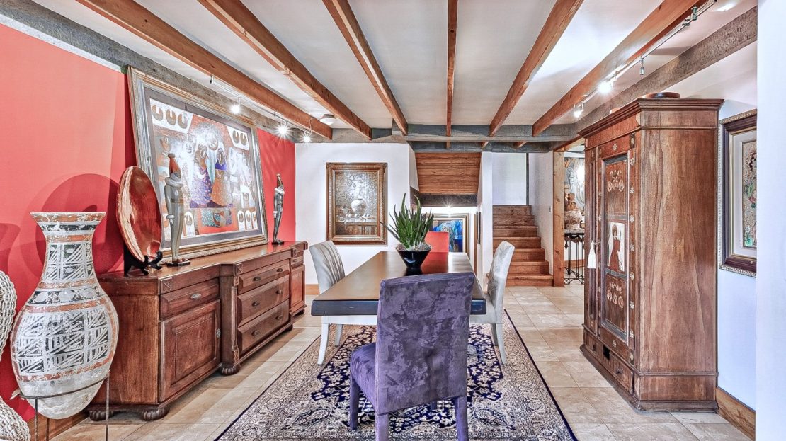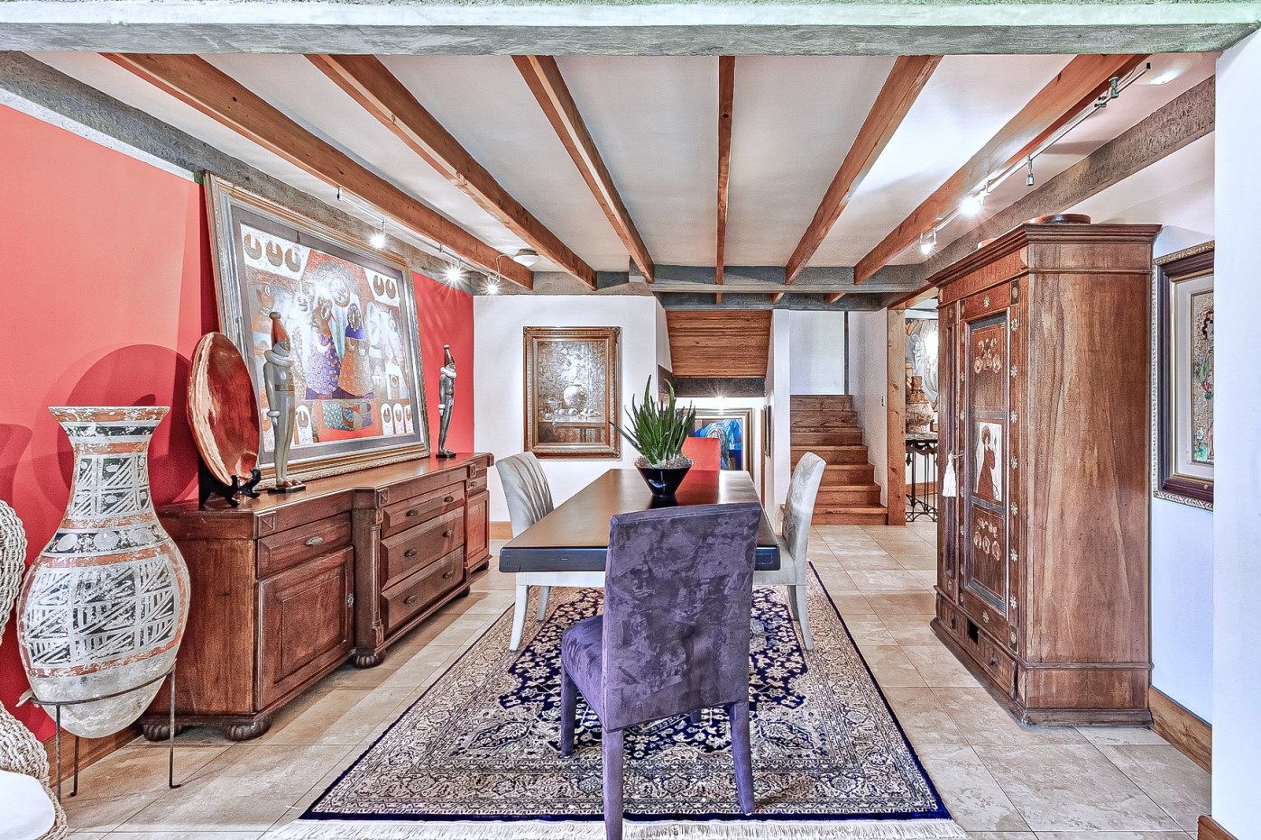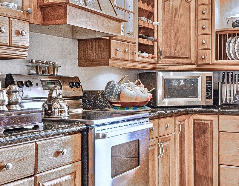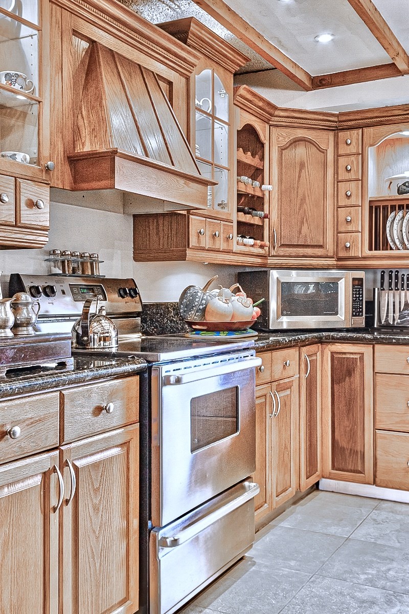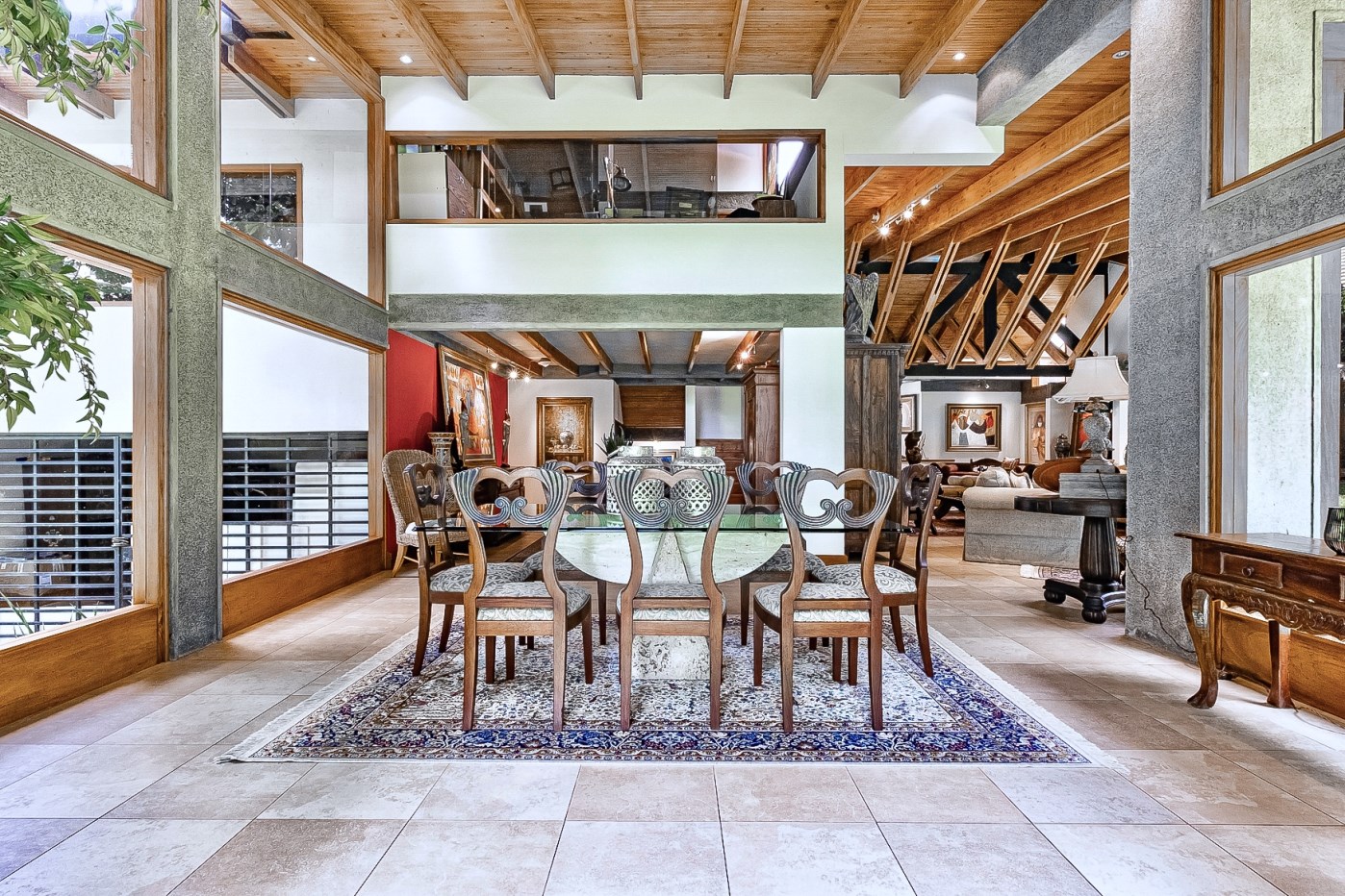 Boasting a lounge area with ample space for cooking and dining, integrated with ample wood cabinetry for storage, black granite counter tops, both wood and concrete beams, this kitchen makes cooking, socializing and lounging all in one a super Cozy experience!
