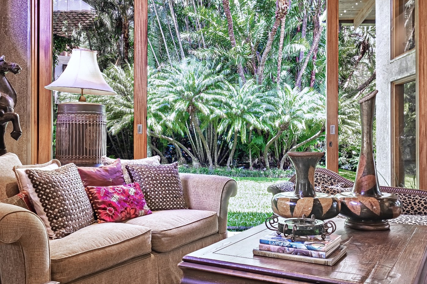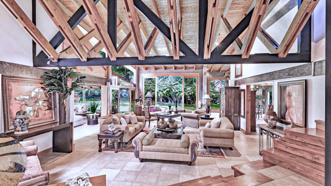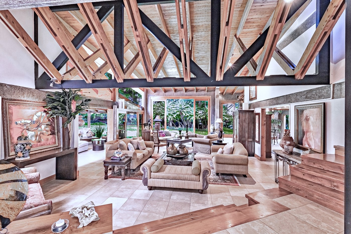 The moment you enter the home, you get this rushing feeling that you just transported to a tropical oasis. All the natural elements of both rugged concrete molding & beams, wood & metal beams that are integrated with wood plank ceilings to the tropical gardens mixed with a variety of palms that you see through the tall glass doors, brings an ambience of residing on a tropical island.